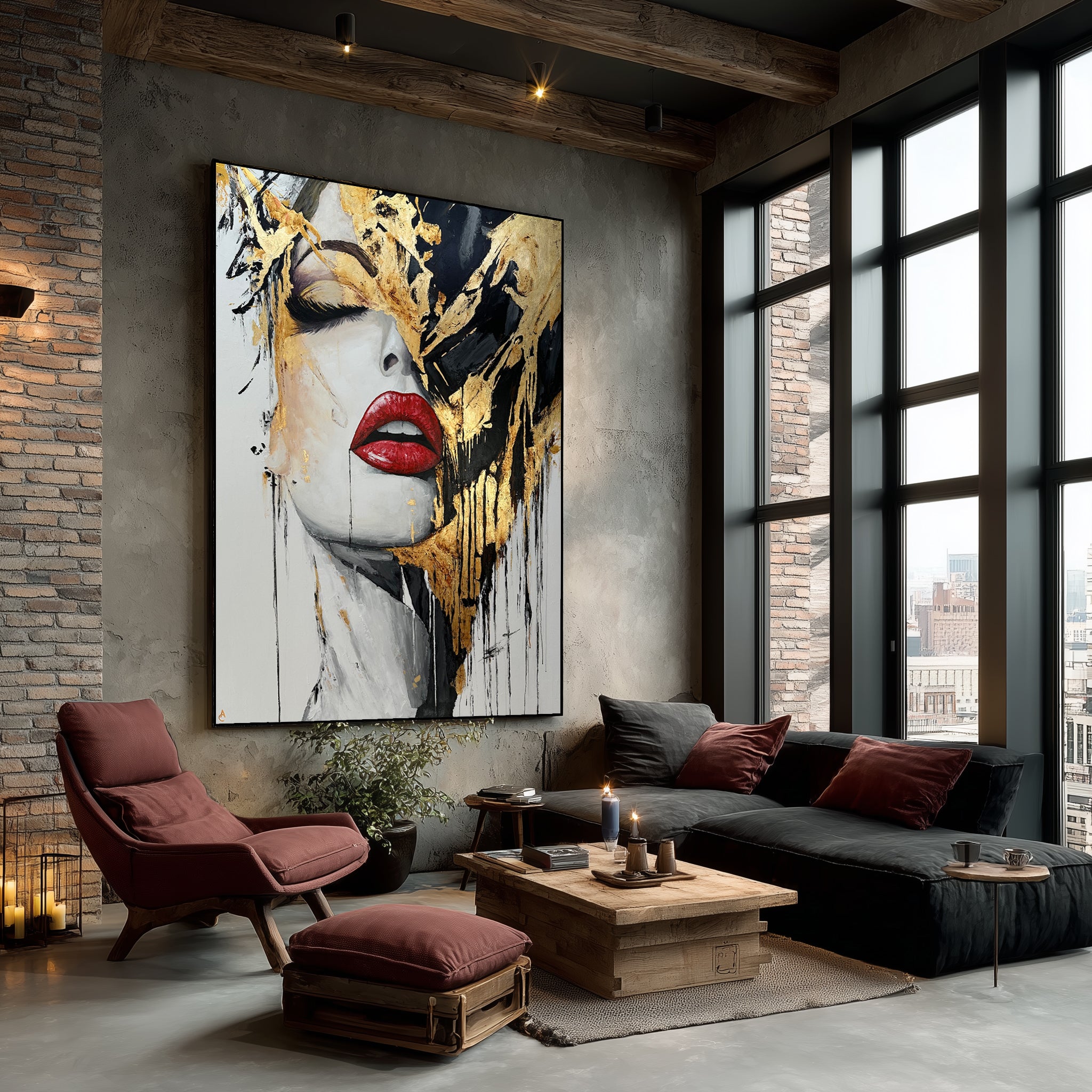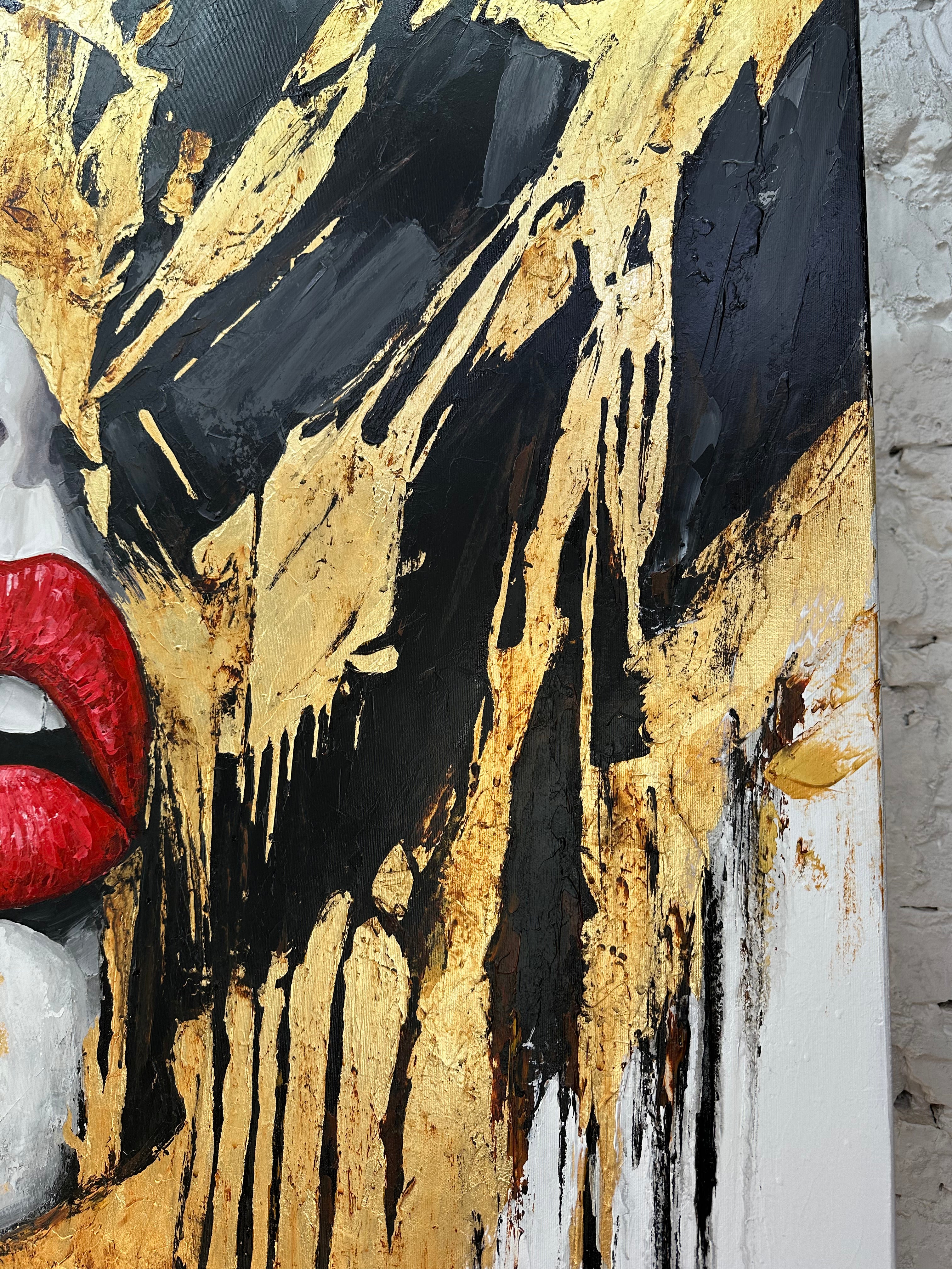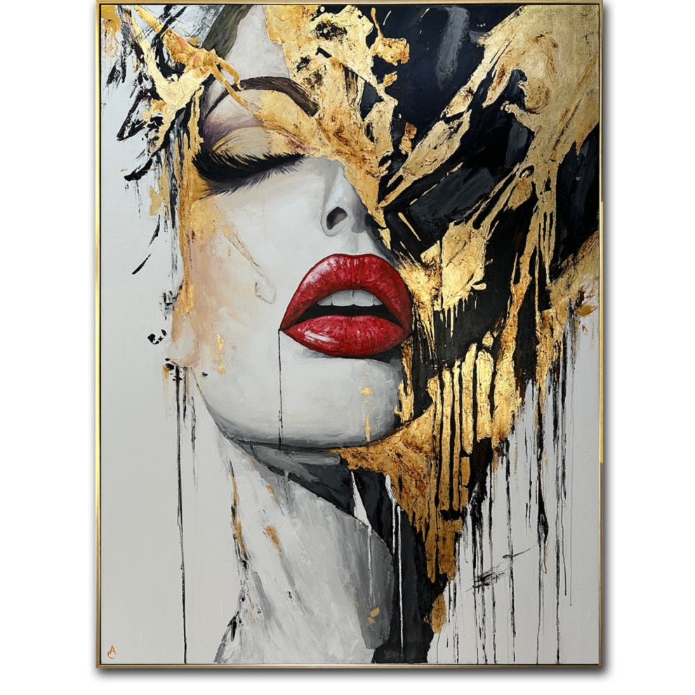 Abstract Female Face Portrait Red Lips Black and White Gold Leaf Art Luxury Decor | CRIMSON KISS | Trend Gallery Art Great Britain – Trendgallery.co.uk