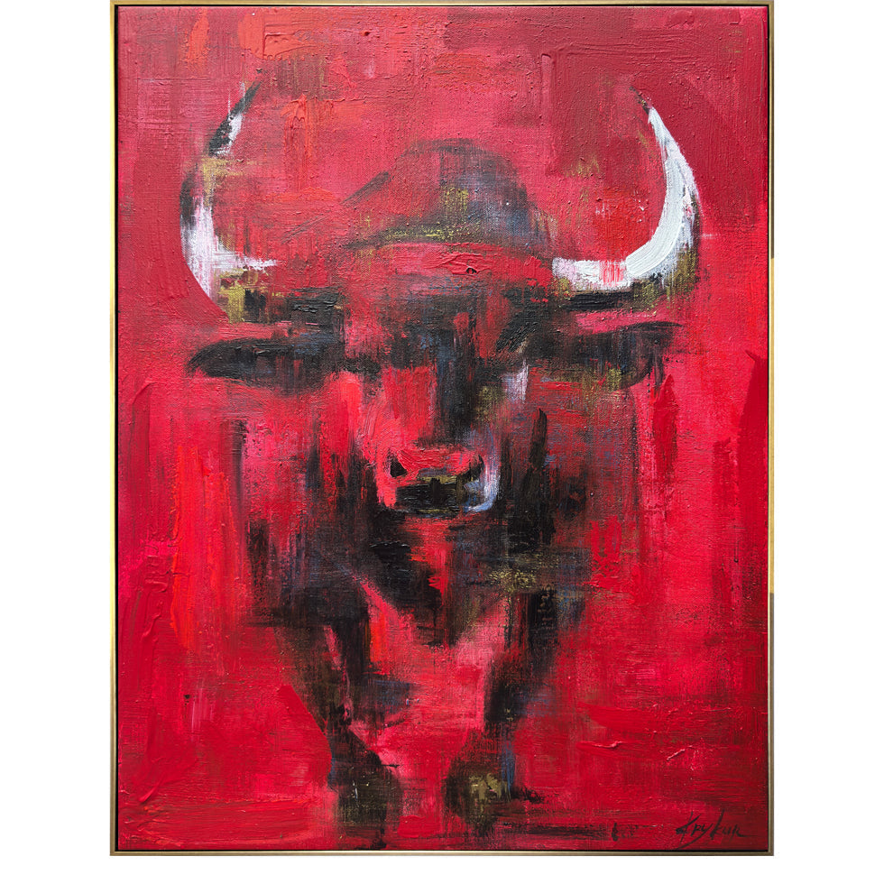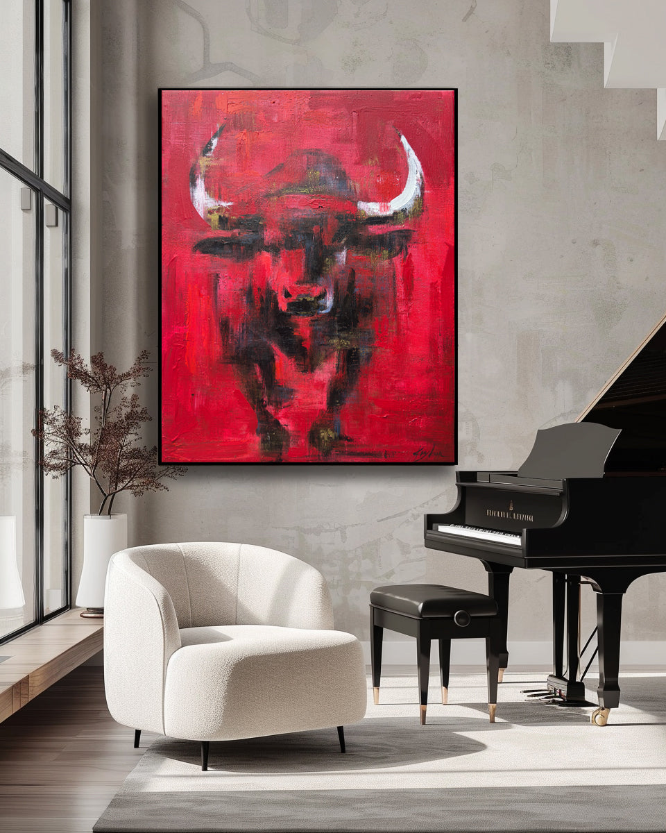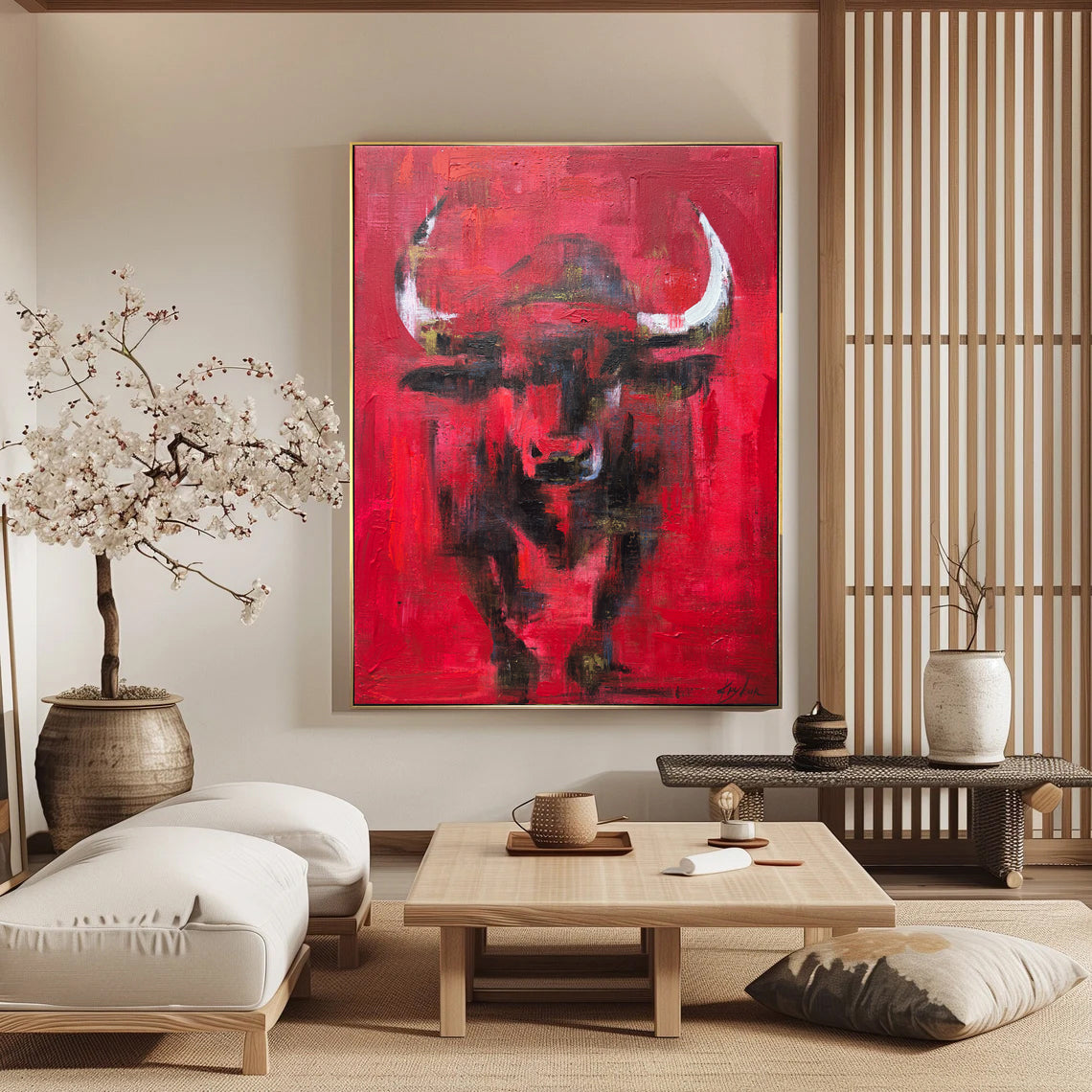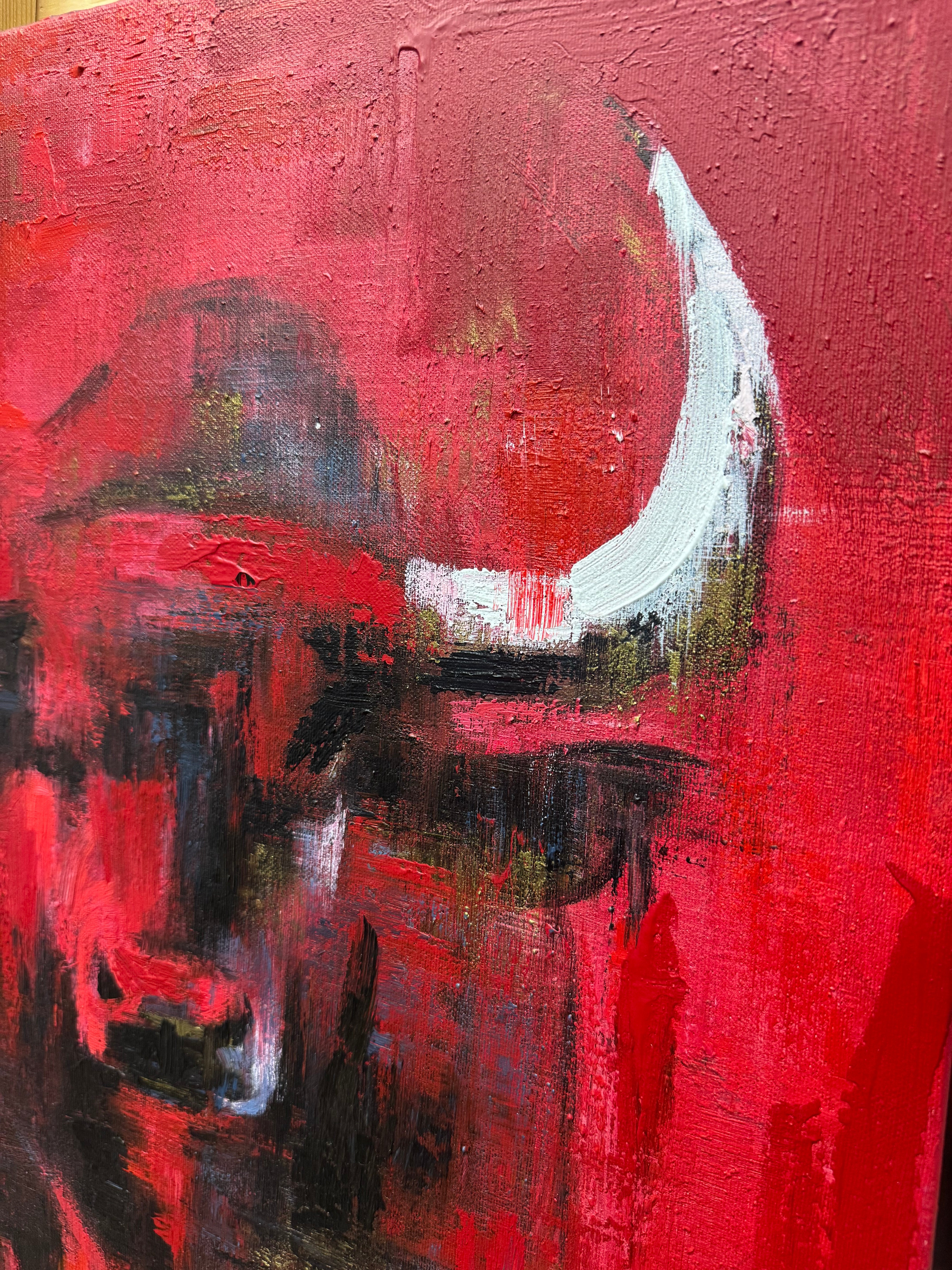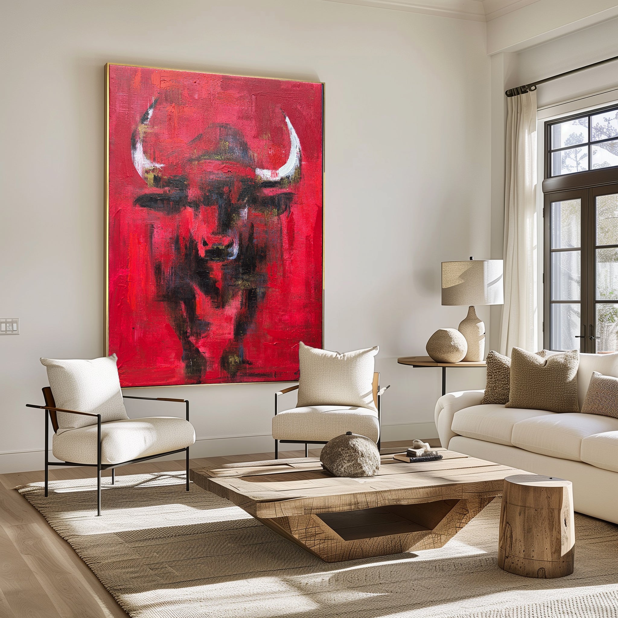 Abstract Red Bull Painting Bold Taurus Head on Crimson Canvas Textured Animal Portrait Art Modern Western Painting for Home Wall Decor | CHARGING THROUGH | Trend Gallery Art Great Britain – Trendgallery.co.uk