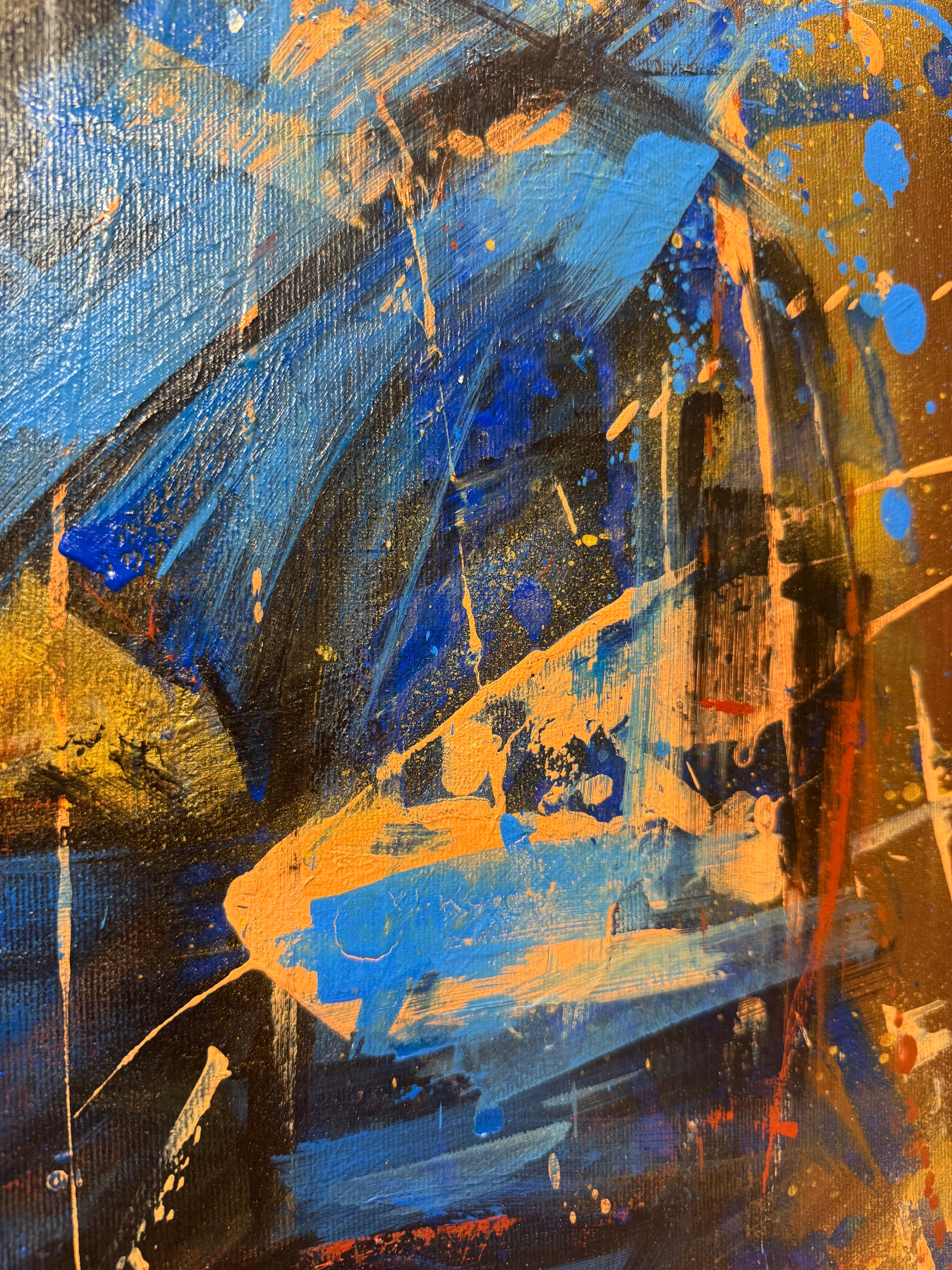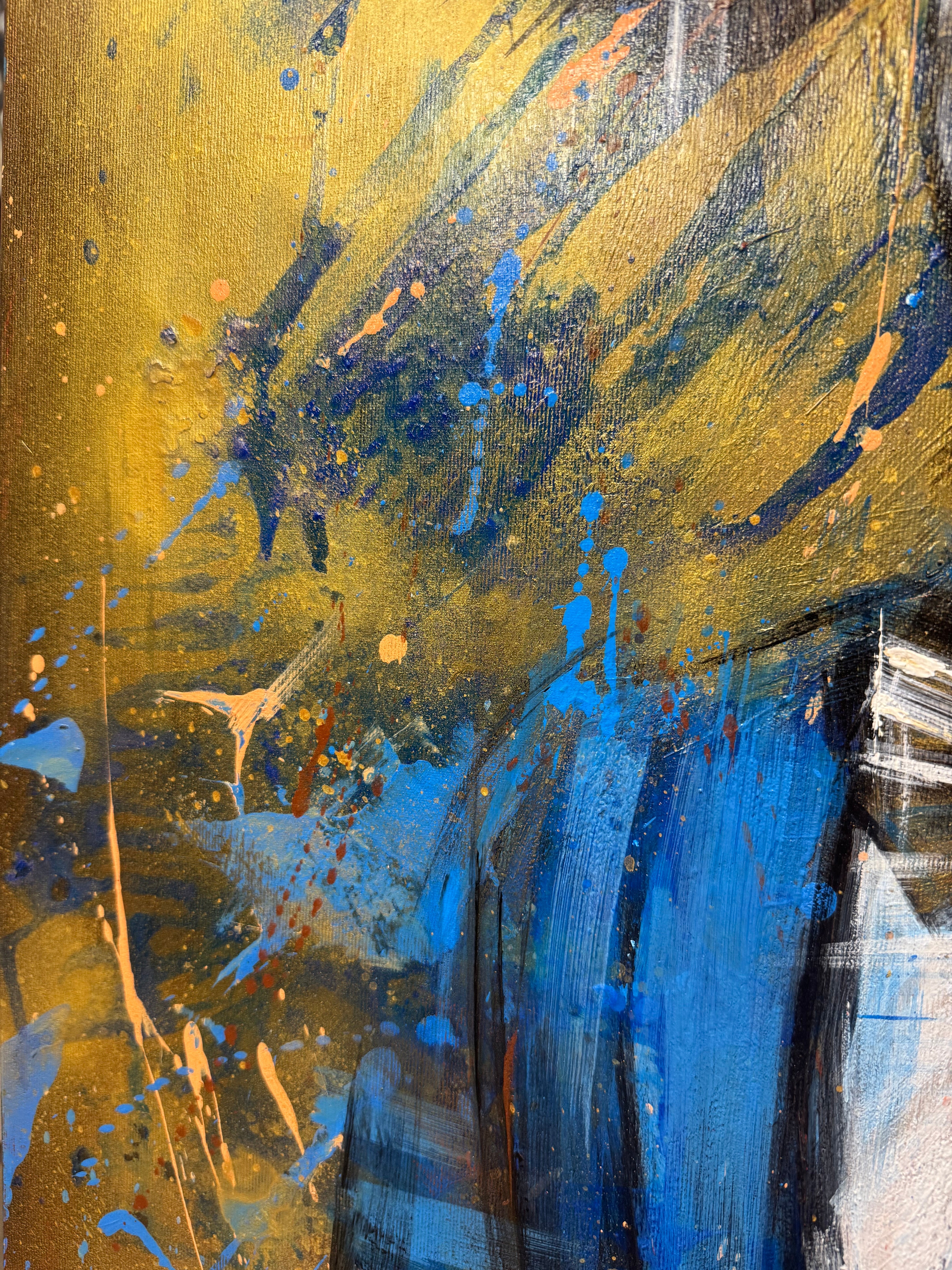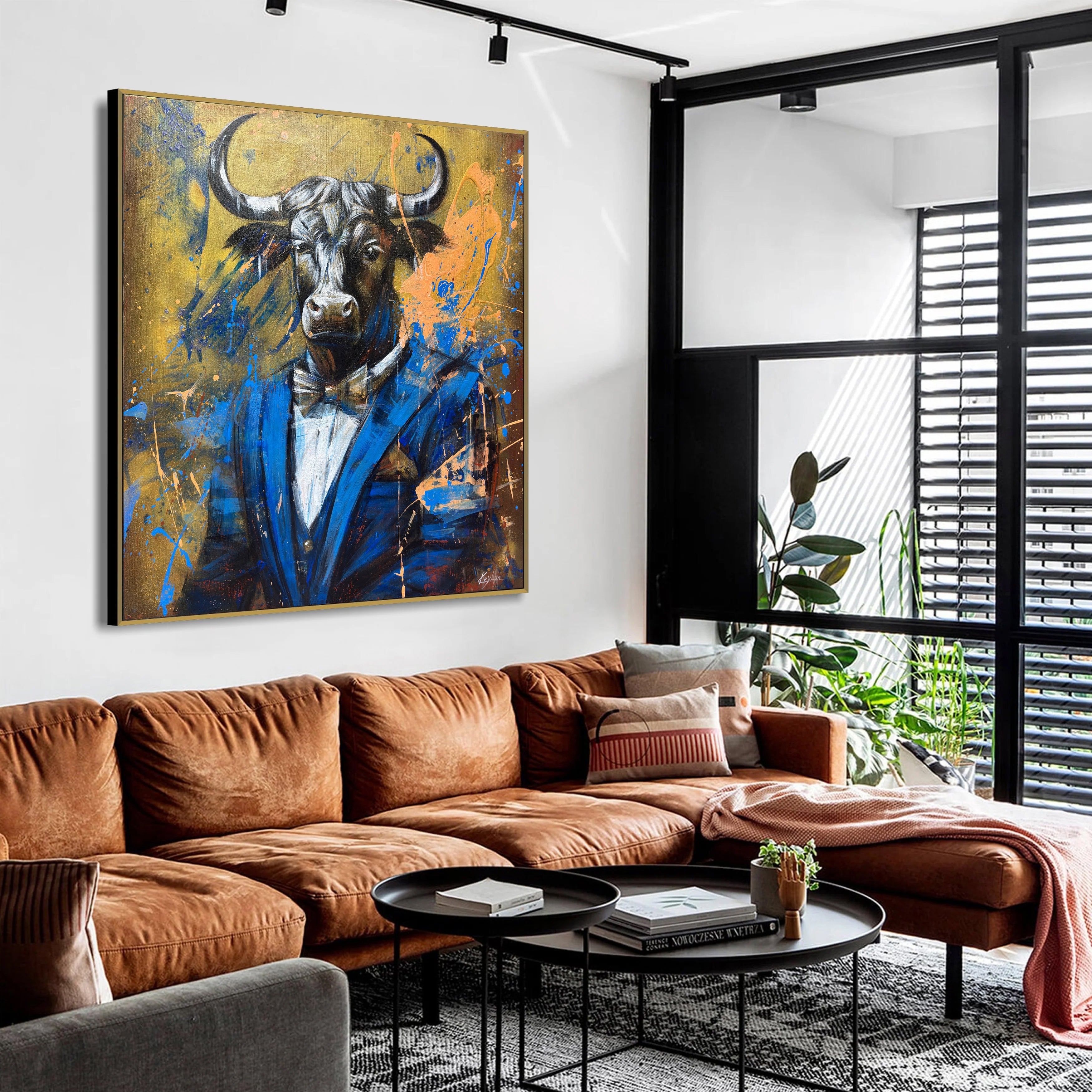 Dapper Bull Pop Art Painting Blue Suit Animal Portrait on Gold Splatter Art Modern Western Painting on Canvas Modern Statement Wall Decor | DAPPER OX | Trend Gallery Art Great Britain – Trendgallery.co.uk