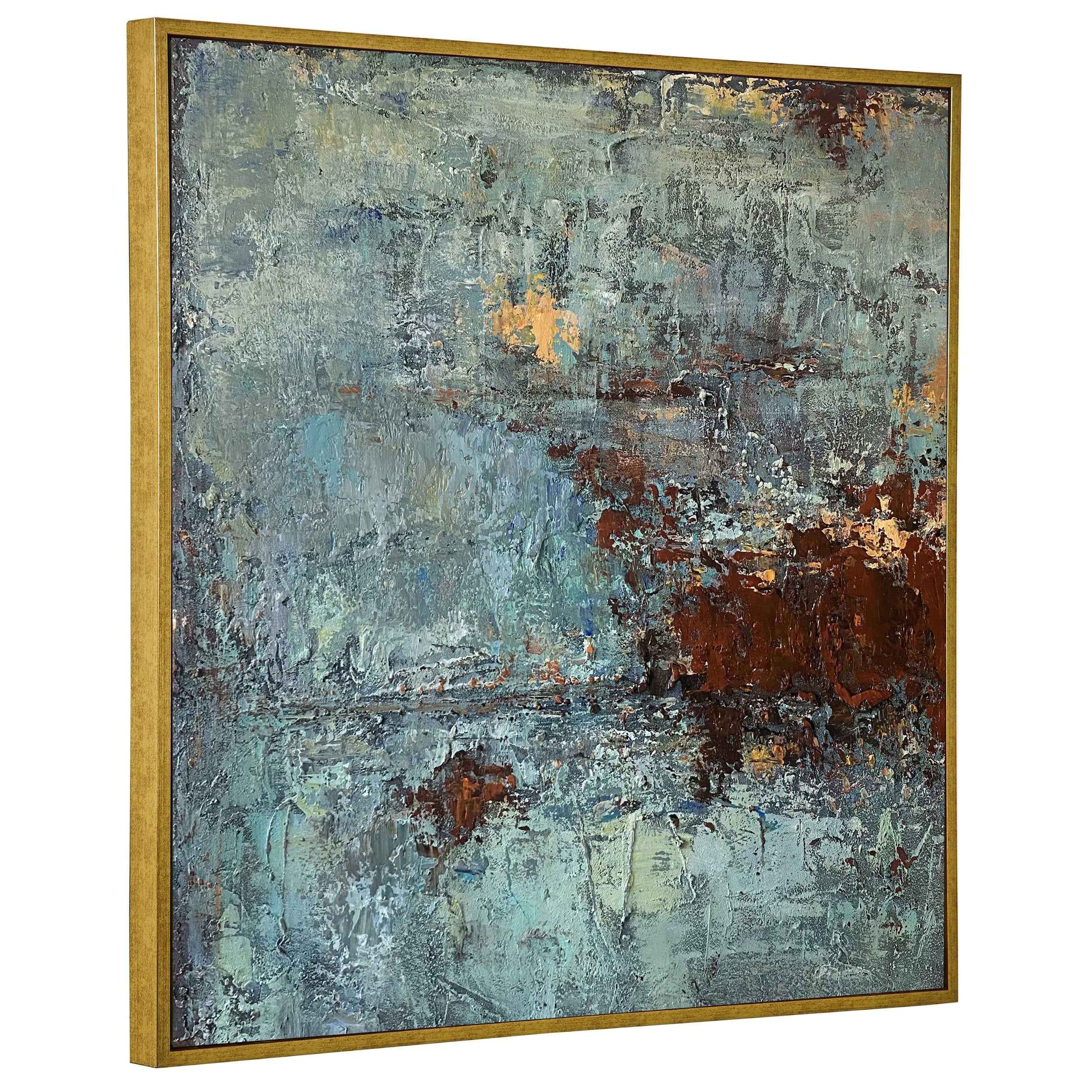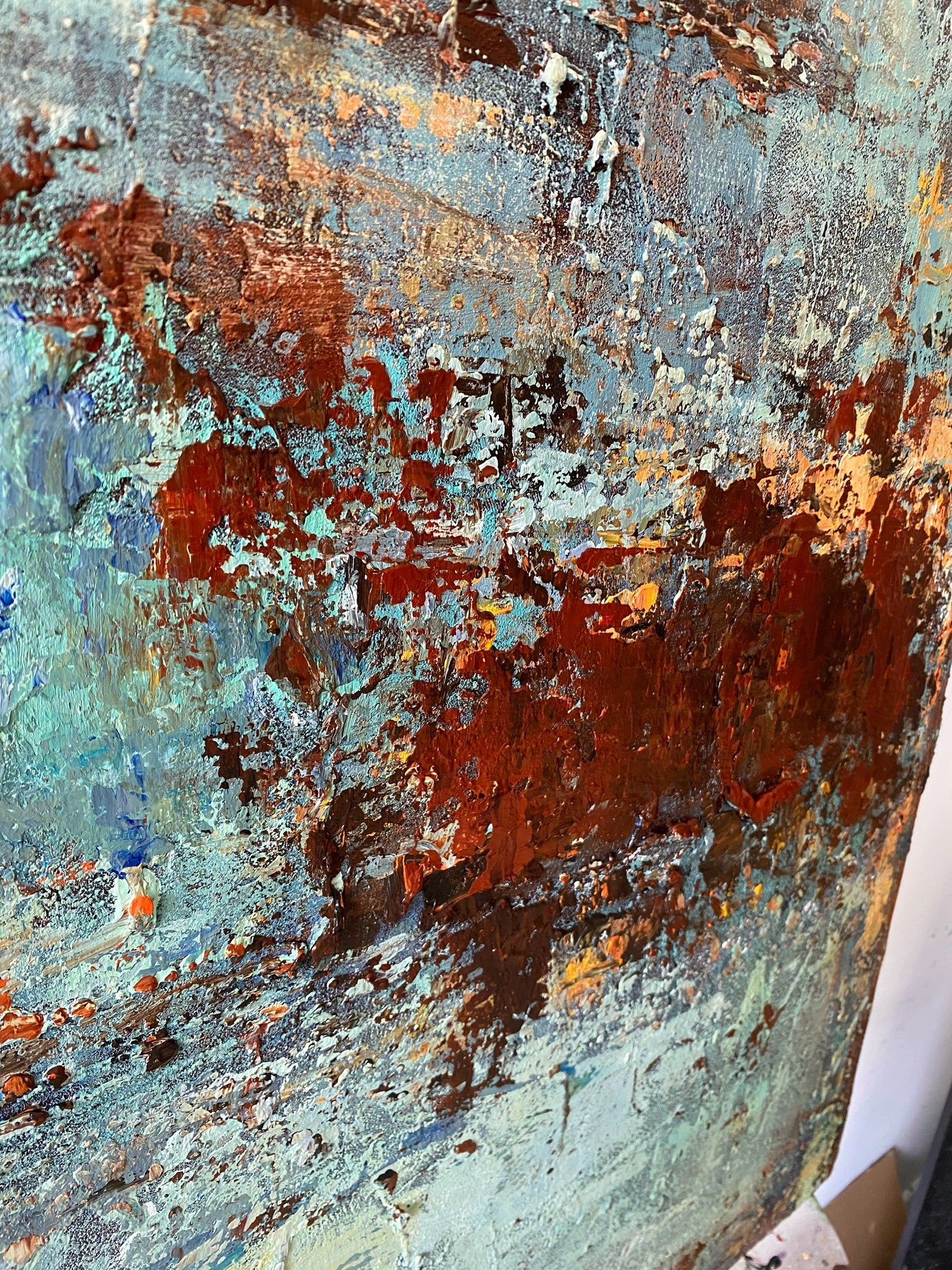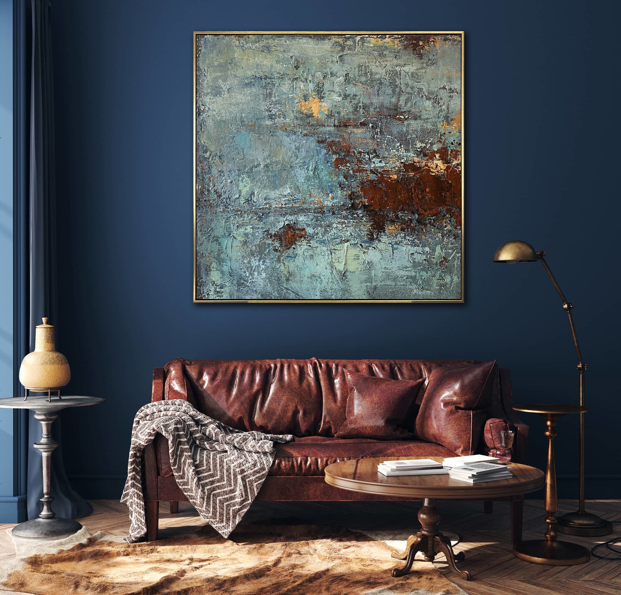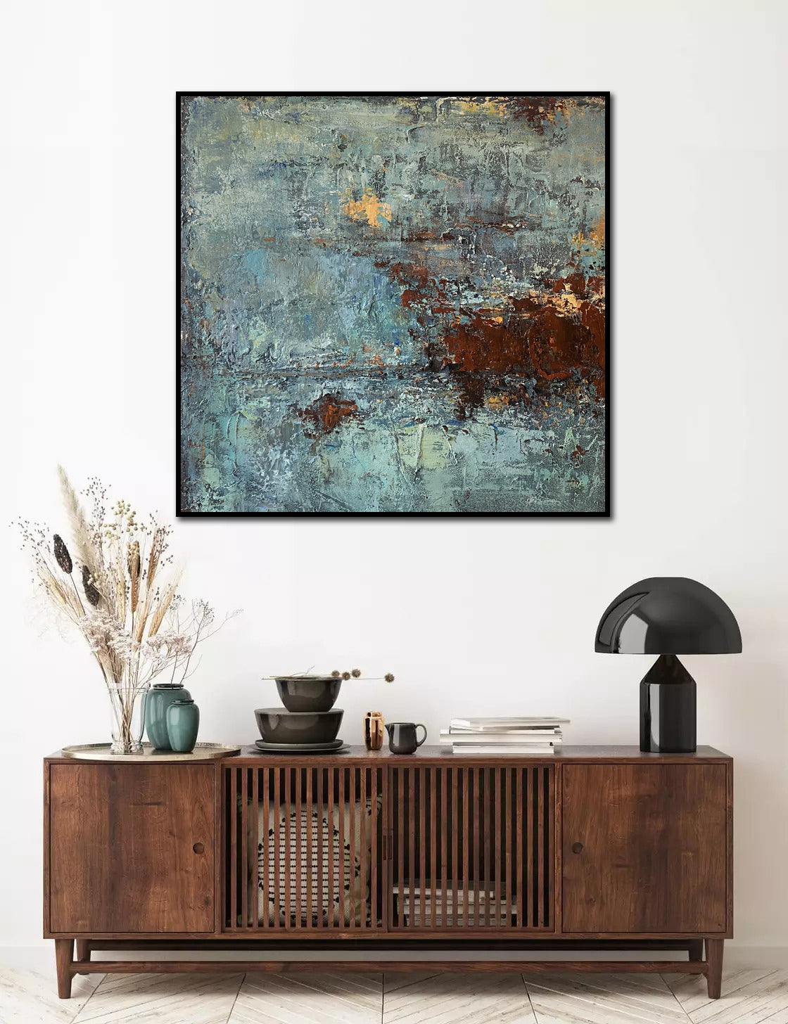 Bring coastal-industrial elegance to your space with this textured teal abstract. Rich impasto layers in aqua, turquoise and slate are contrasted with warm rust and copper, creating a refined patina, like weathered metal by the sea. The moody wabi-sabi vibe fits living rooms, bedrooms and offices. Hand-painted on canvas, available in custom sizes with optional gold floater frame. Ready to hang when stretched or shipped rolled. Color tweaks welcome—add gallery-level depth and character.