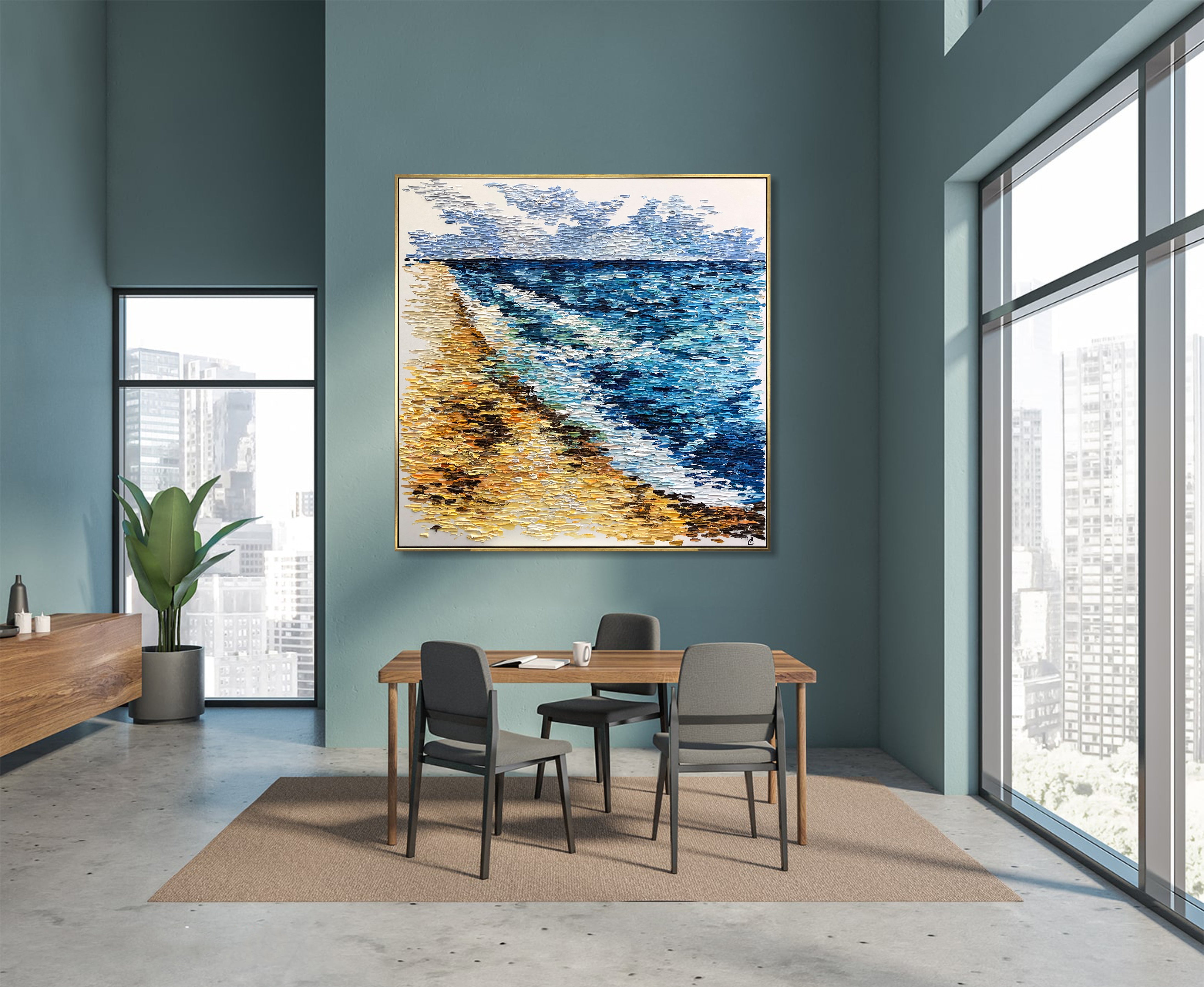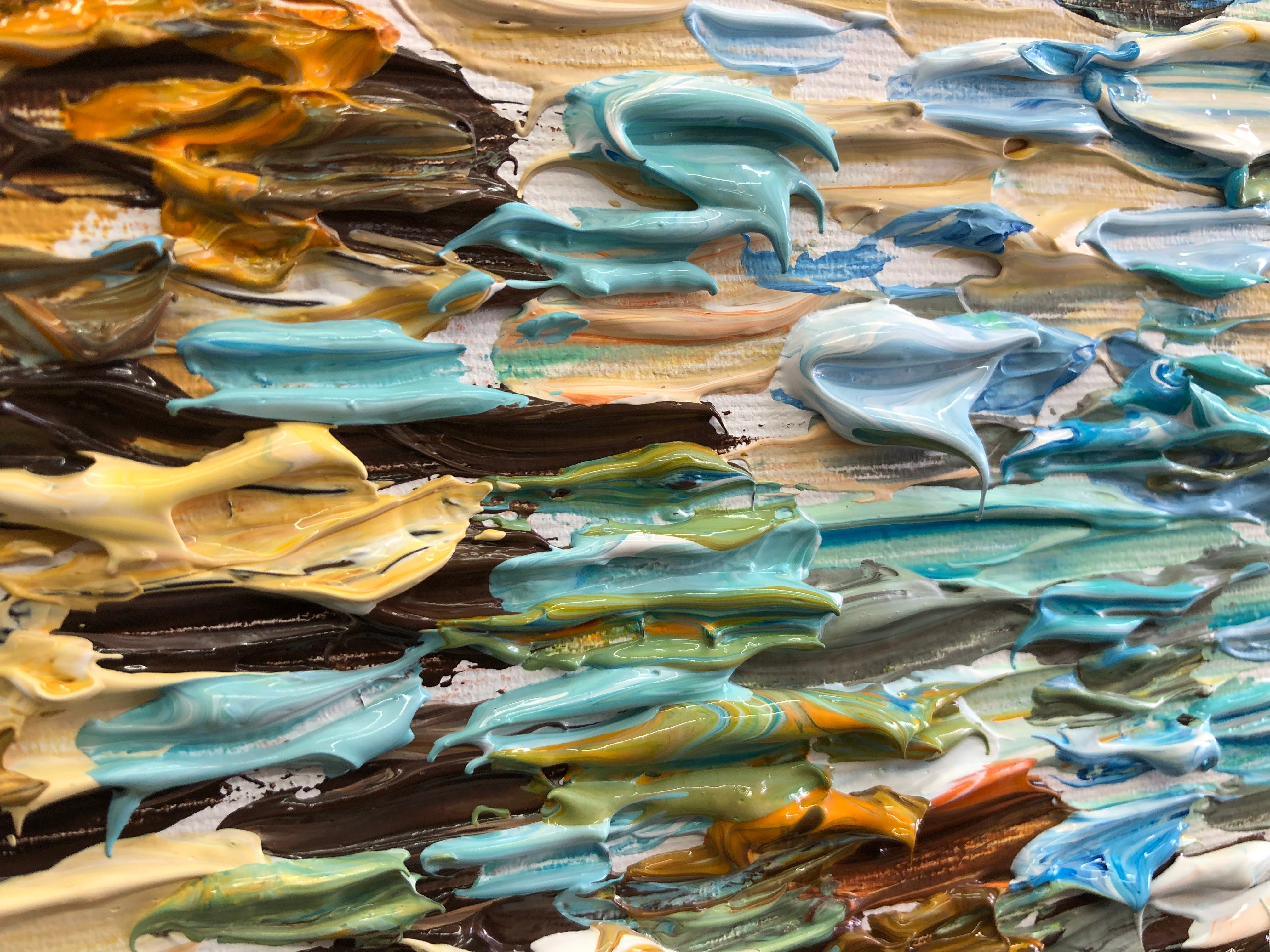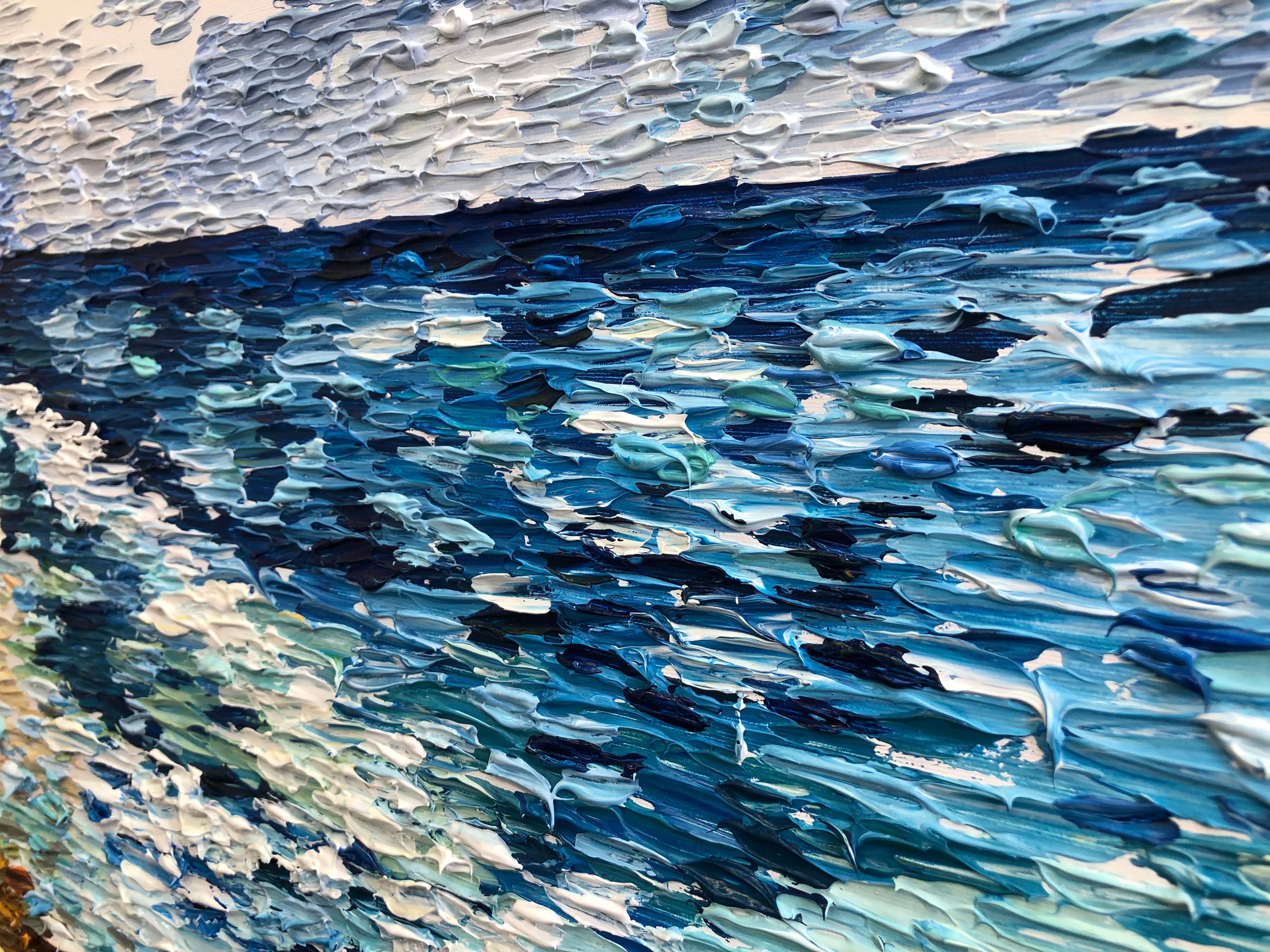 The upper half is a swirling mix of blues and greens, creating a sense of movement and energy, evoking the vastness and power of the ocean. The whitecaps of breaking waves are suggested by accents of white paint throughout the blue section.
