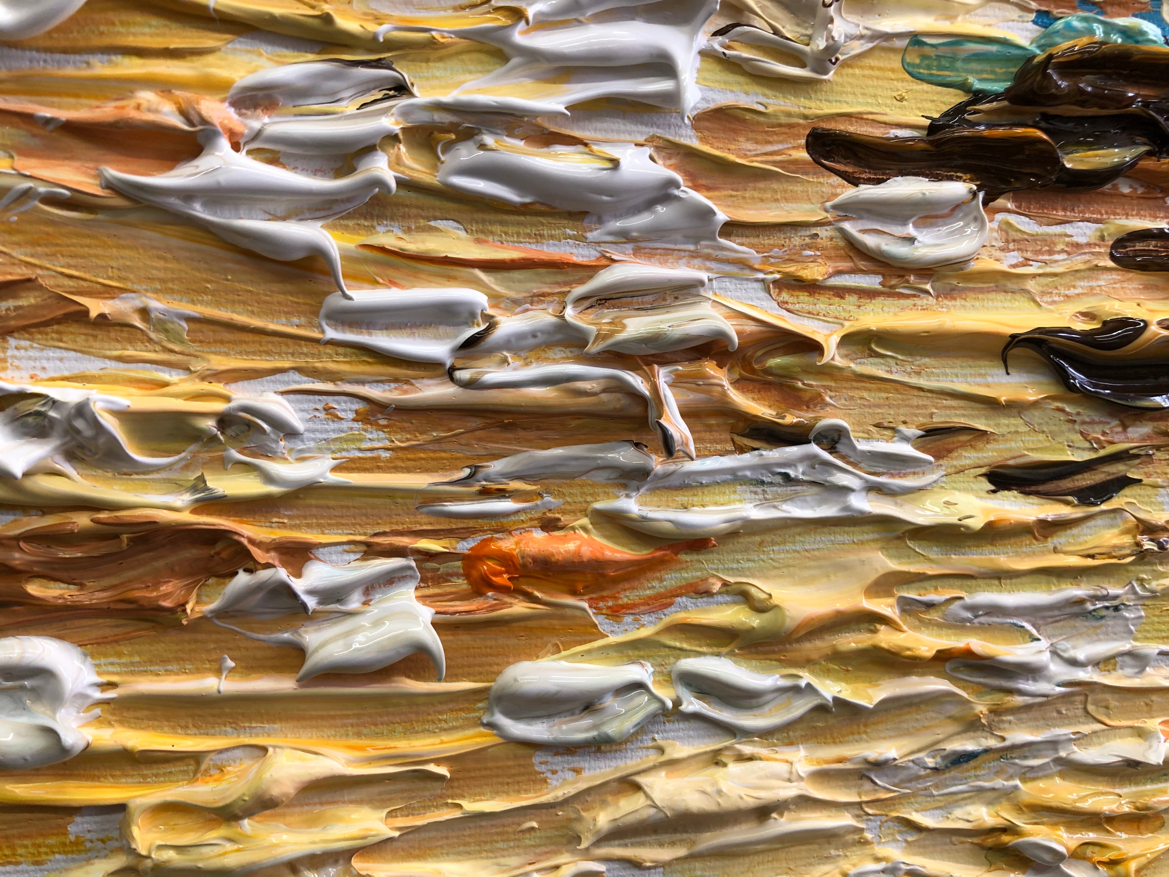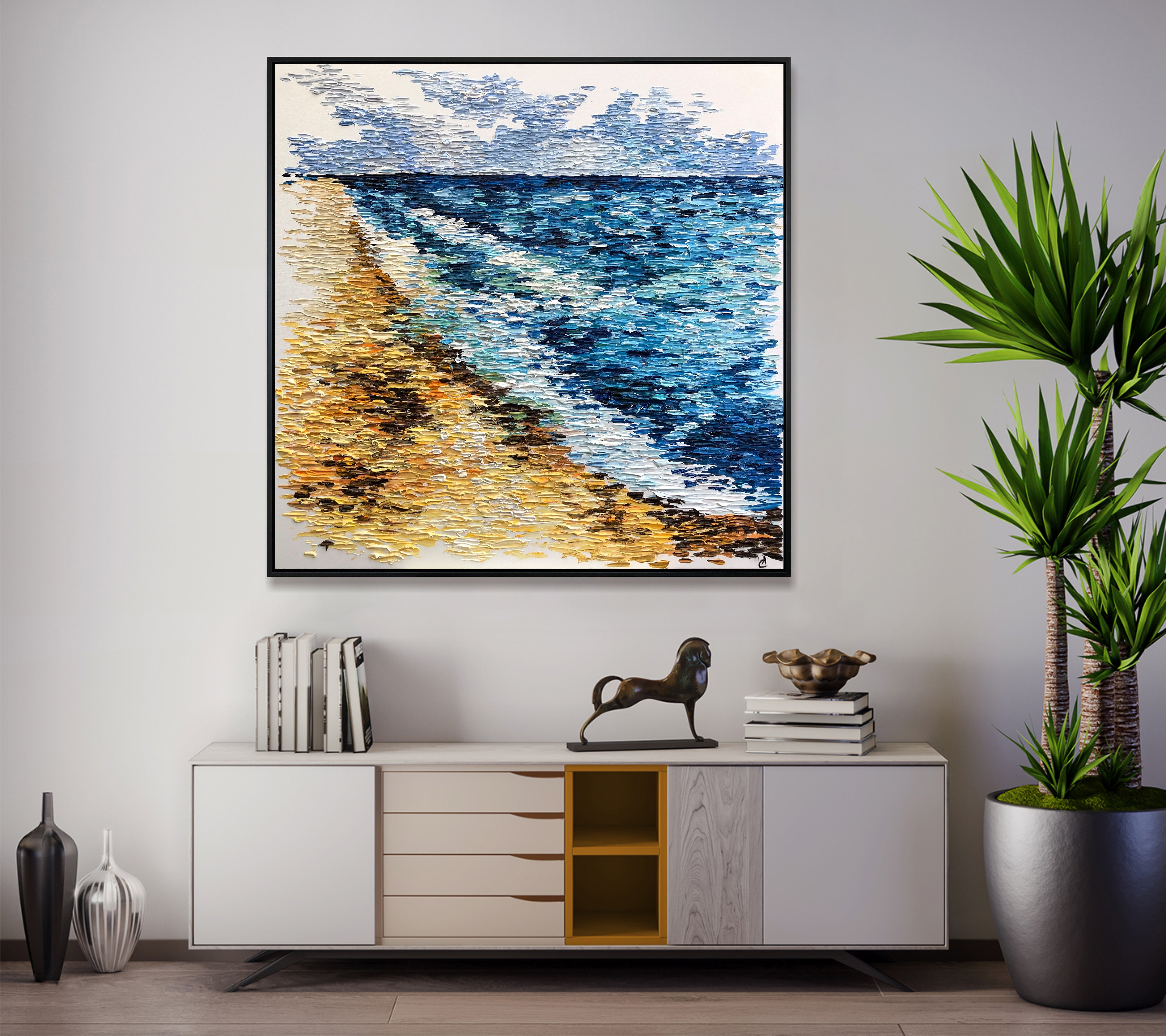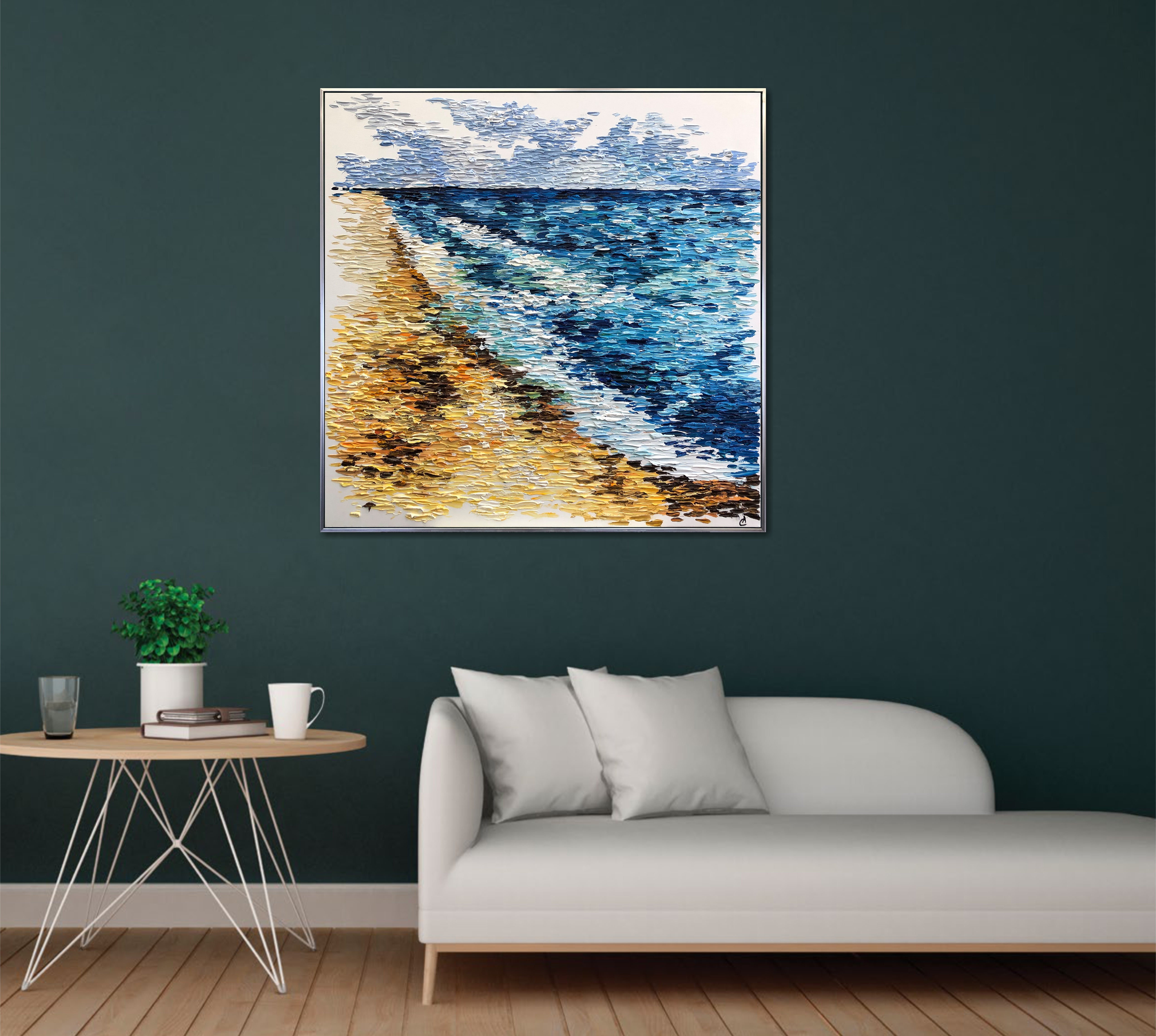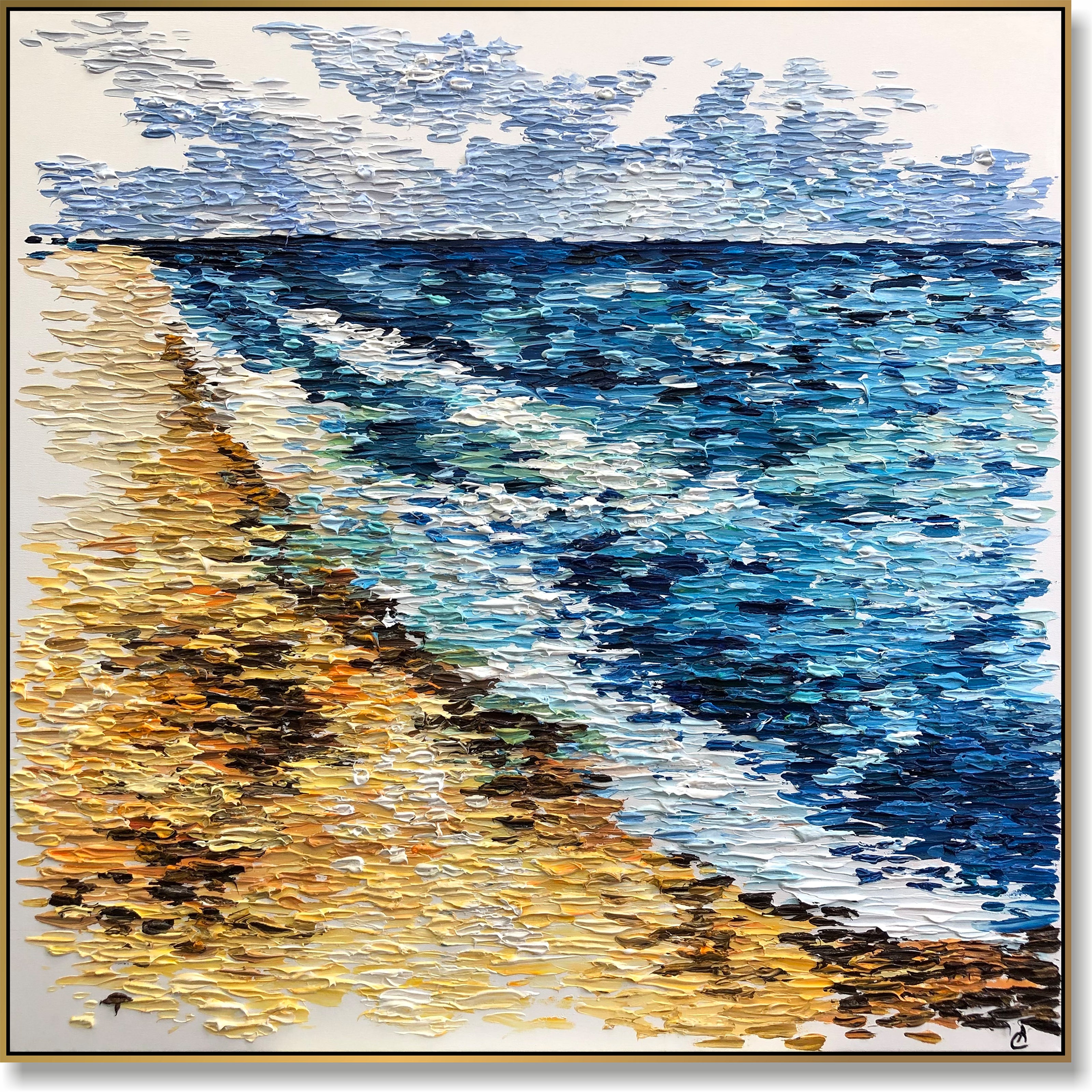 The upper half is a swirling mix of blues and greens, creating a sense of movement and energy, evoking the vastness and power of the ocean. The whitecaps of breaking waves are suggested by accents of white paint throughout the blue section.
