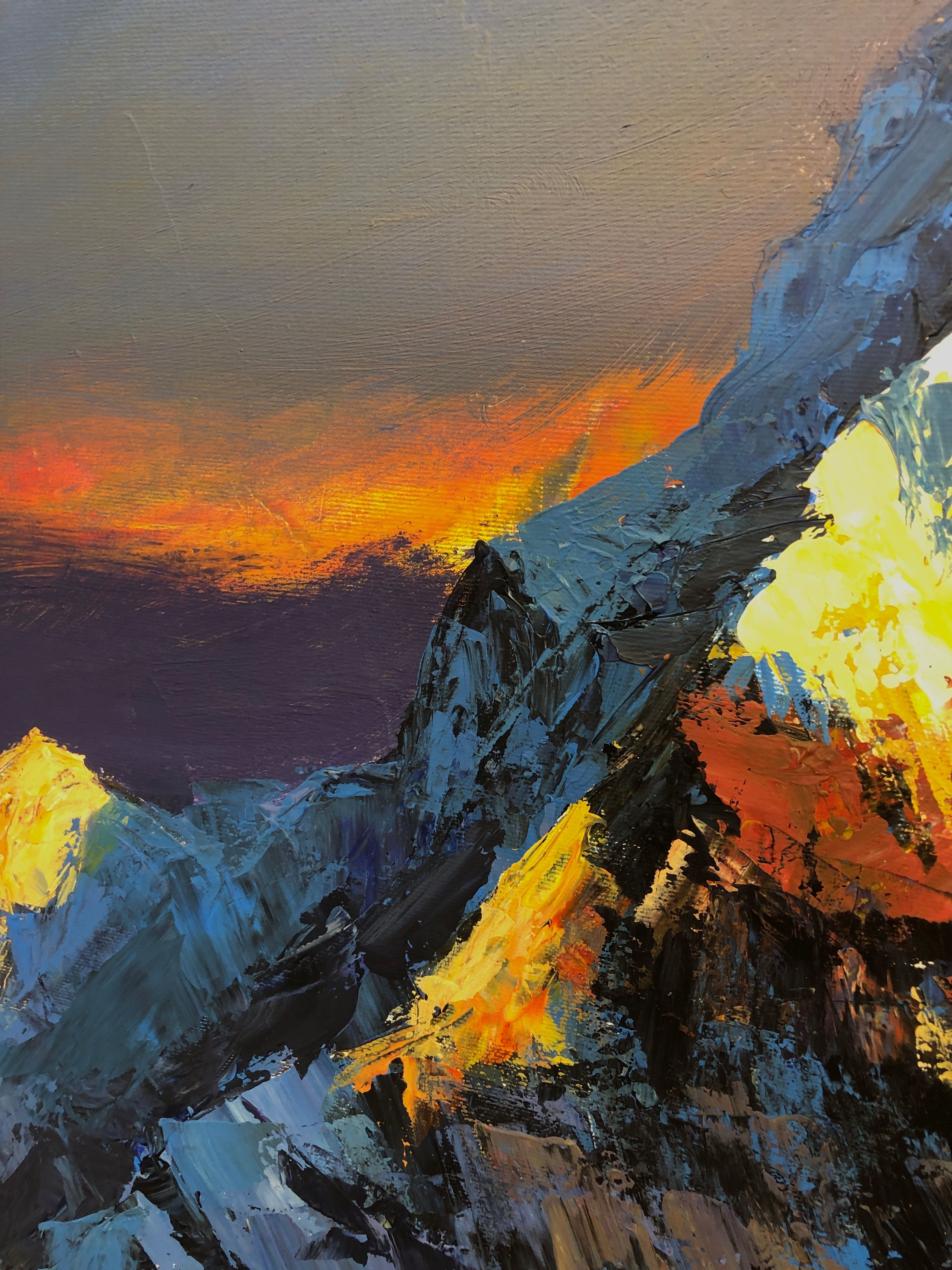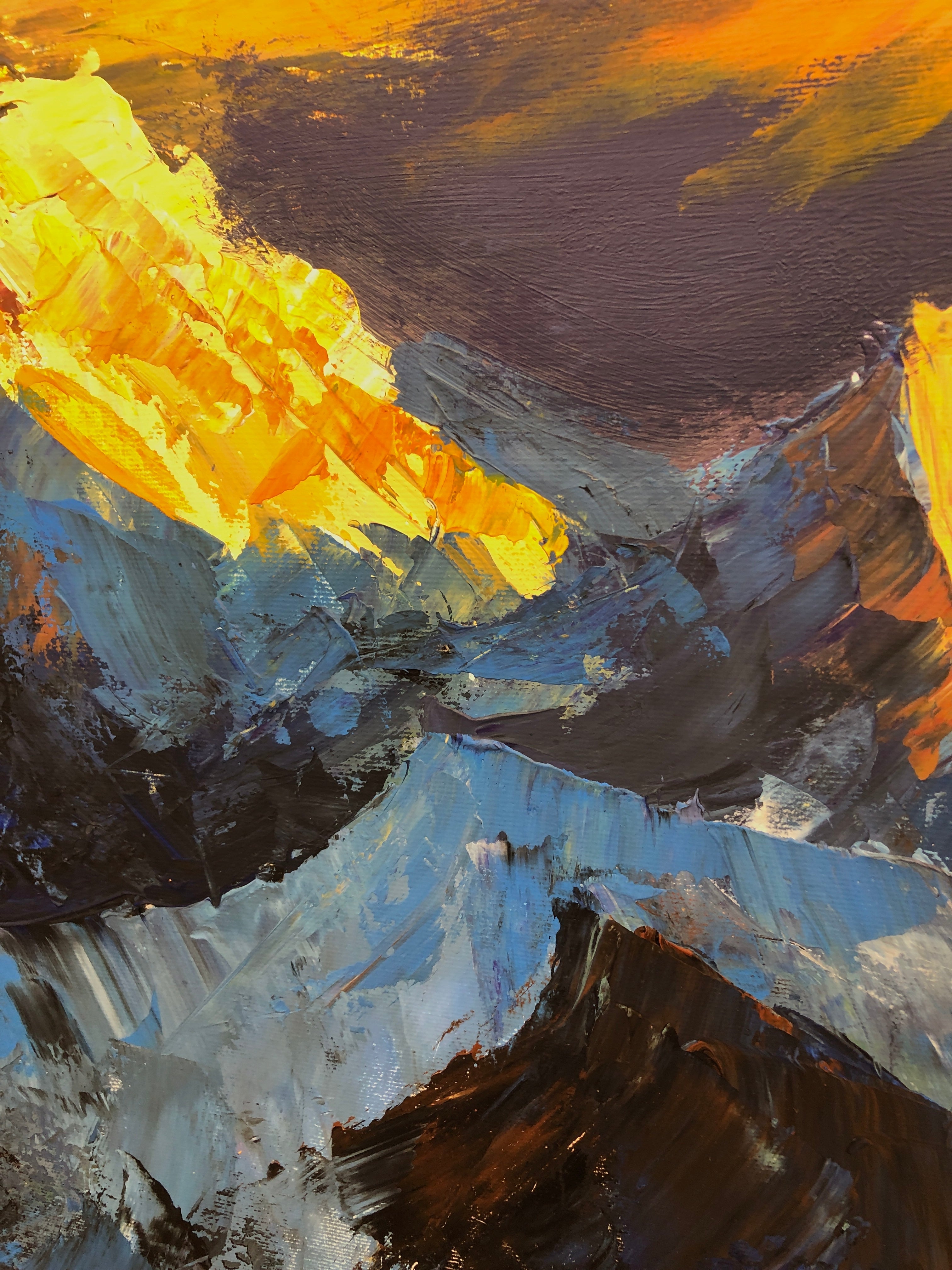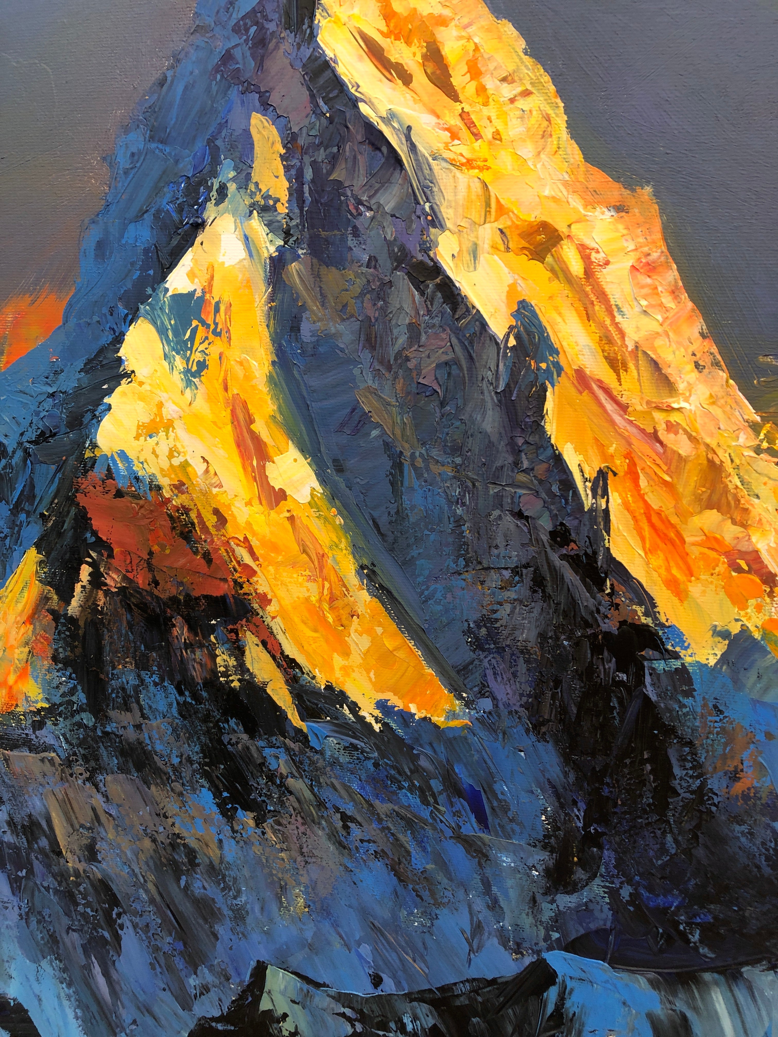 Mount Everest, known in Nepal as Sagarmatha and in Tibet as Chomolungma, has been revered for centuries as a sacred summit—“Mother of the World.” In this artwork, its towering form rises dramatically into the sky, embodying strength, transcendence, and the eternal dialogue between light and darkness. Each textured brushstroke conveys the raw energy of the Himalayas, as if the mountain itself is alive, breathing with the spirit of the earth.