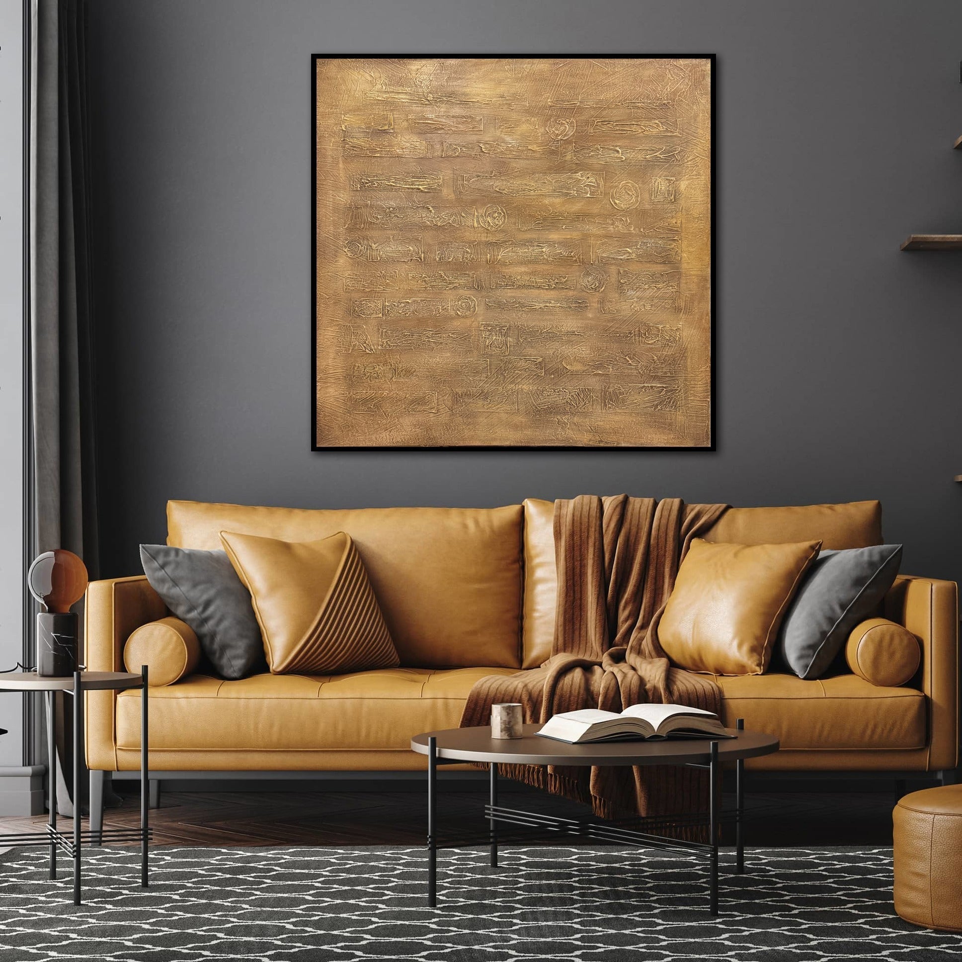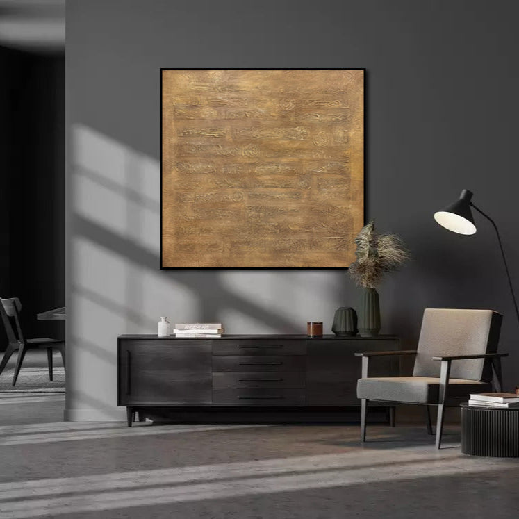 Warm metallic layers in antique gold and bronze form a hand-textured relief that recalls ancient tablets and modern minimalism. This large square canvas glows as light moves across raised marks, bringing quiet luxury to Japandi, wabi-sabi and contemporary spaces. Neutral tones blend with beige, taupe and greige palettes. Framed and ready to hang, it makes a statement above sofa, bed or console—elevating living room, dining room or office with serene gallery impact.