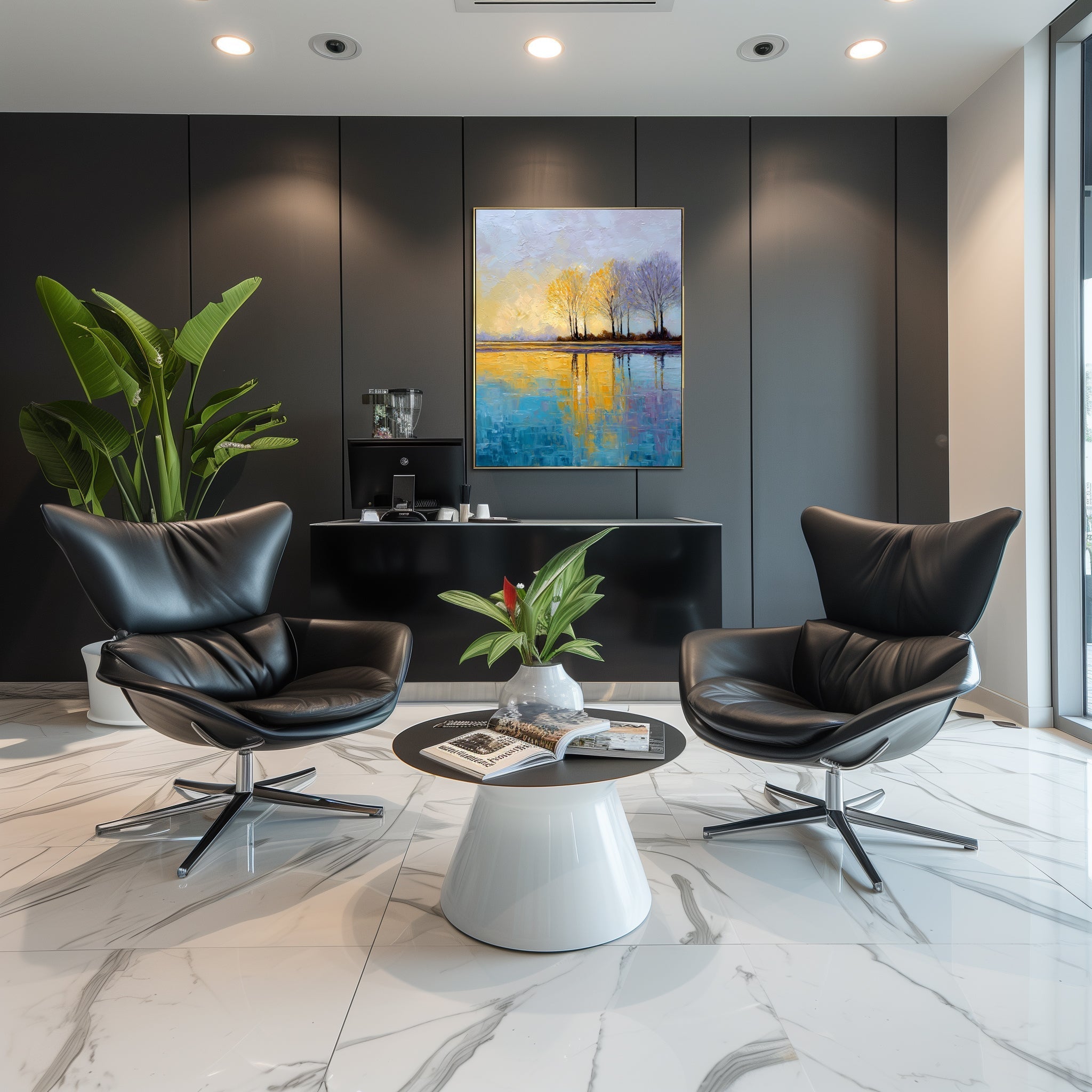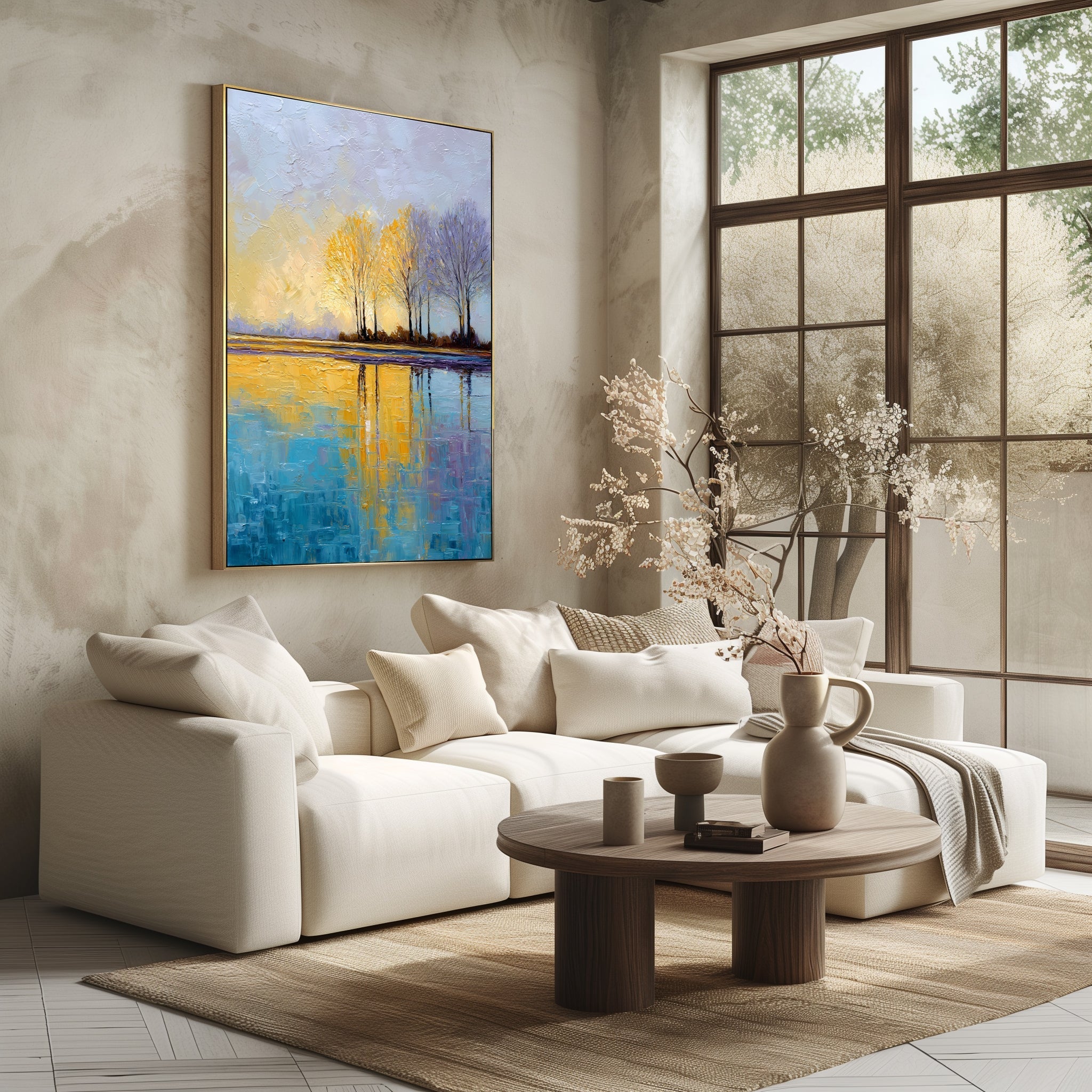 Golden Trees Lake Landscape Paintings on Canvas Textured Impressionist Wall Art Sunrise Reflections Blue Water Autumn Tranquil Water Decor | SUNRISE REFLECTIONS | Trend Gallery Art Great Britain – Trendgallery.co.uk