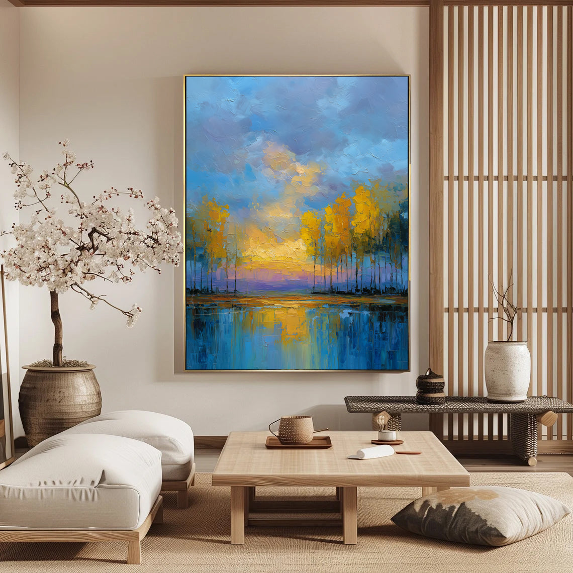 Large Golden Trees Sunset Landscape Oil Paintings on Canvas Textured Impressionist Forest Art Blue Water Reflection Autumn Nature Wall Decor | TWILIGHT REFLECTIONS | Trend Gallery Art Great Britain – Trendgallery.co.uk