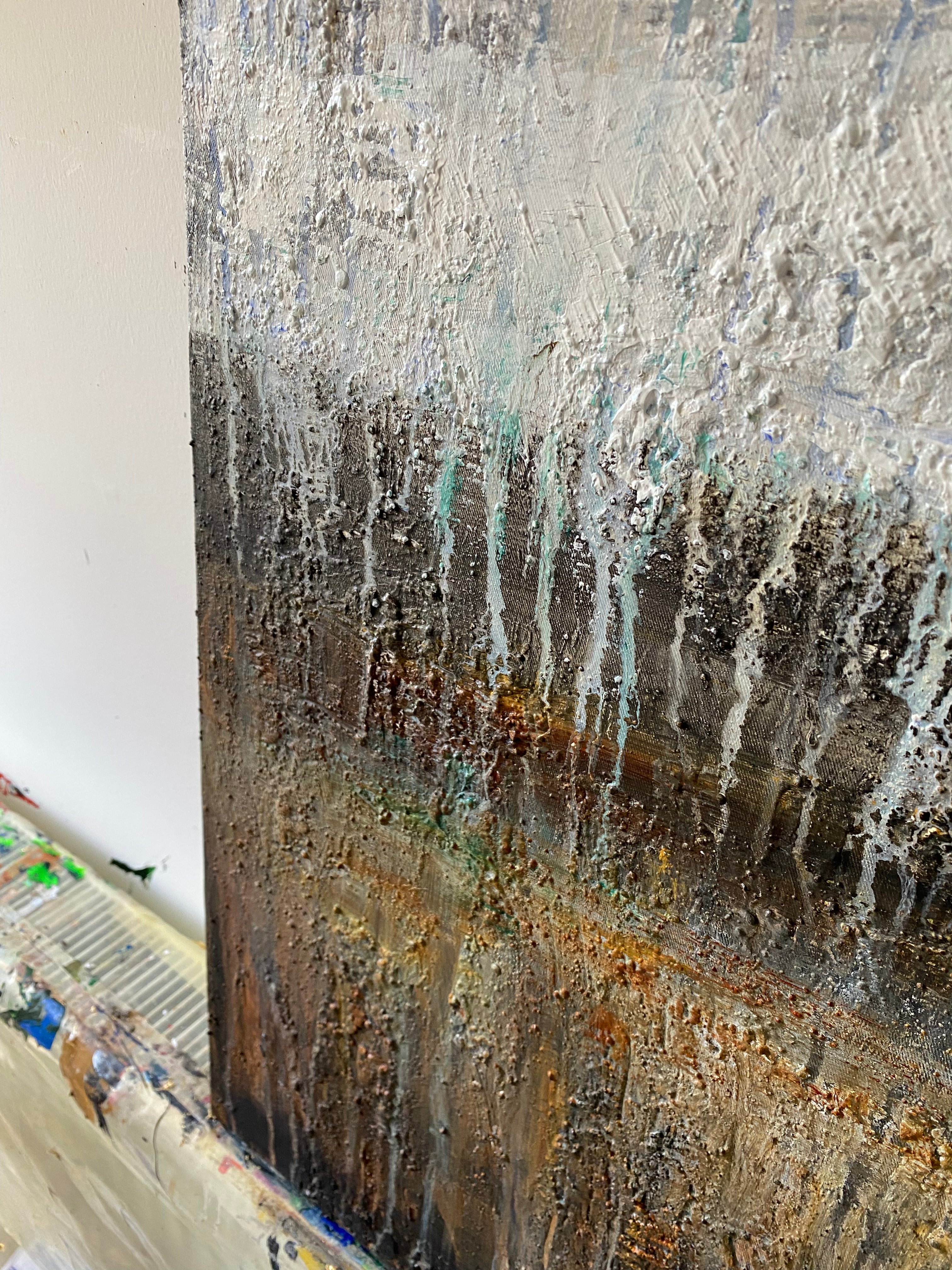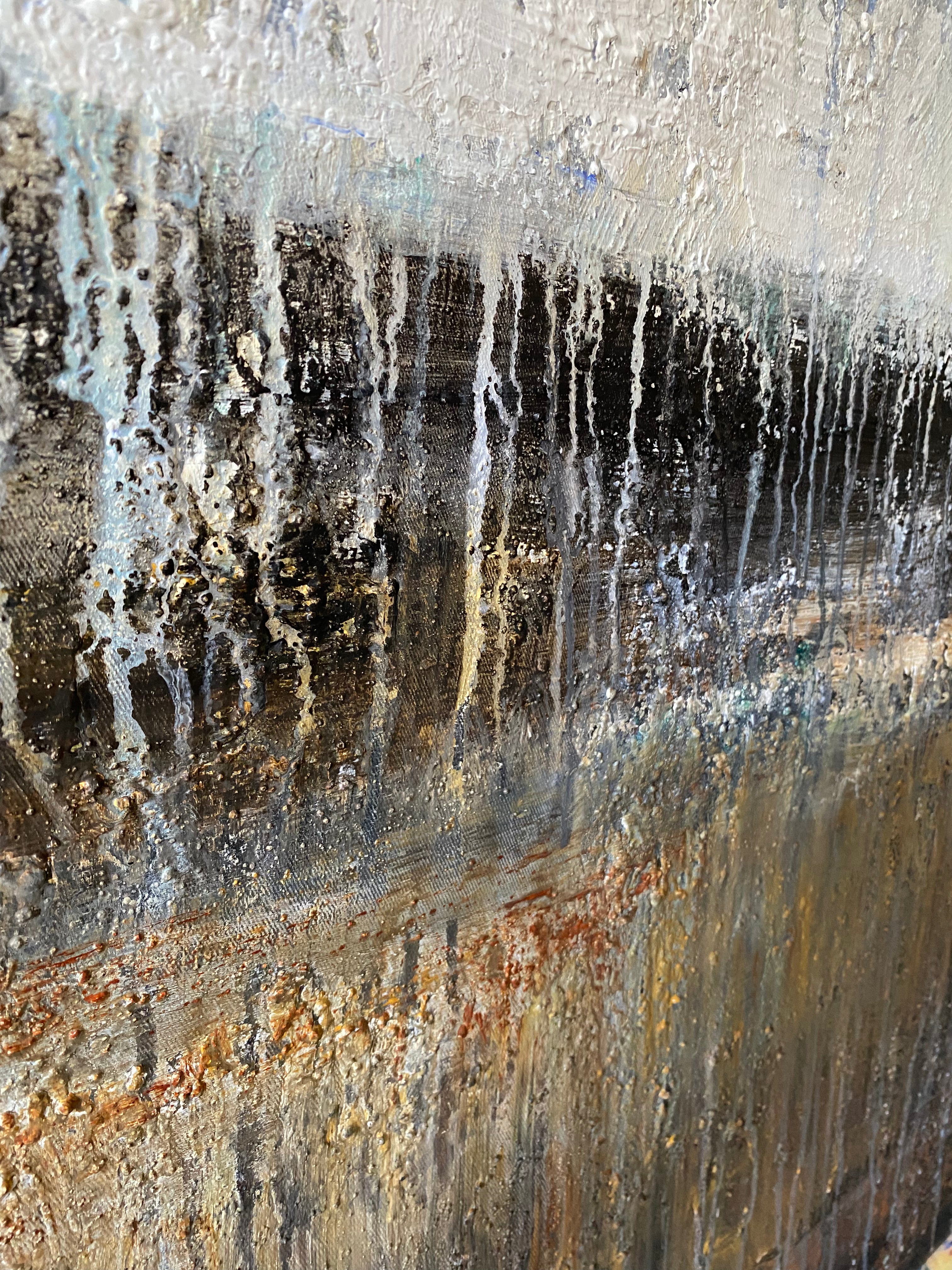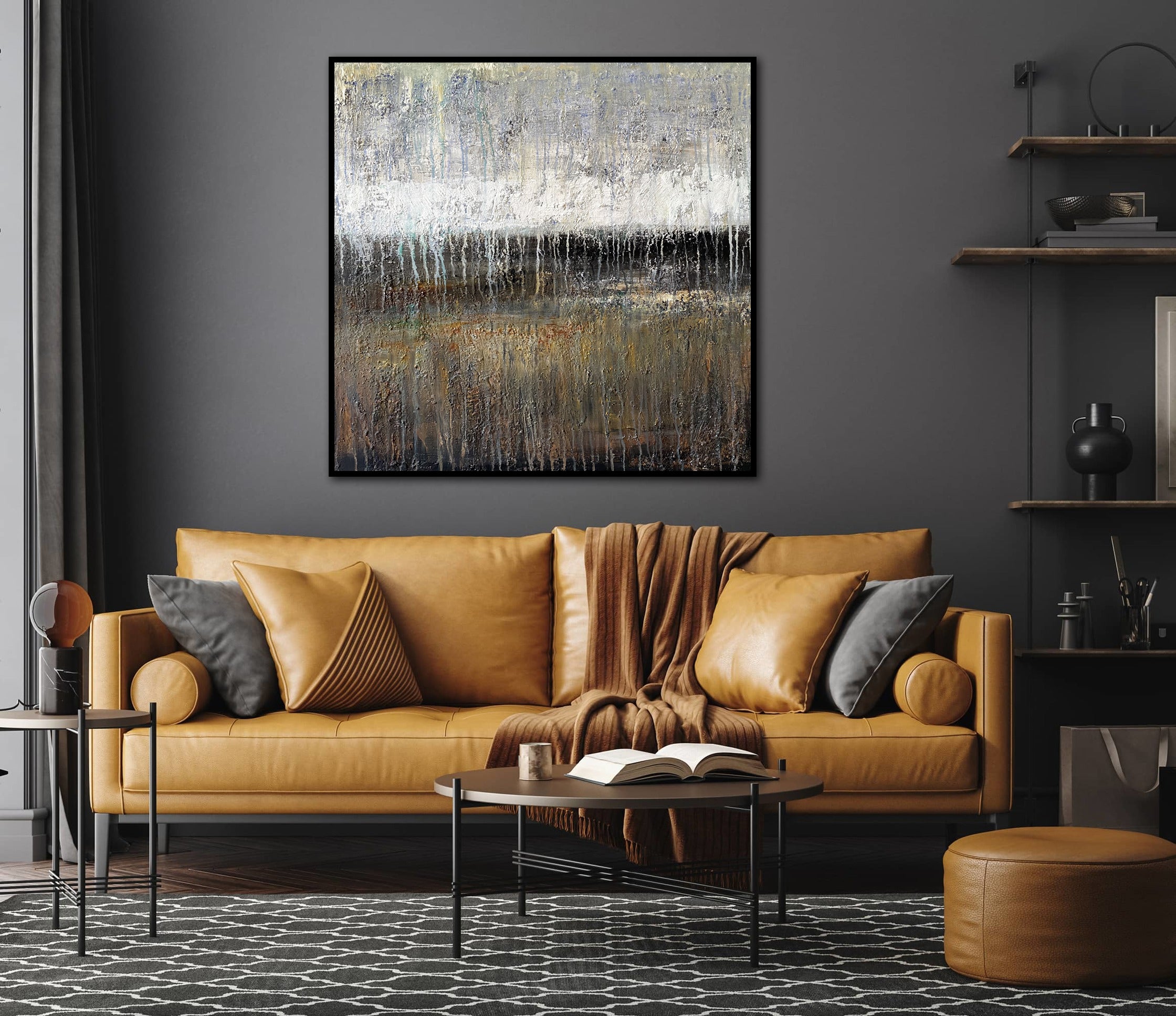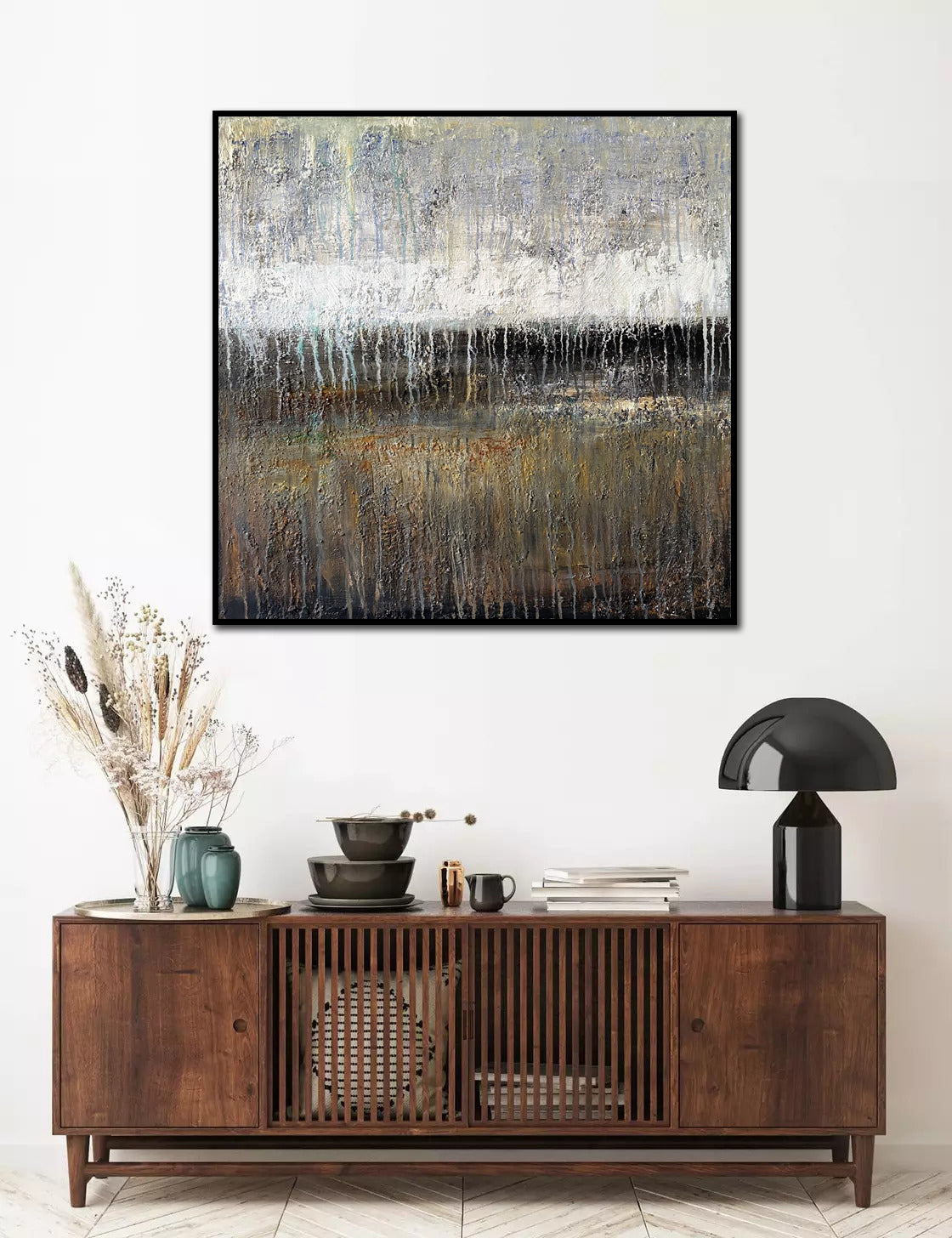 Bring calm drama to your space with this textured abstract landscape. Heavy impasto and soft drips evoke mist over the horizon, blending neutral greys, off-white, charcoal, taupe, rust and touches of teal. The moody, wabi-sabi vibe suits living rooms, bedrooms, offices and modern rustic interiors. Handmade on canvas with custom sizes and an optional gold floater frame. Ready to hang when stretched or shipped rolled. Color tweaks available—elevate your walls with gallery-level impact.