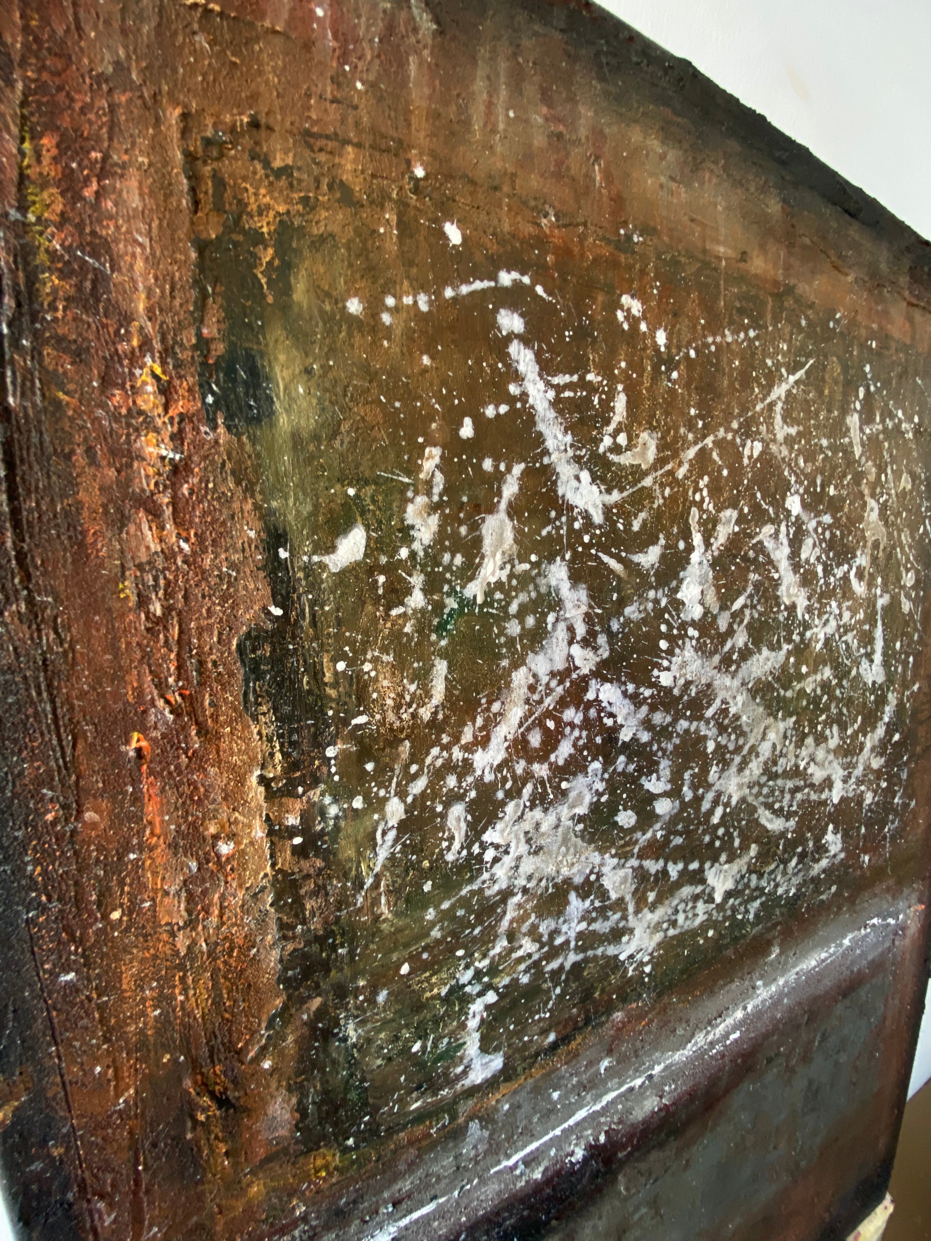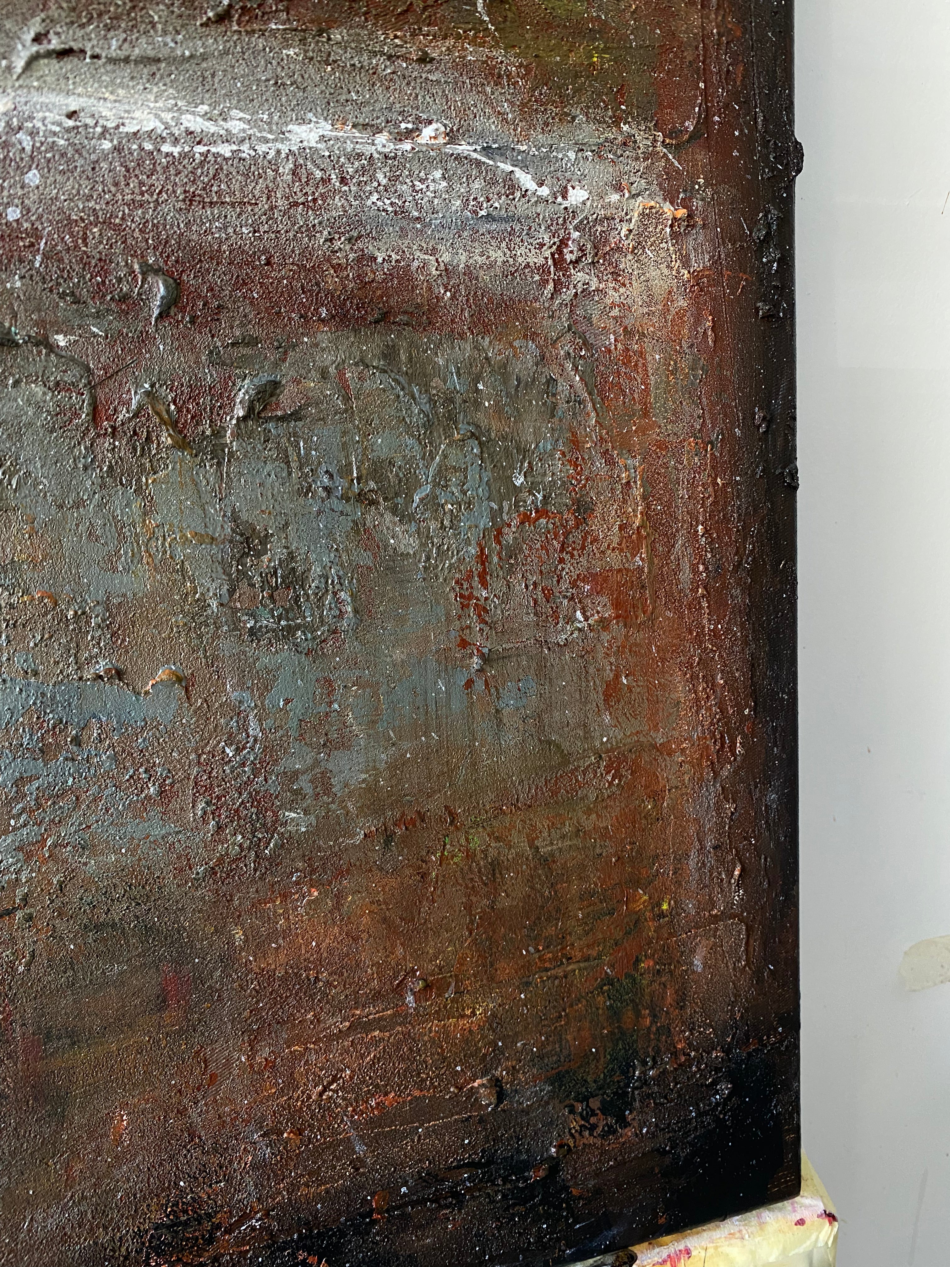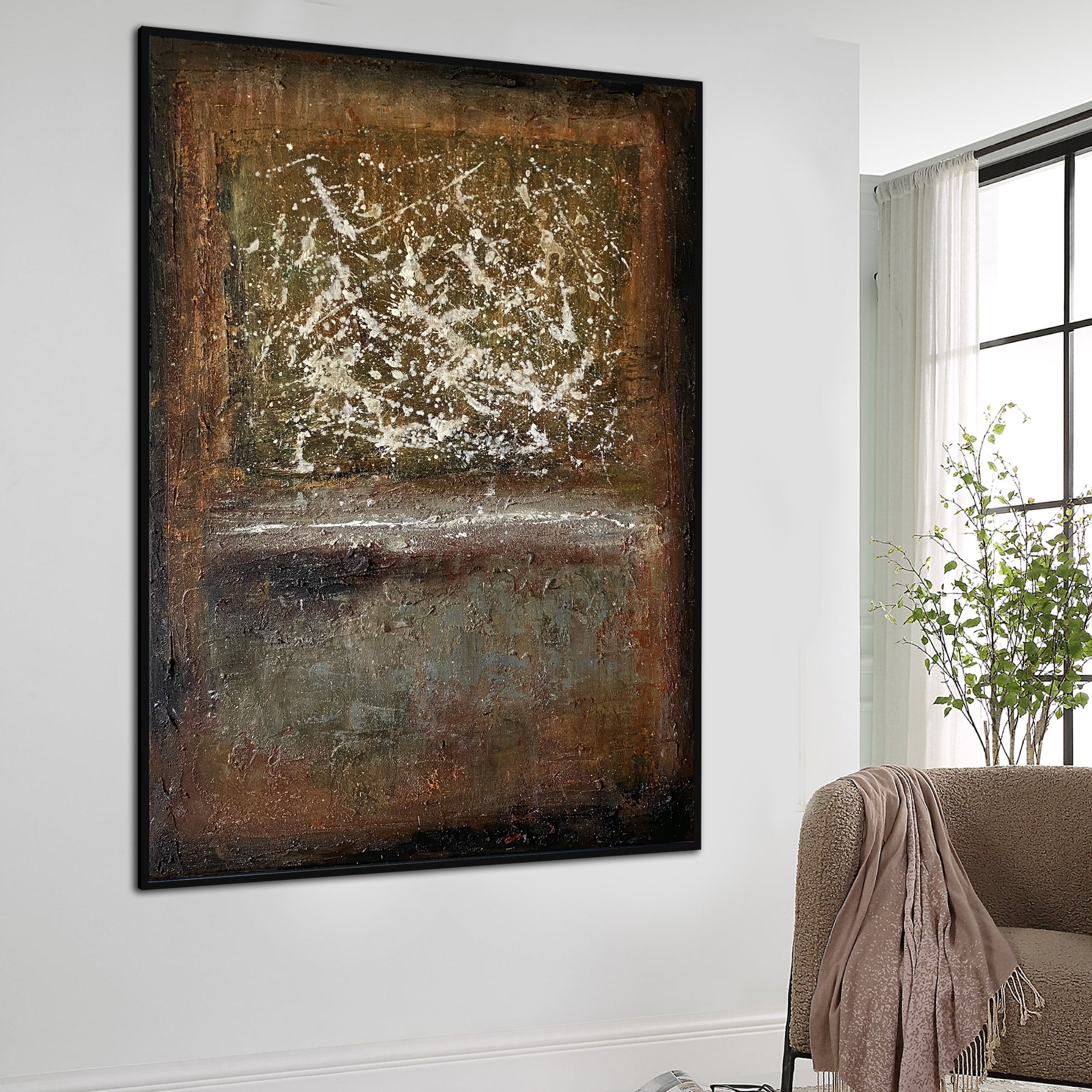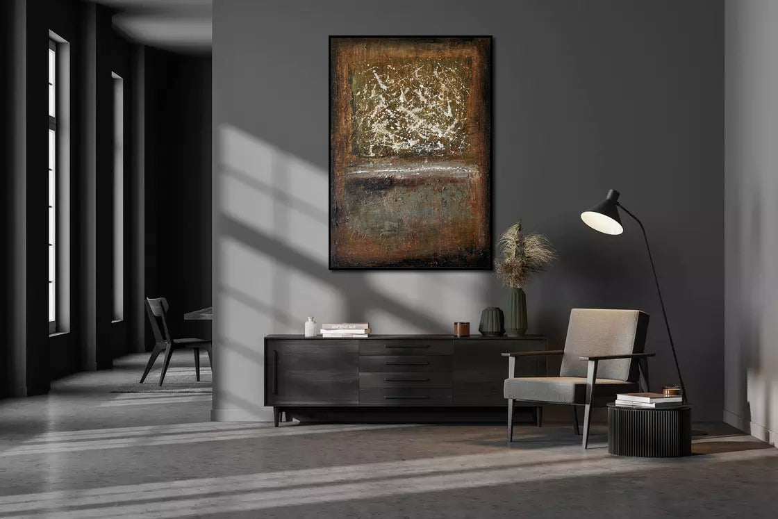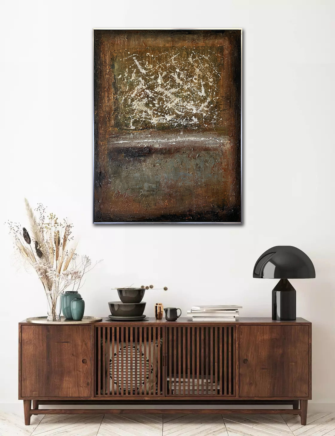 Bring raw sophistication to your space with this textured abstract in earthy browns, umber and slate, accented by a dynamic white drip. Rich impasto and timeworn patina create a wabi-sabi, industrial mood that suits lofts, offices and modern rustic interiors. Hand-painted on canvas, available in custom sizes with optional floater frame. Ready to hang when stretched or shipped rolled. Color adjustments welcomed—add museum depth and grounded warmth to your wall. Vertical format adds a bold focal.