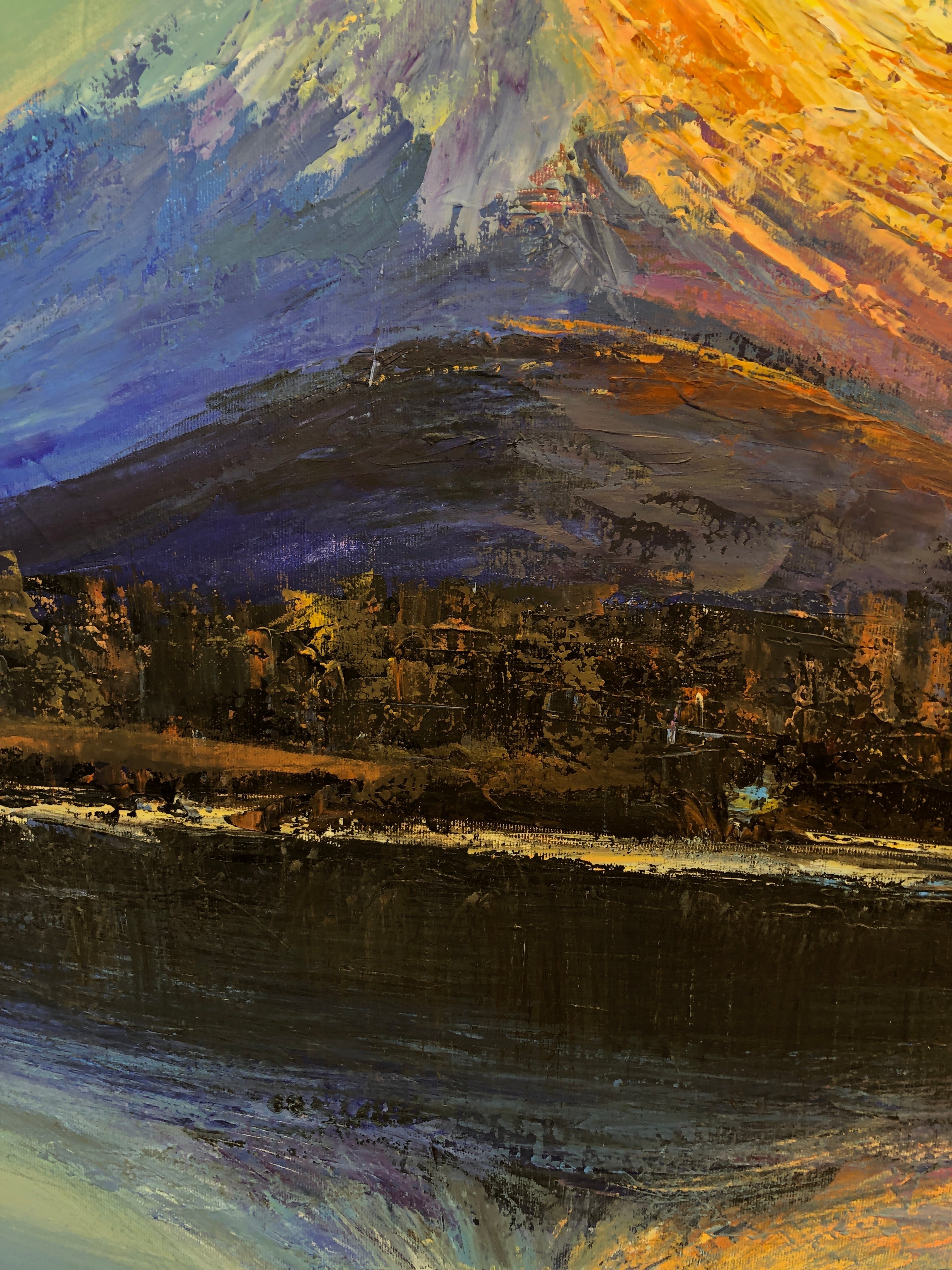 This stunning painting captures the timeless majesty of Mount Fuji, Japan’s most iconic symbol of natural beauty and spiritual harmony. The artist masterfully depicts the mountain at dawn, as the first golden rays of sunlight crown its snow-dusted peak, cascading down the slopes in radiant hues of fiery orange, violet, and indigo. The tranquil reflection in the still waters below doubles the sense of serenity, creating a mirror of heaven and earth.