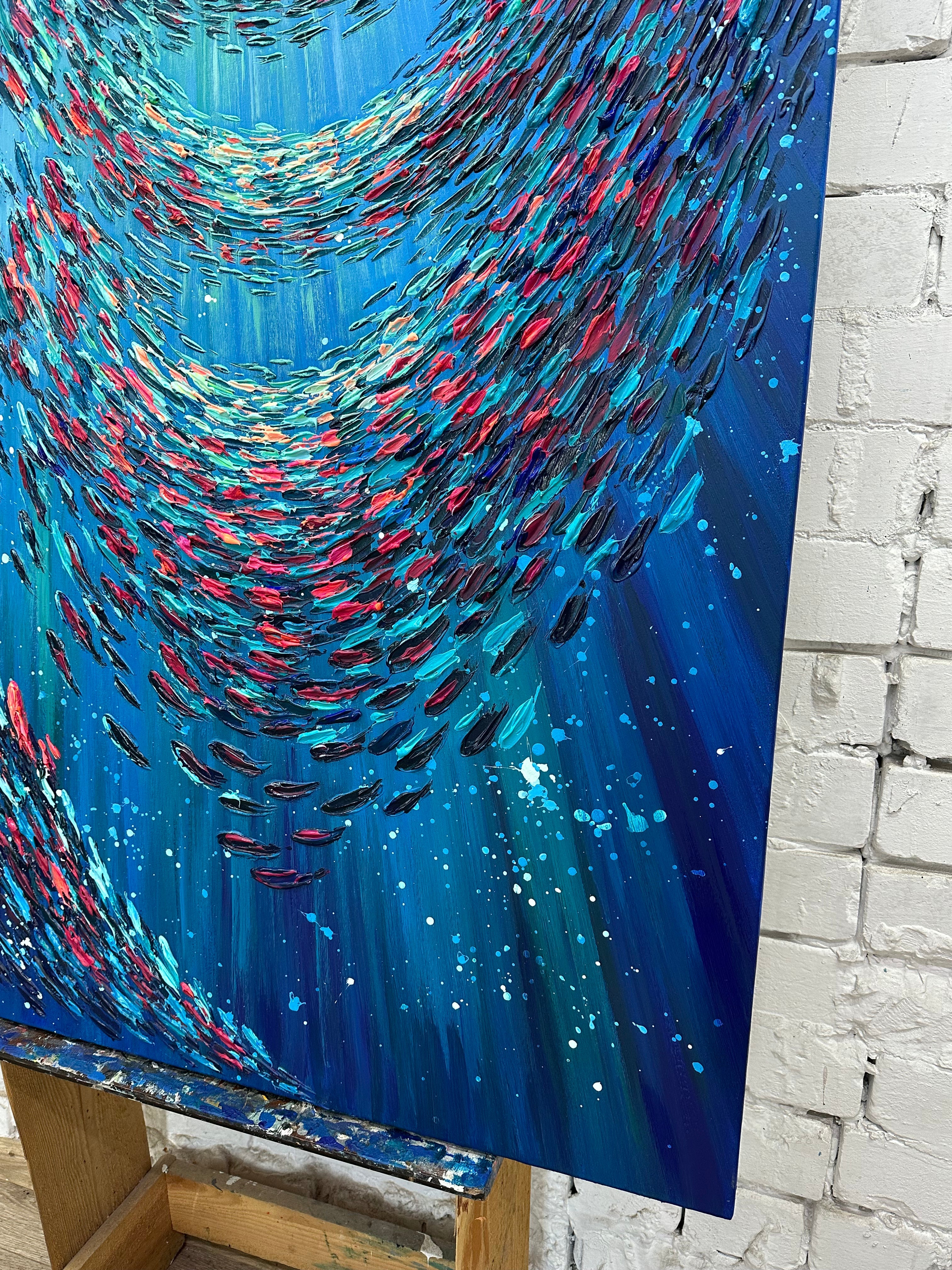 Dynamic underwater painting with swirling fish in deep blue tones. A modern aquatic artwork that brings movement and serenity. Order now and elevate your space!