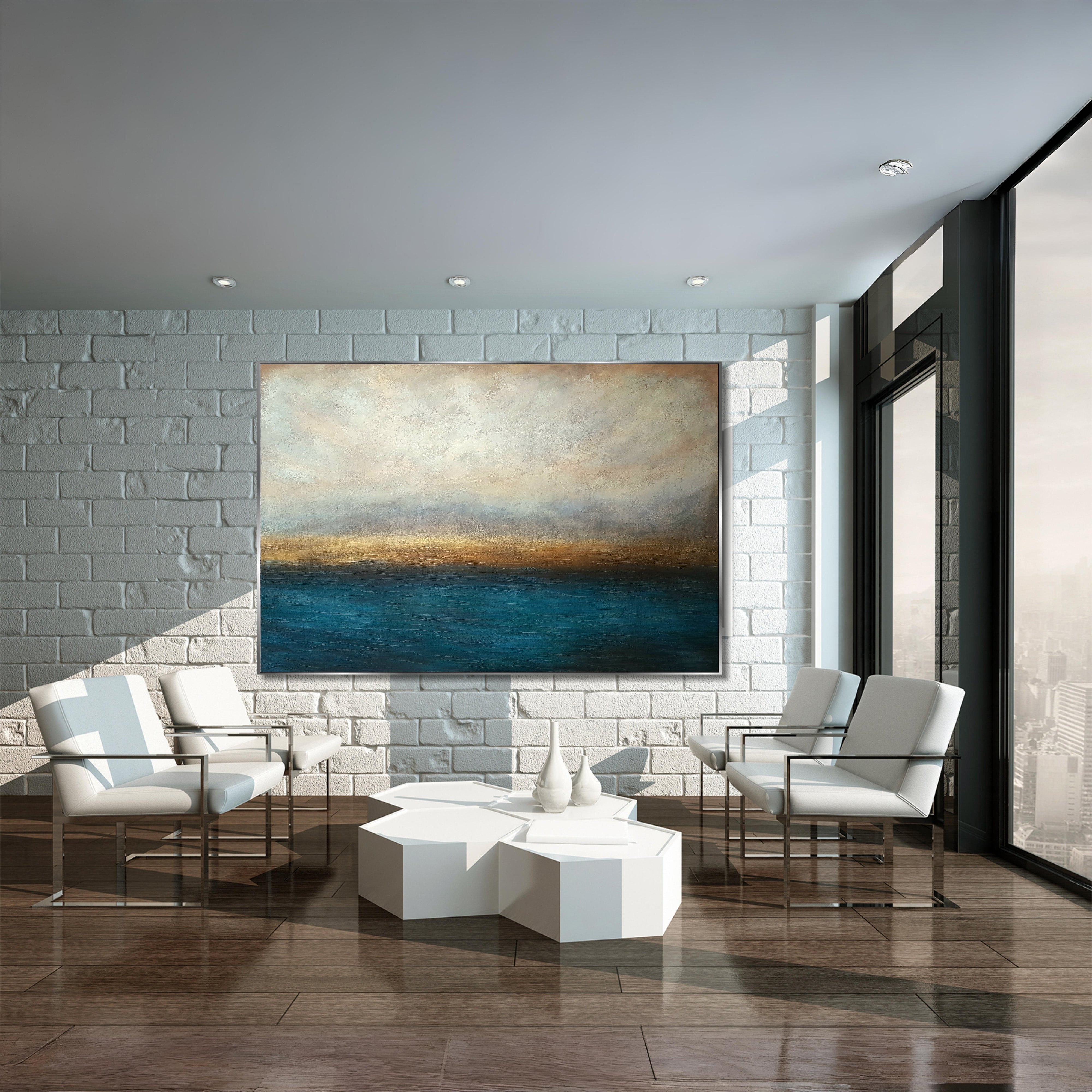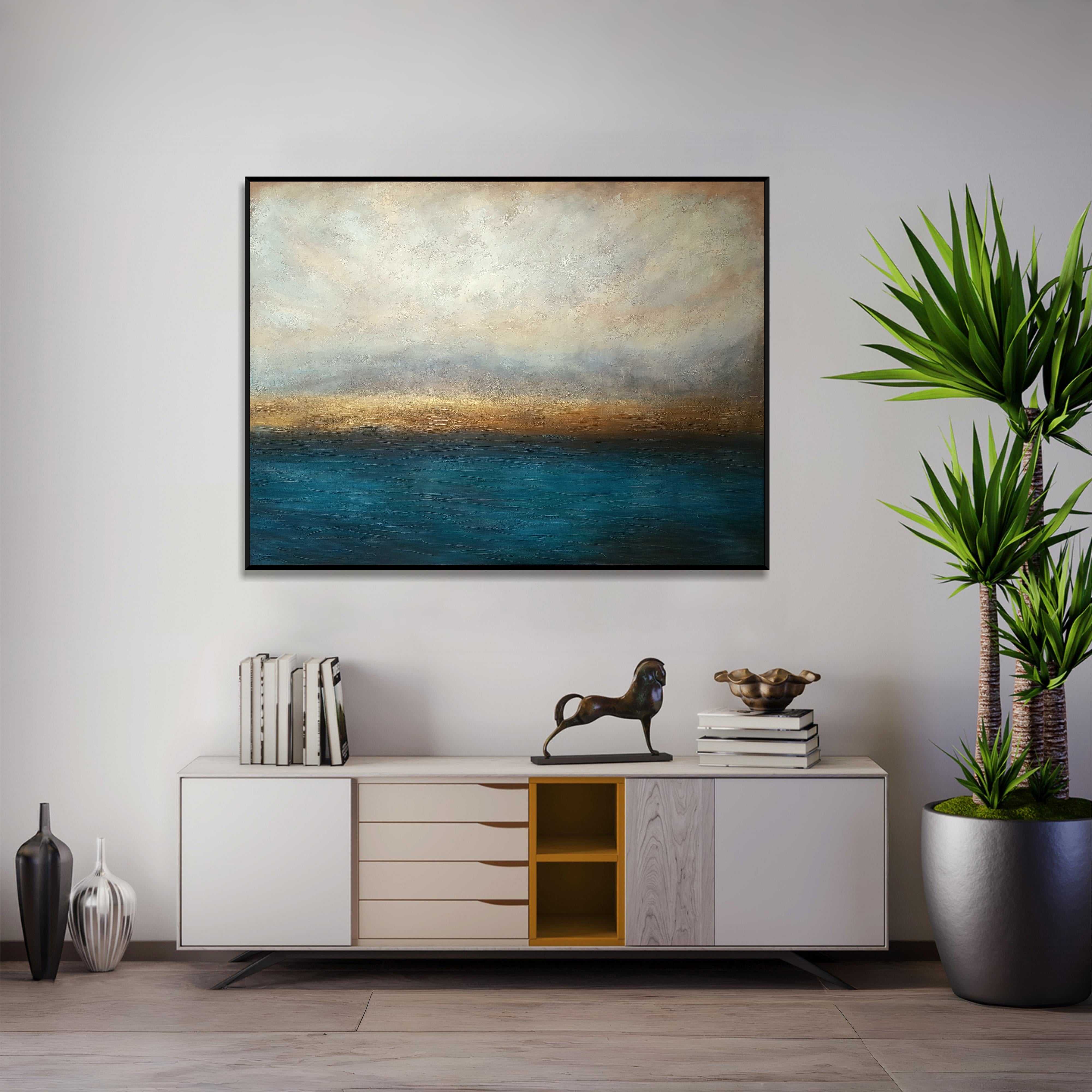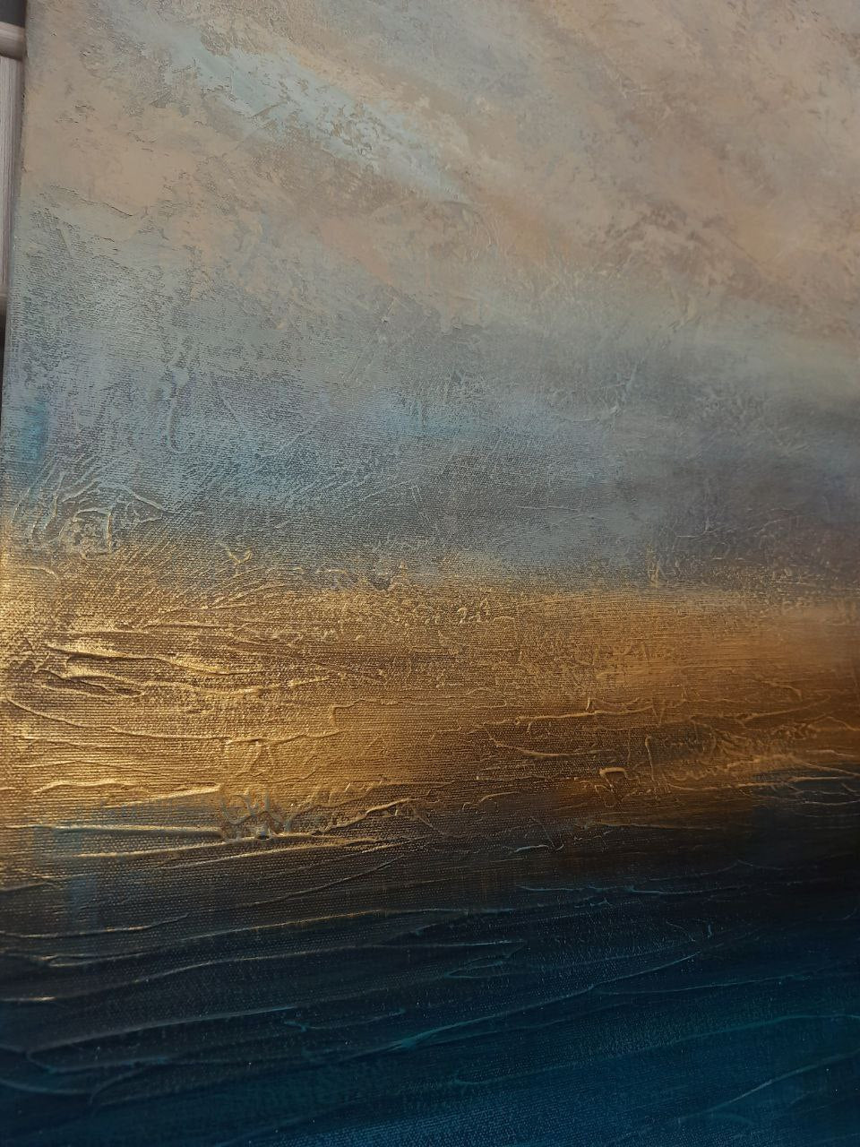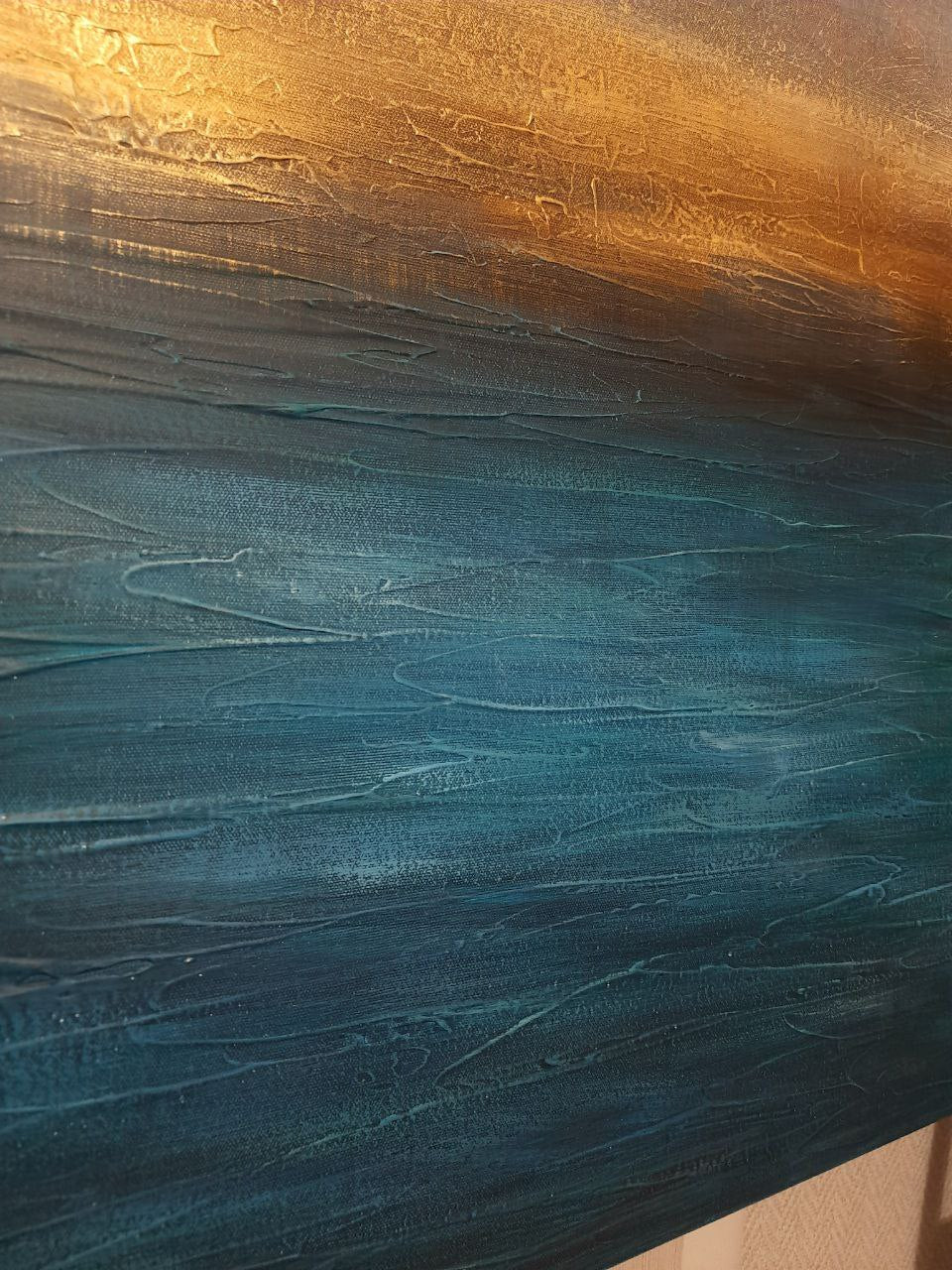 This ocean painting was inspired by the sunset over the sea horizon. Imagine last sunbeams reflect in the sea waves and light up the sky, the dark shadows are starting to appear in the waves and all nature is going to dive deeply into sleep. But the light always comes after the darkness, and this natural cycle is telling us about all the good things that will happen again even if now we don't feel very well. The artist depicted the ocean in deep blue, navy, and green colors and combined them with a light color of the sky and amber color of the setting sun. This original abstract art would be an amazing addition to your space.