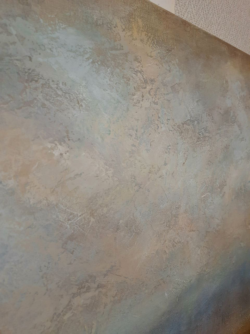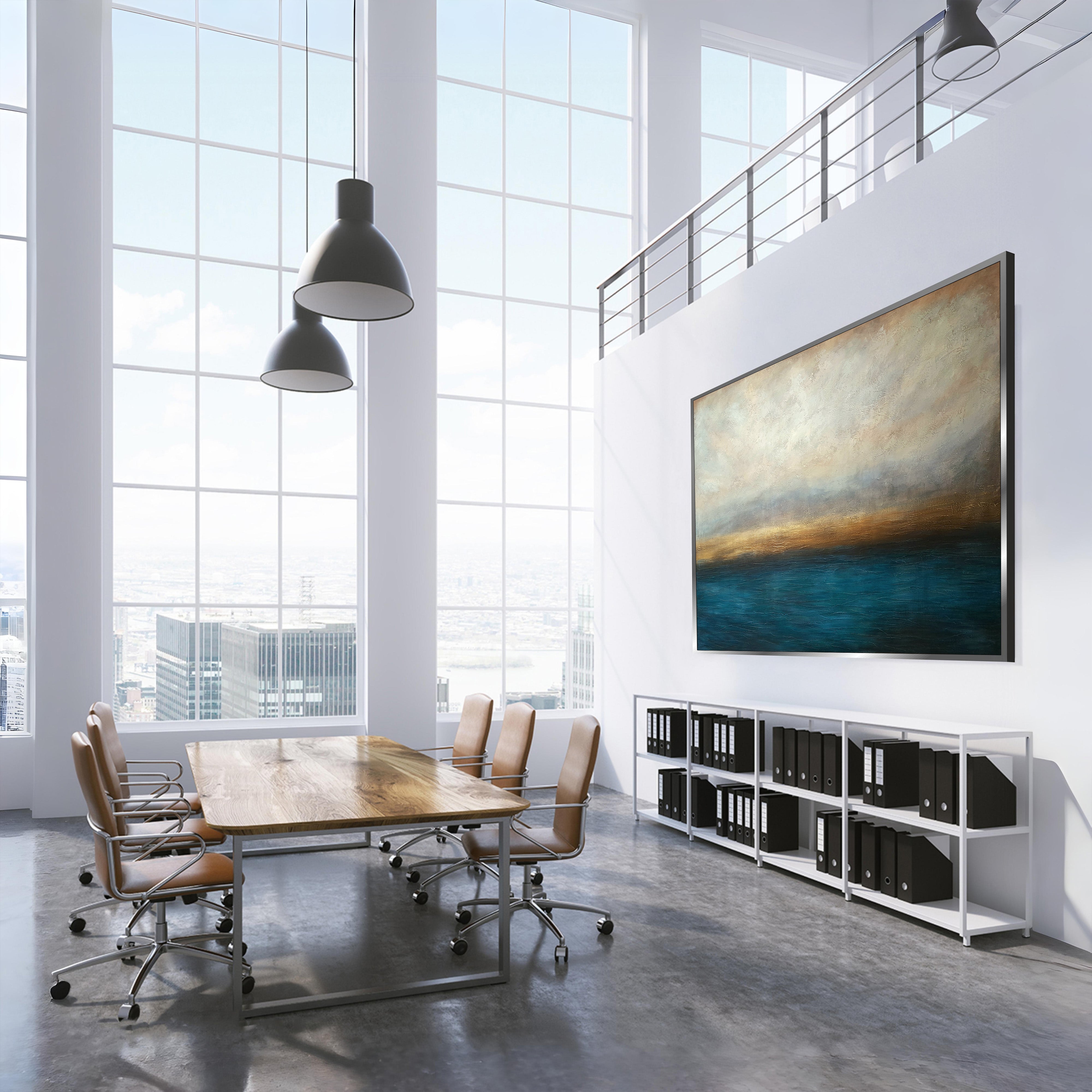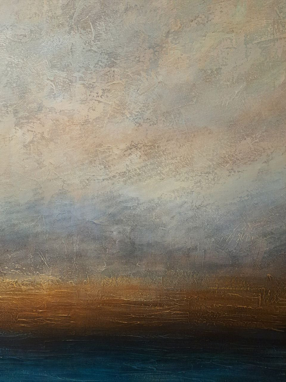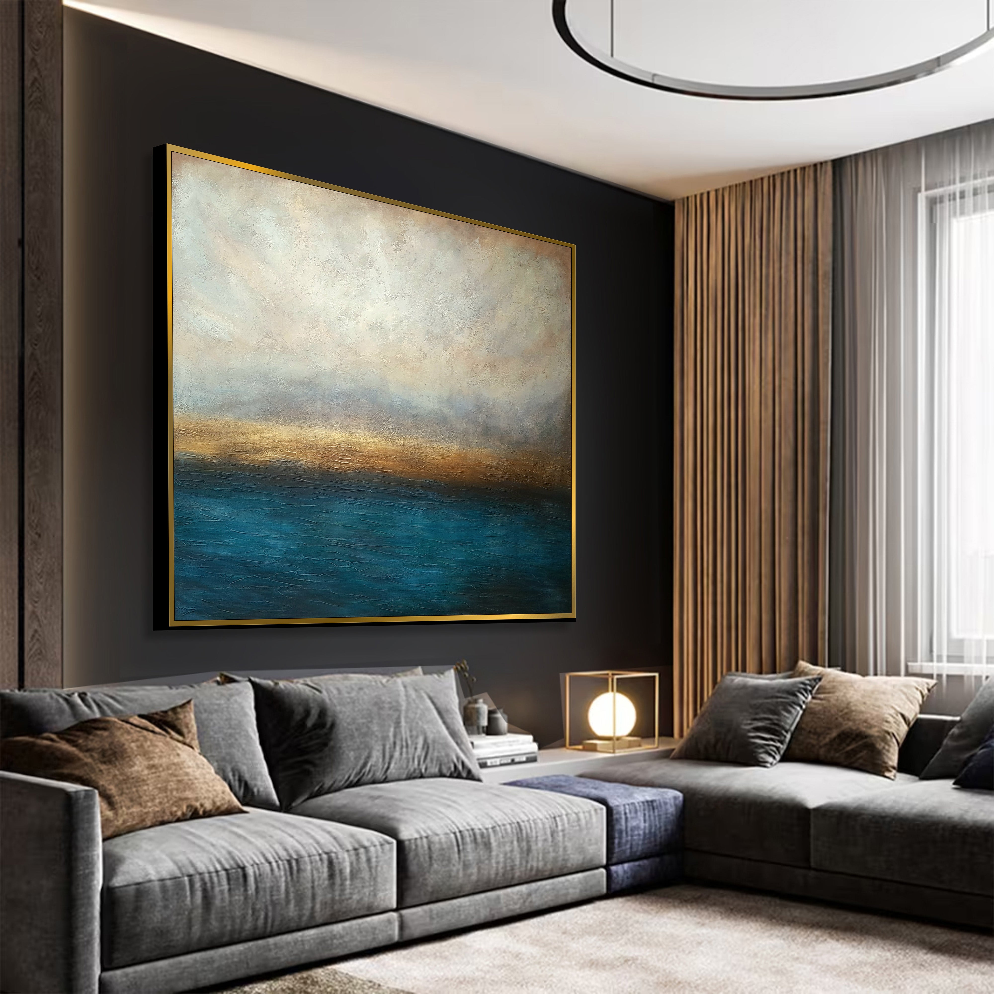 This ocean painting was inspired by the sunset over the sea horizon. Imagine last sunbeams reflect in the sea waves and light up the sky, the dark shadows are starting to appear in the waves and all nature is going to dive deeply into sleep. But the light always comes after the darkness, and this natural cycle is telling us about all the good things that will happen again even if now we don't feel very well. The artist depicted the ocean in deep blue, navy, and green colors and combined them with a light color of the sky and amber color of the setting sun. This original abstract art would be an amazing addition to your space.
