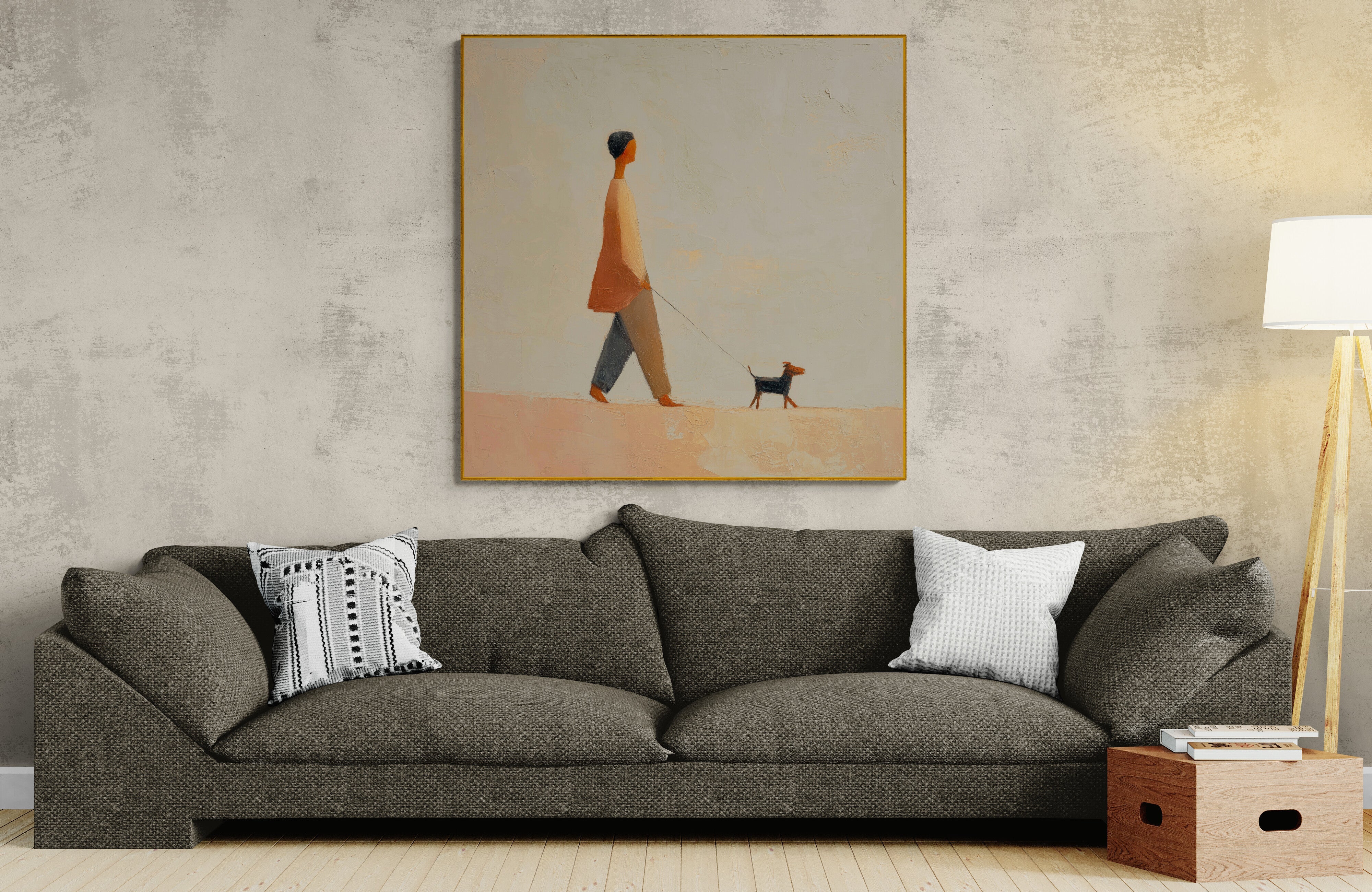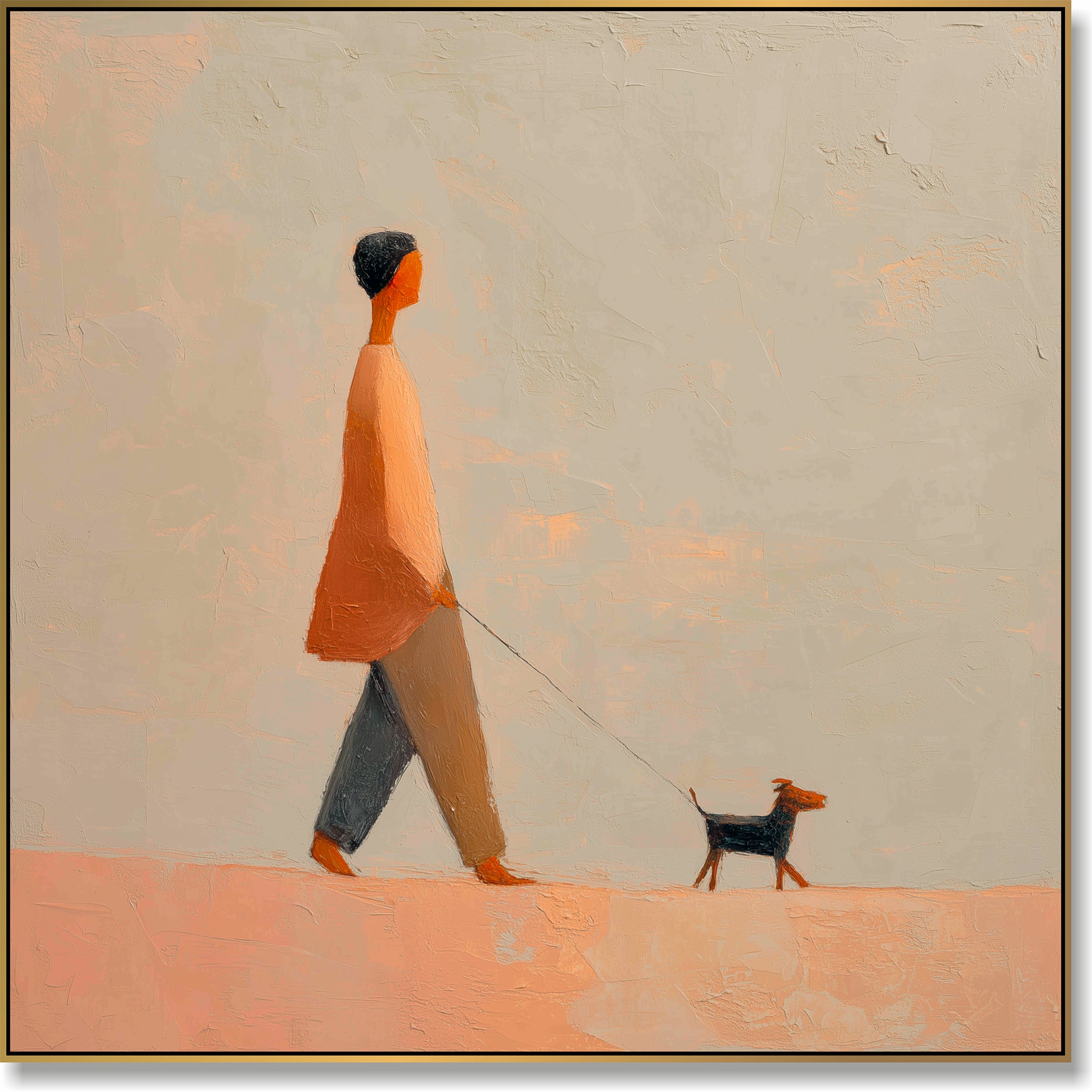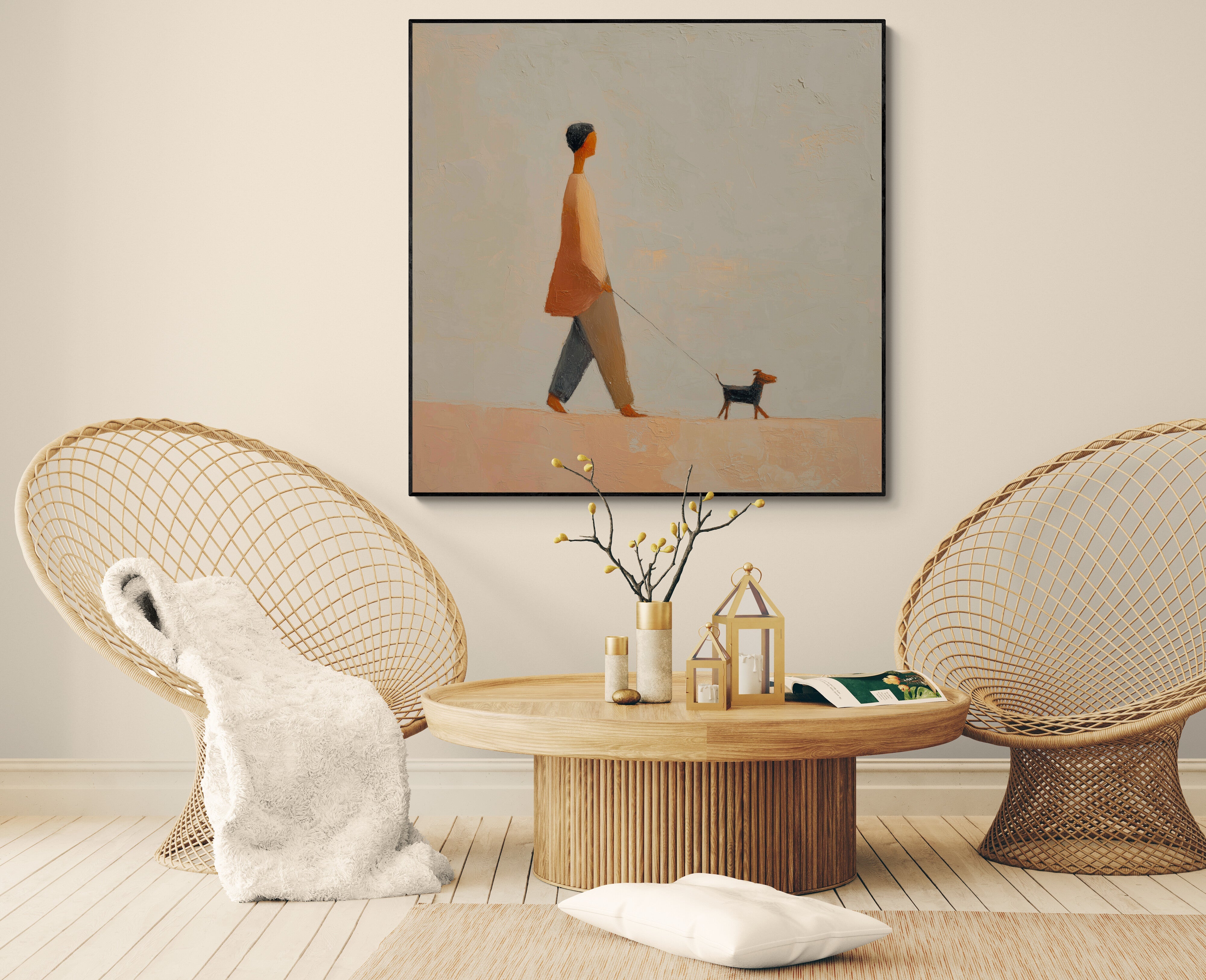 Minimalist Walking Man and Dog Art – Warm Neutral Painting | TrendGallery | Trend Gallery Art Great Britain – Trendgallery.co.uk