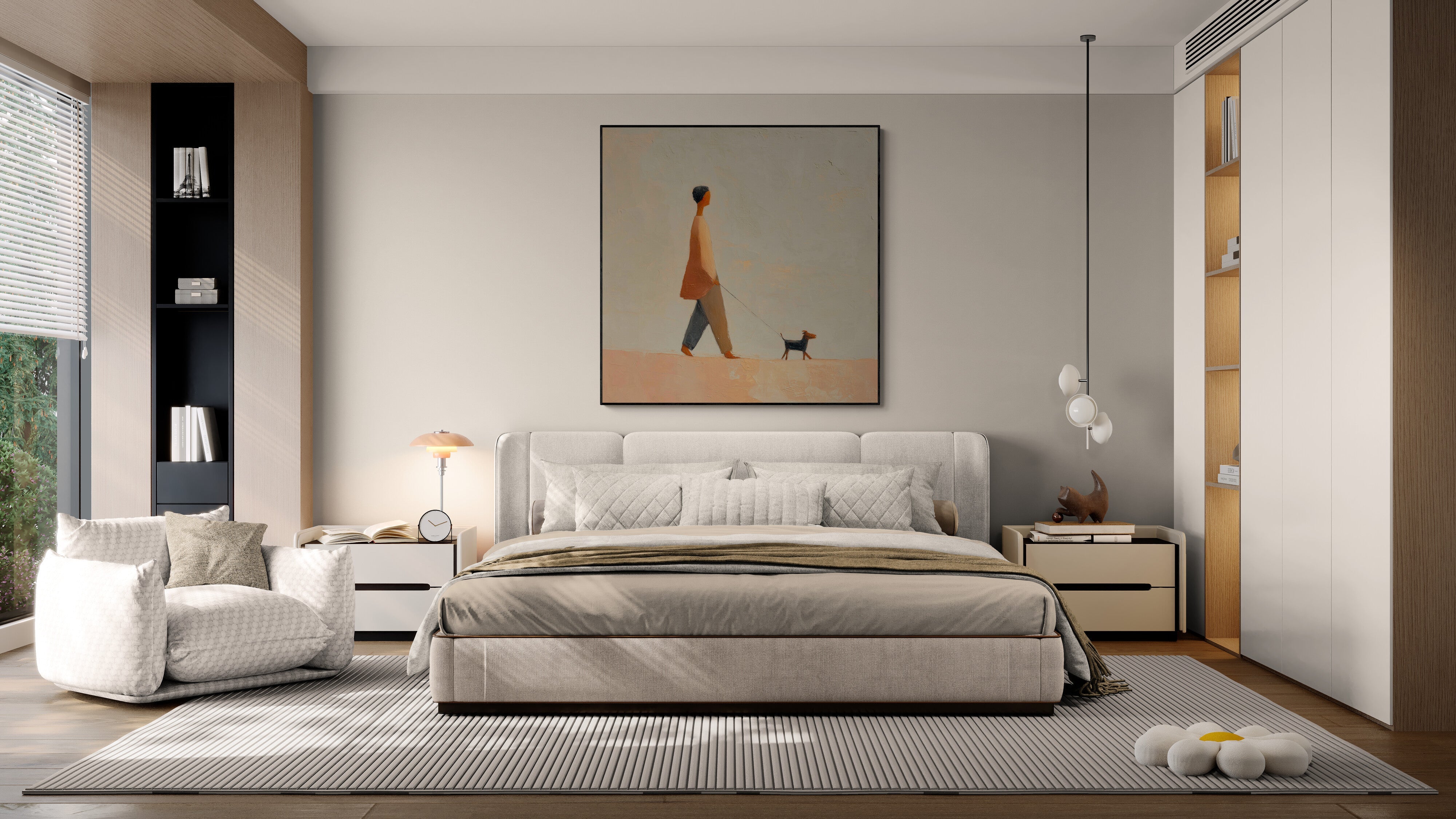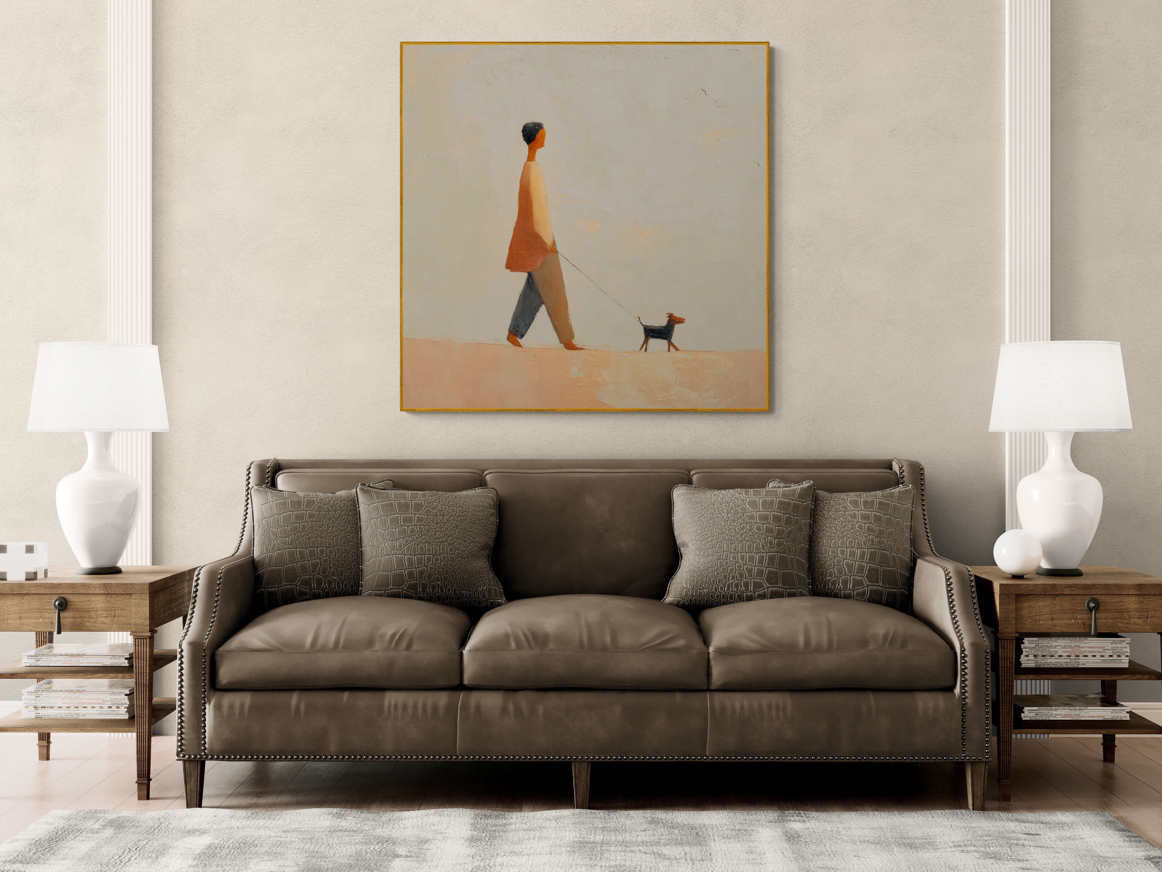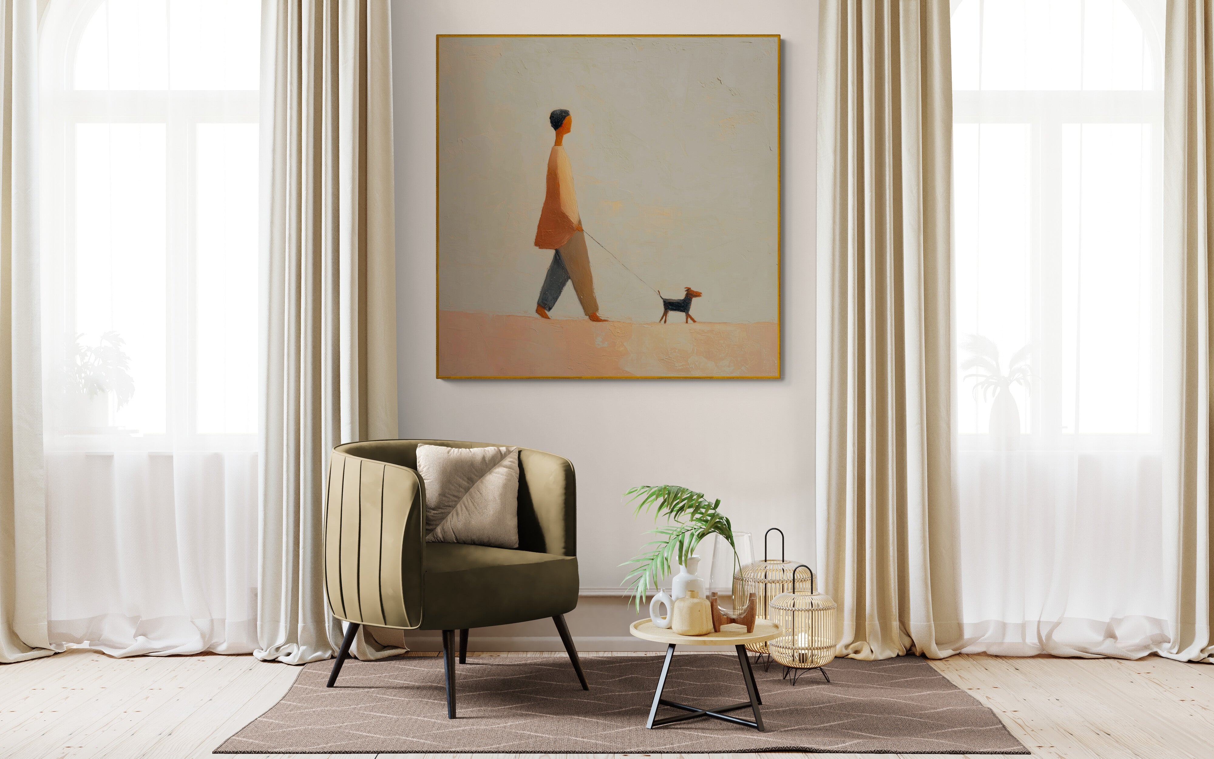 Minimalist Walking Man and Dog Art – Warm Neutral Painting | TrendGallery | Trend Gallery Art Great Britain – Trendgallery.co.uk