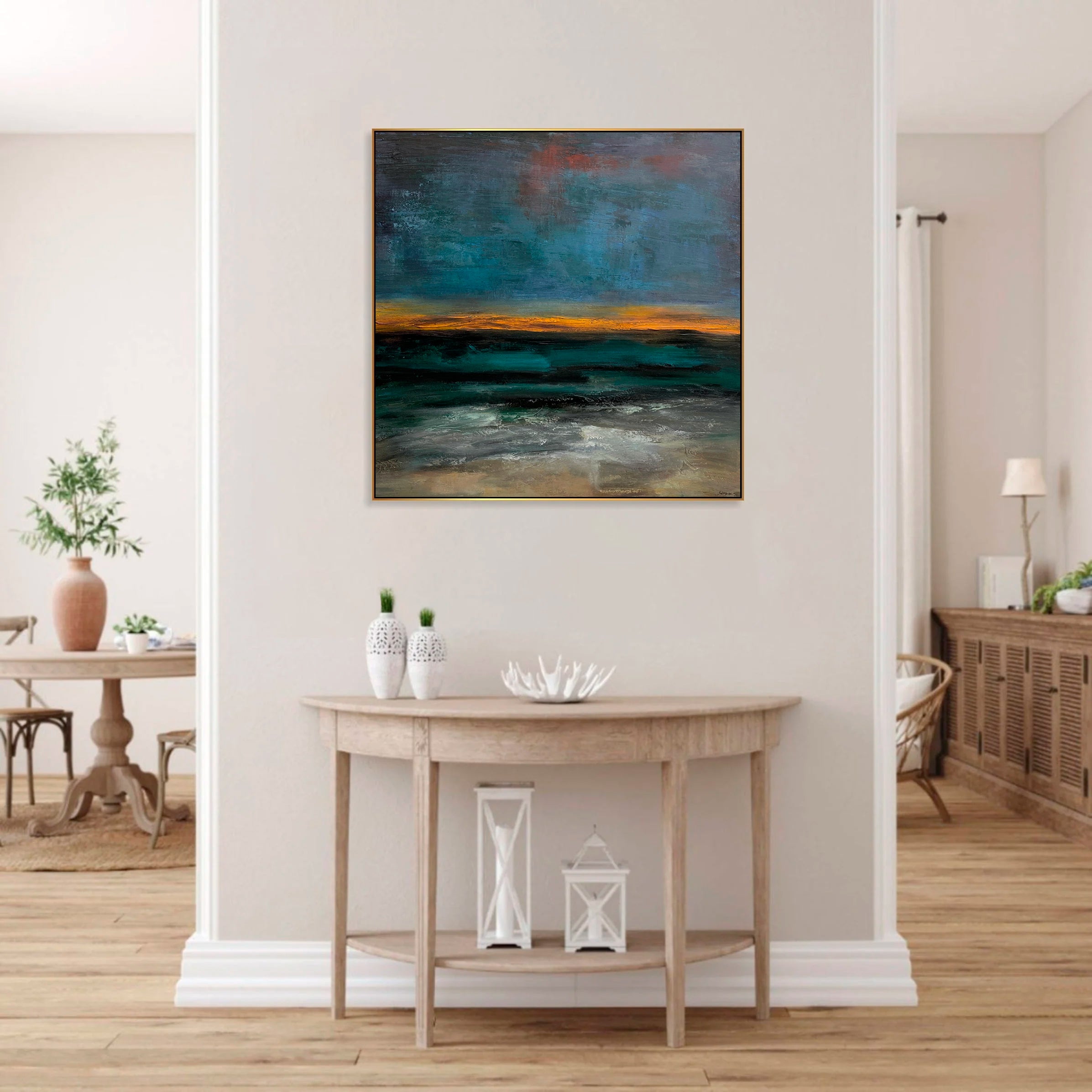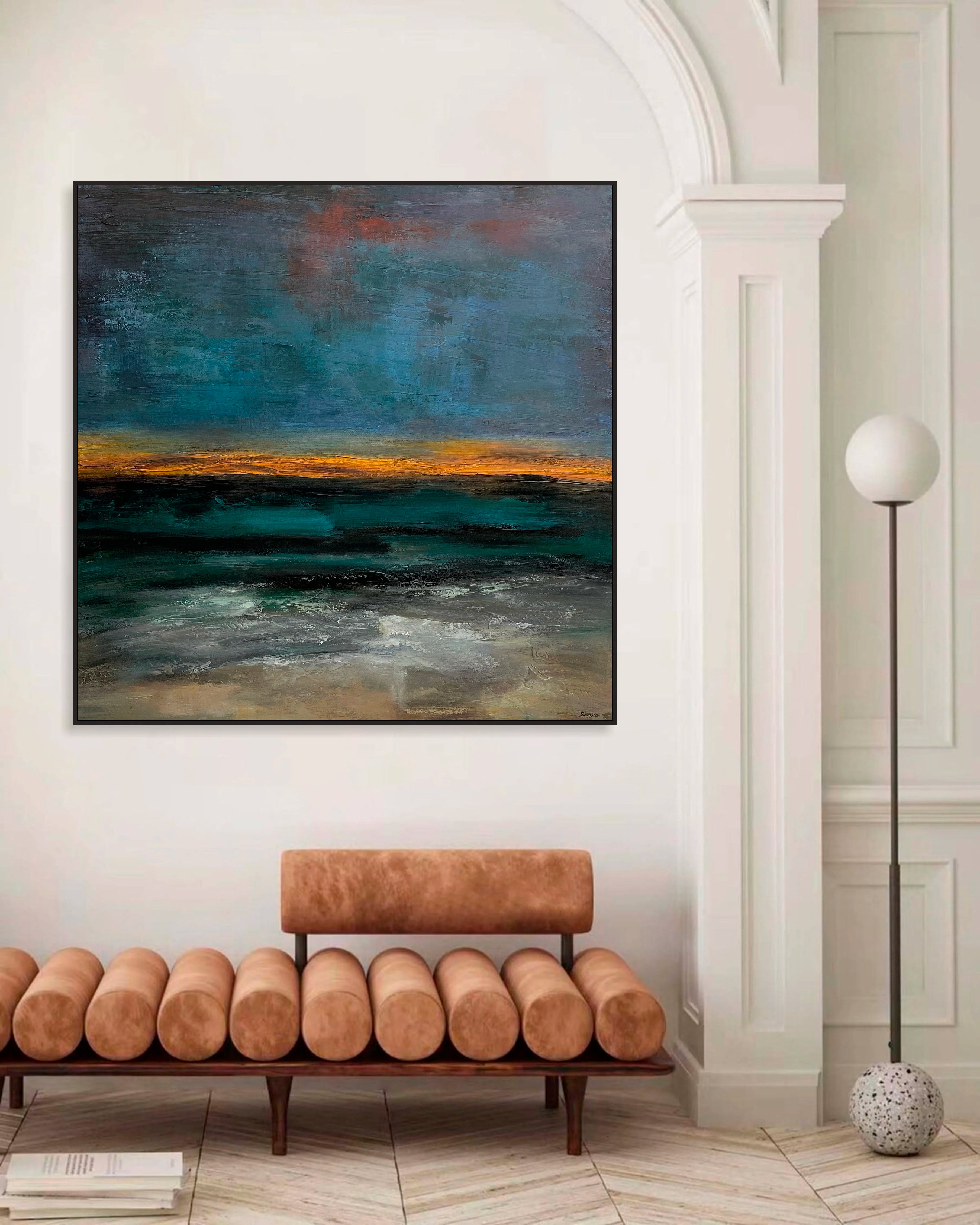 The author was inspired by the beginning of the evening storm on the sea. The sky suddenly darkened and the light blue clouds dramatically changed color to dark gray. The centerpiece of abstract art is the sea of dark turquoise and blue hues. The sea as an element gives the painting a nice feeling of eternity being. Such artwork will brightly decorate the modern interior of the living room.