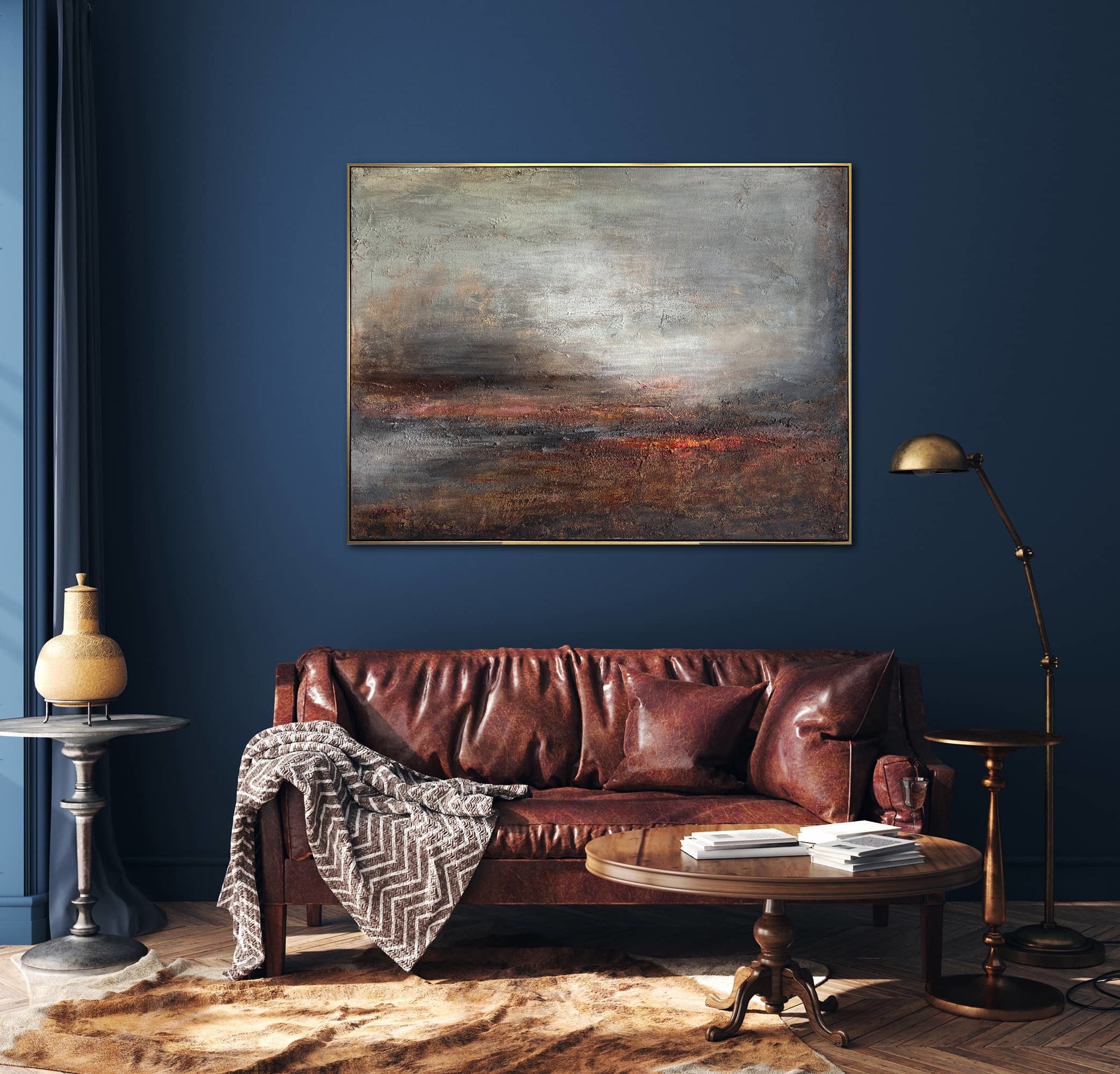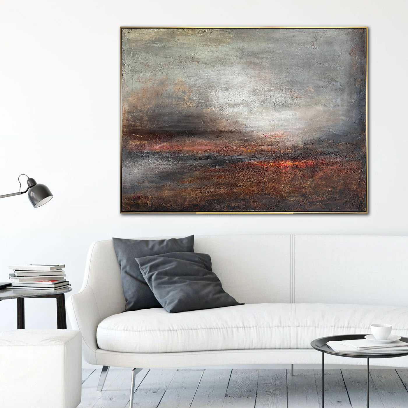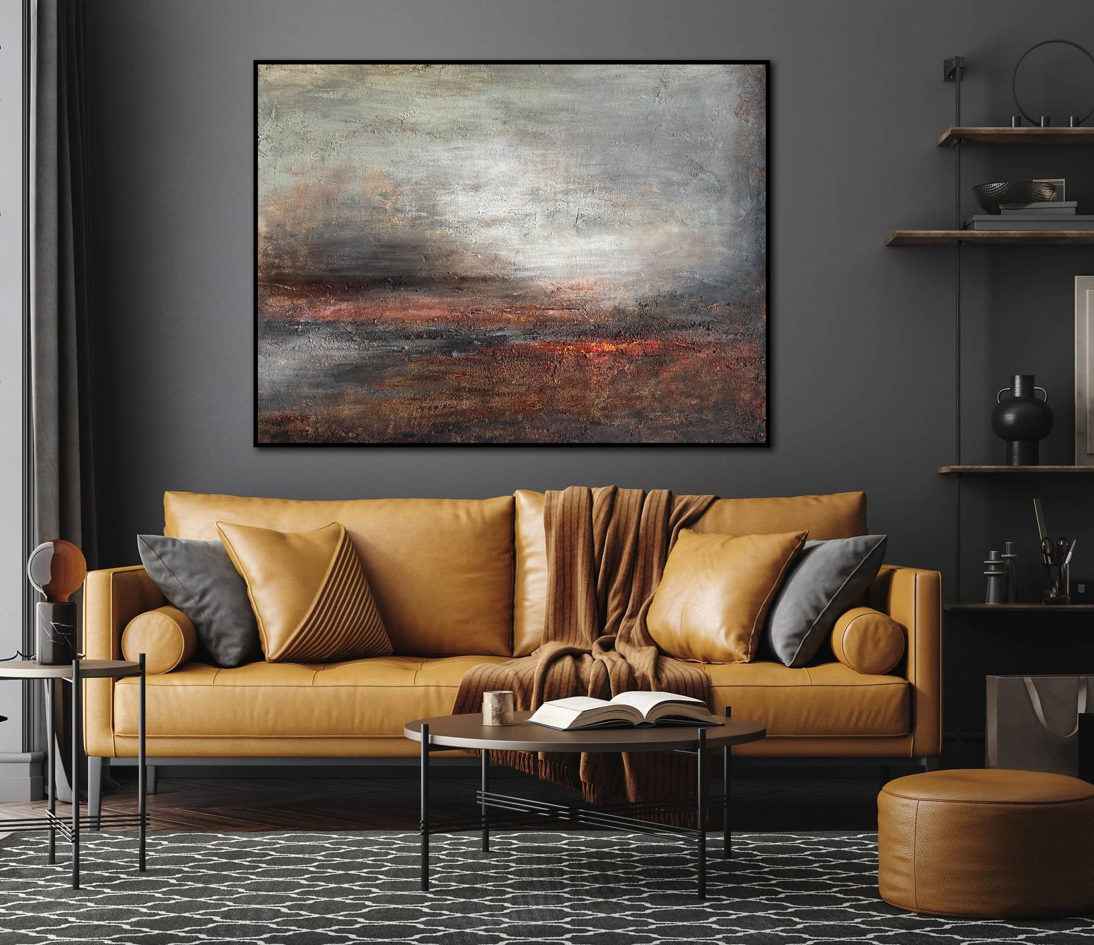 An atmospheric horizon unfolds in layers of soft grey and taupe, lit by a glowing band of rust, copper and ember red. Thick impasto adds tactile depth and a refined wabi-sabi patina—ideal for modern rustic, Japandi and minimalist interiors. Hand-painted on canvas, offered in custom sizes with an optional floater frame. Ready to hang when stretched or shipped rolled. Perfect above a sofa or bed—bring warm sunset energy and gallery character to your space.