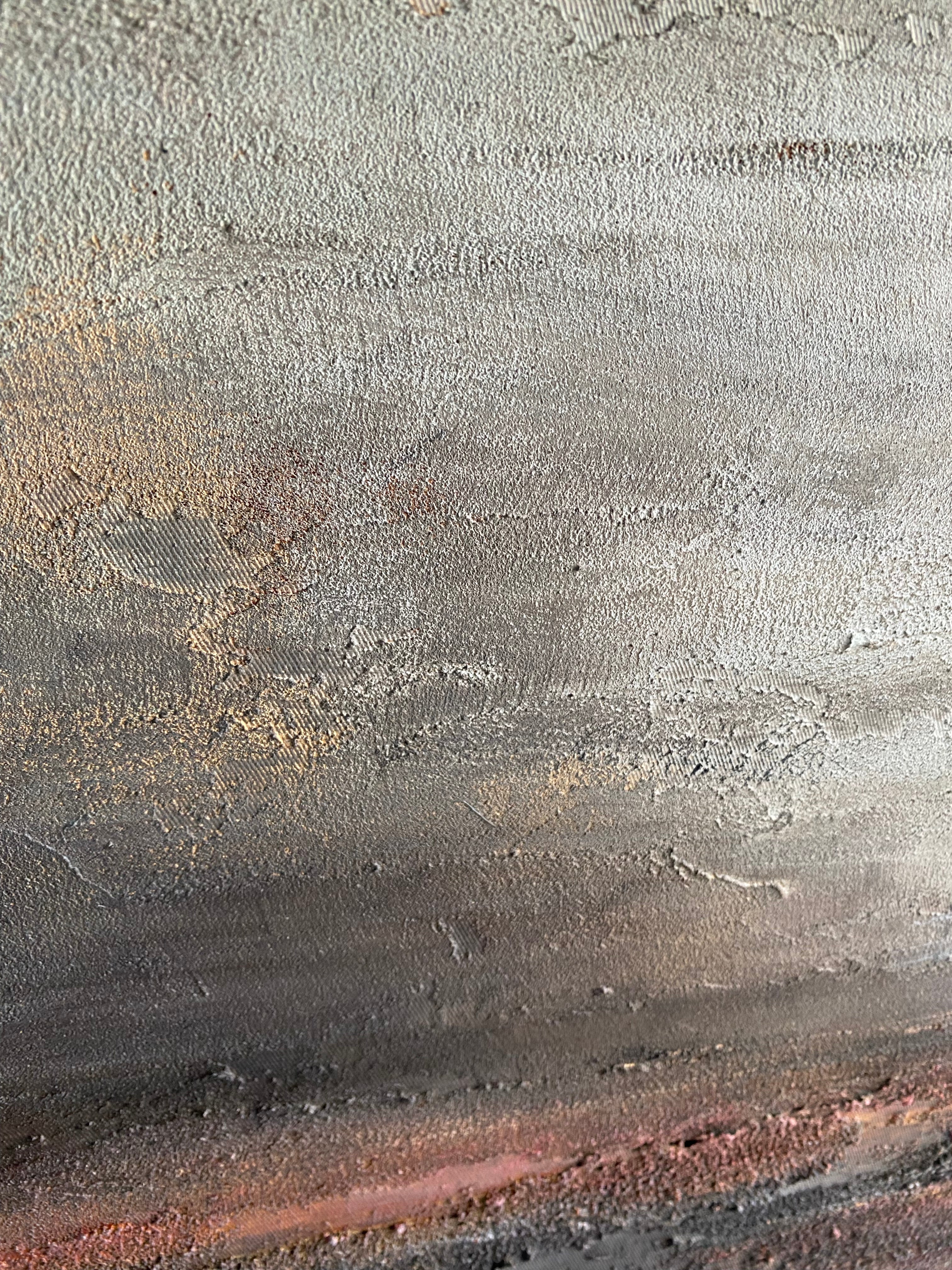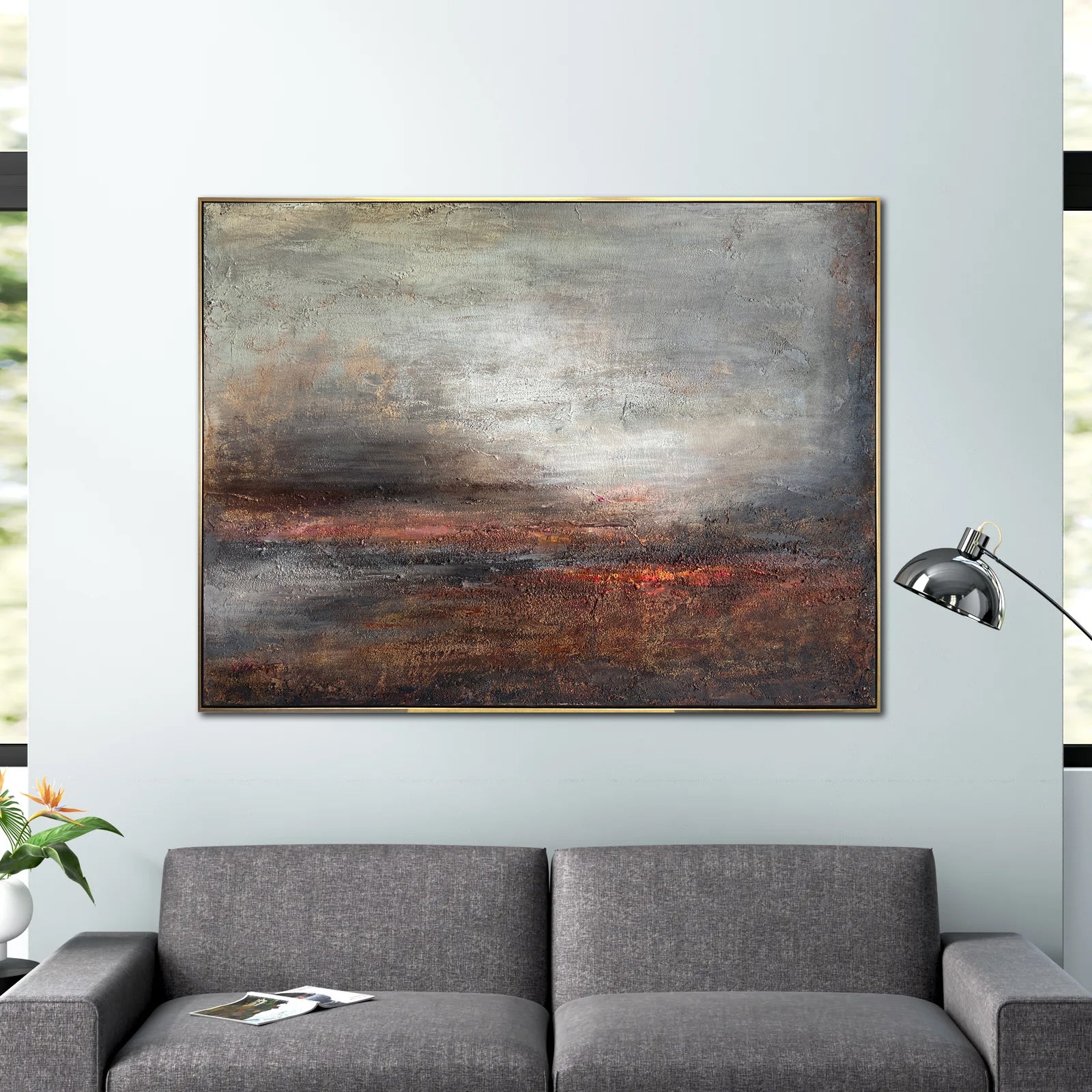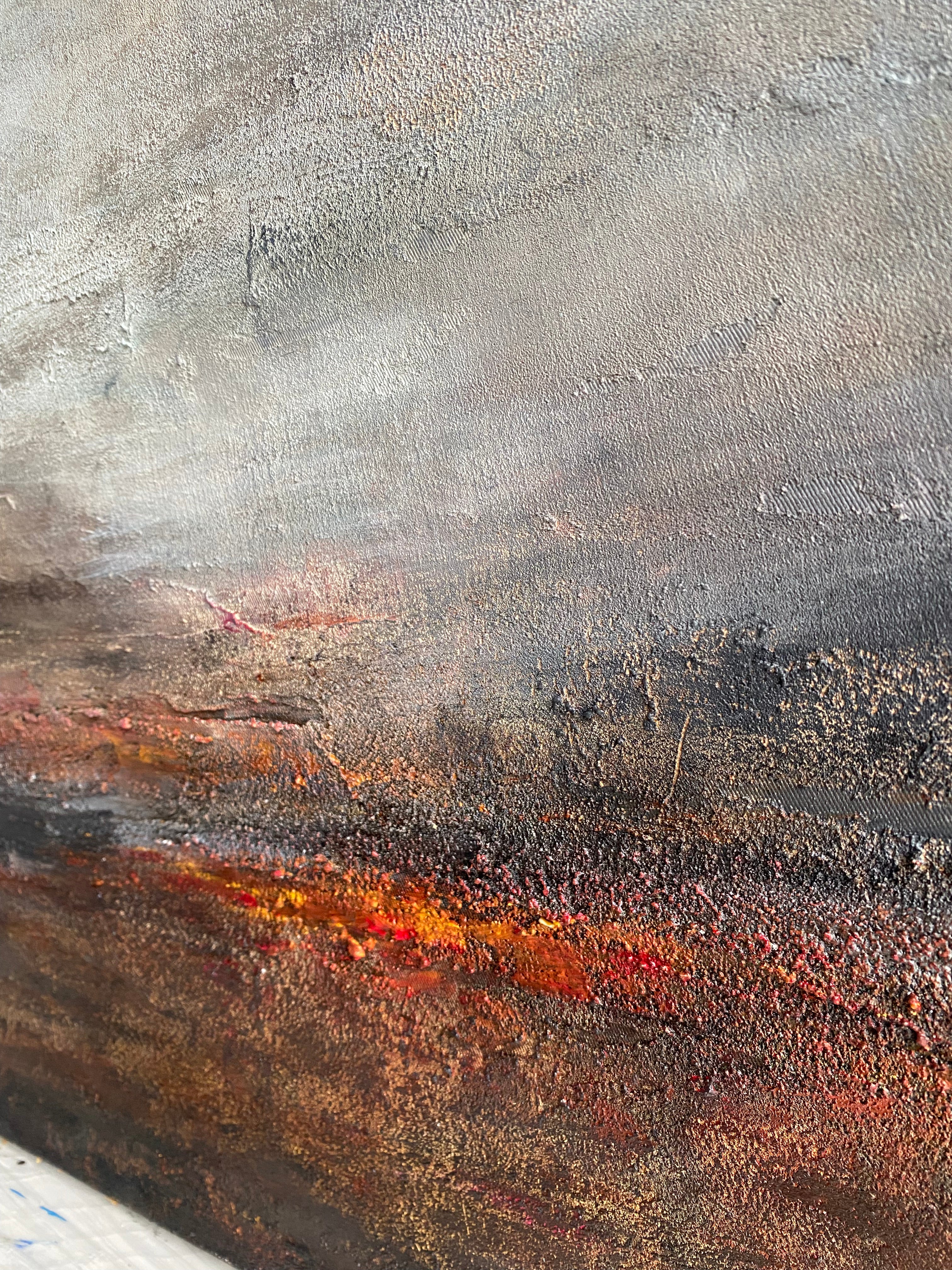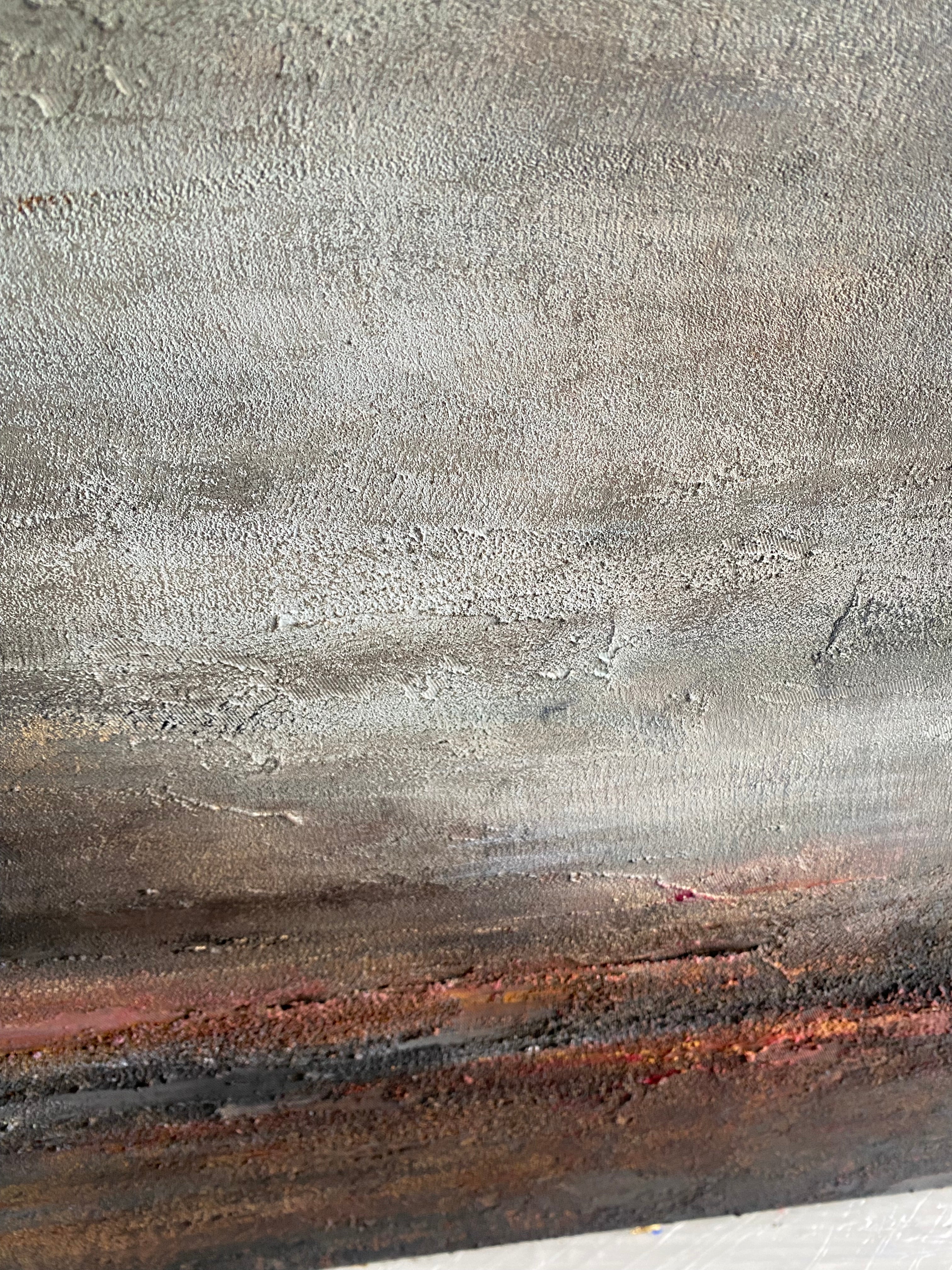 An atmospheric horizon unfolds in layers of soft grey and taupe, lit by a glowing band of rust, copper and ember red. Thick impasto adds tactile depth and a refined wabi-sabi patina—ideal for modern rustic, Japandi and minimalist interiors. Hand-painted on canvas, offered in custom sizes with an optional floater frame. Ready to hang when stretched or shipped rolled. Perfect above a sofa or bed—bring warm sunset energy and gallery character to your space.