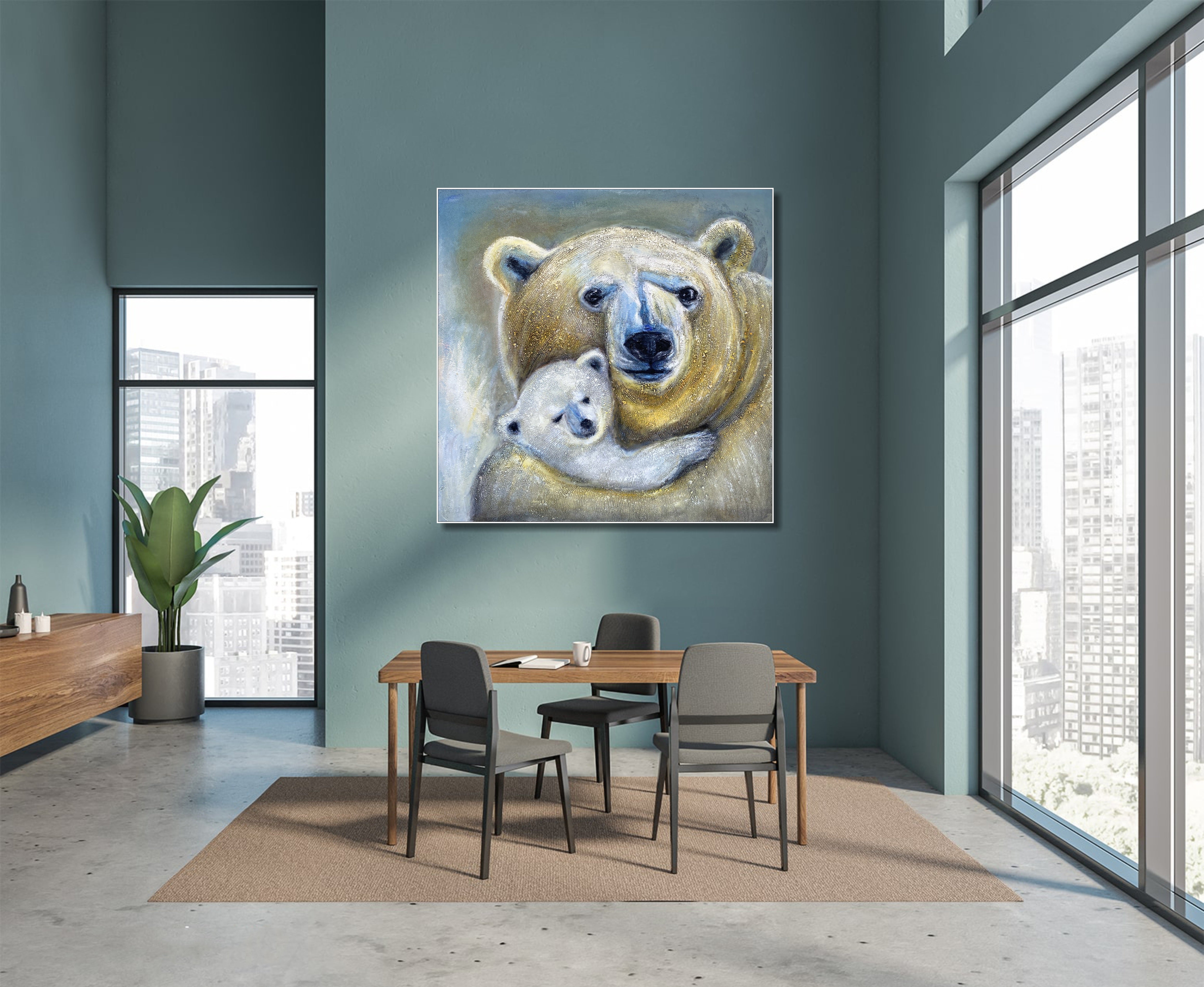 "Mother Care" captures a heartwarming moment between a mother polar bear and her cub, embodying the essence of love, protection, and warmth amidst the icy wilderness. The textured brushstrokes bring depth and movement to the fur, while the soft, muted tones create a serene and cozy atmosphere. The mother’s gentle gaze and the cub’s tender nuzzle evoke an unbreakable bond, making this painting a perfect tribute to the beauty of wildlife and the purity of maternal love. A stunning handmade piece, ideal for nature lovers seeking to bring a touch of Arctic elegance into their home.