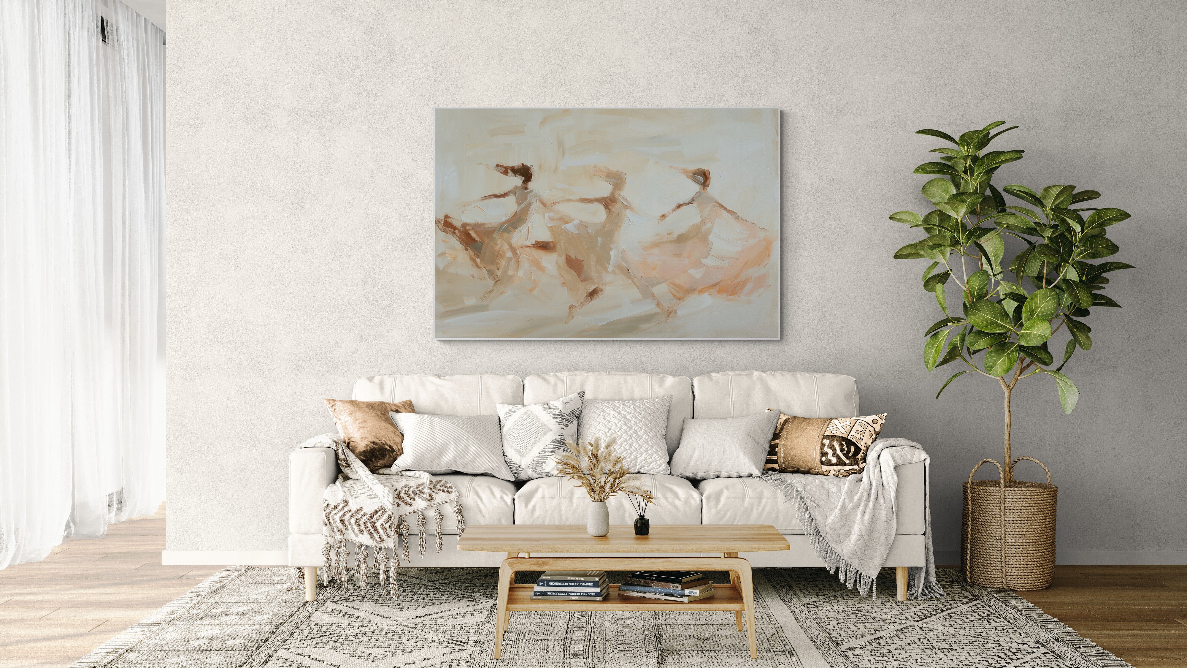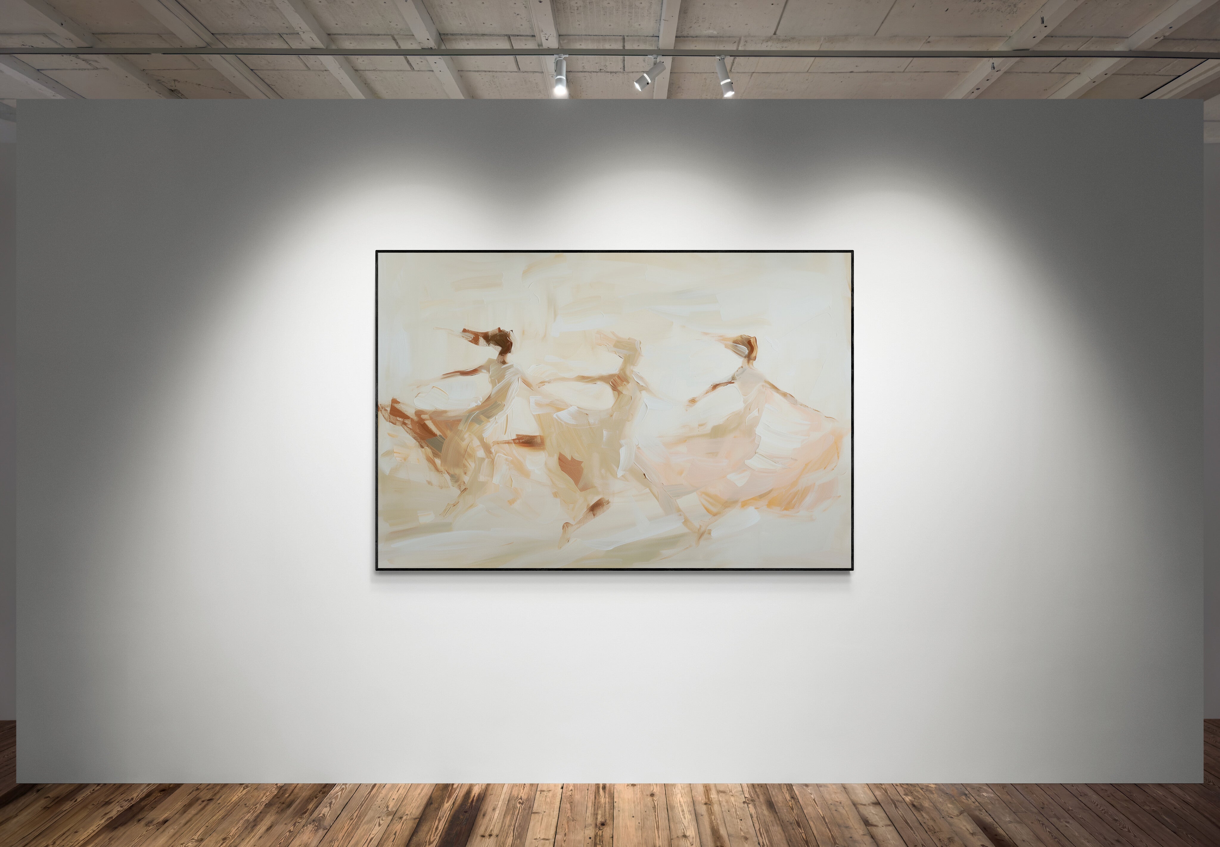 A soft and drifting tableau of three figures gliding through the air, this painting captures the delicate interplay of motion and light. Hues of blush, peach, and cream melt into each other, evoking a dreamlike state where the boundaries between figure and space blur. The flowing forms suggest a dance in slow motion—graceful, weightless, and fleeting. The viewer is invited into a moment suspended in time, where movement becomes memory and the atmosphere whispers of quiet elegance.