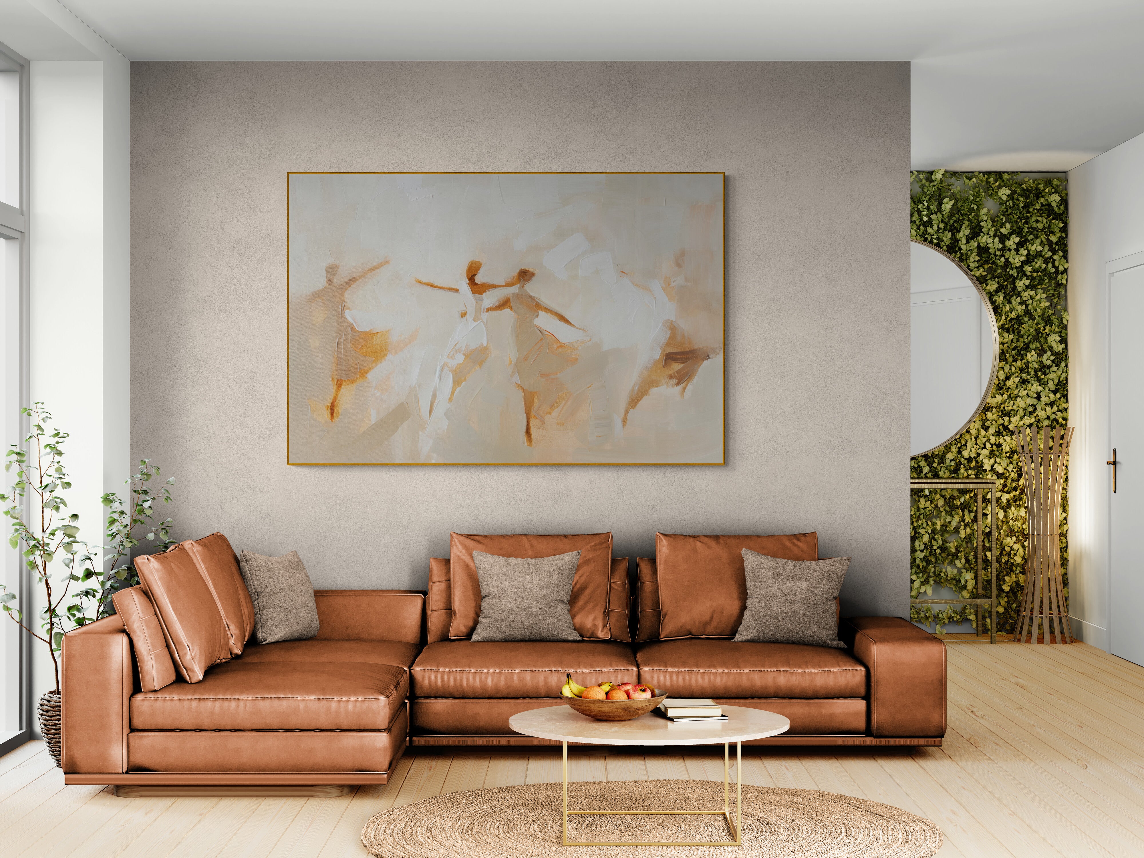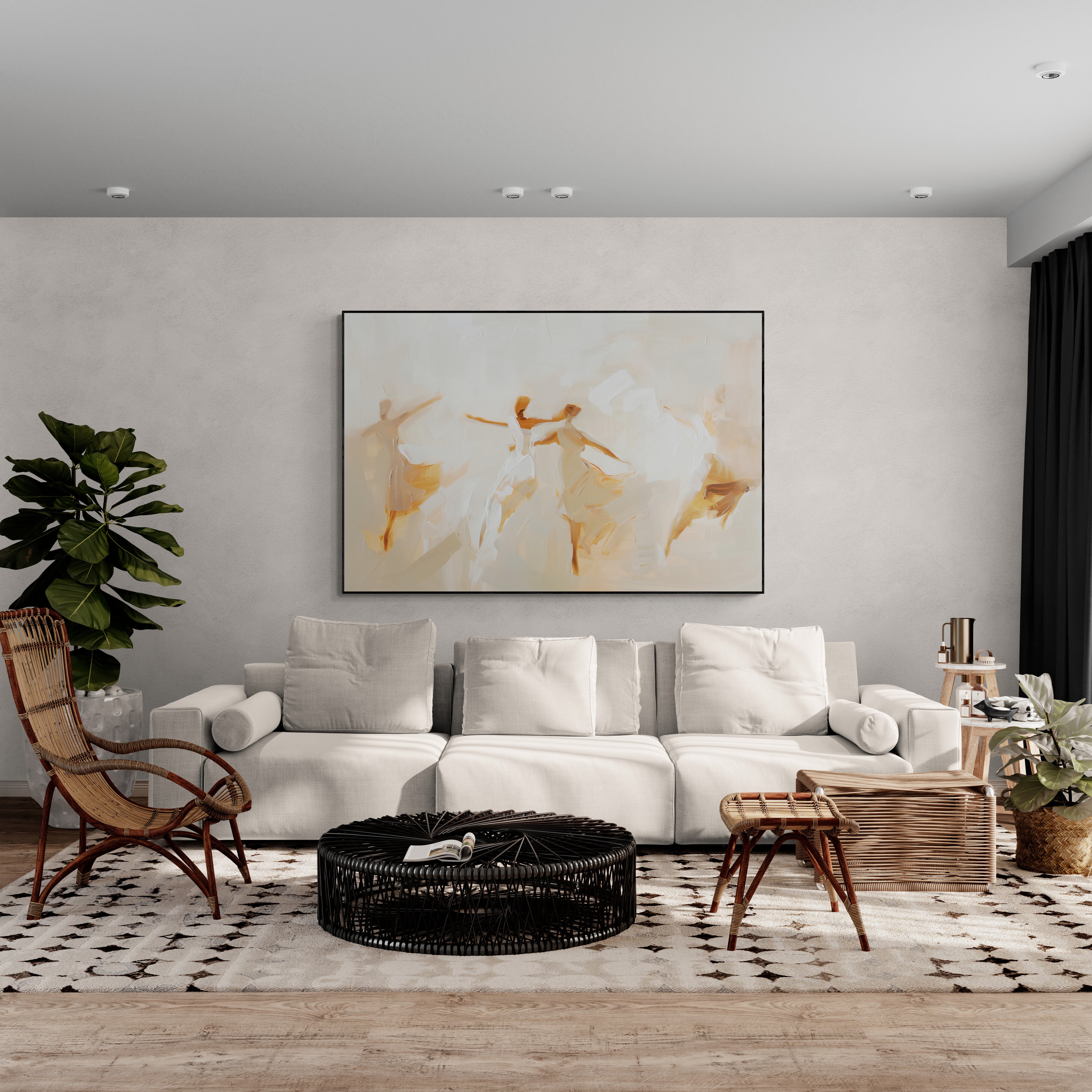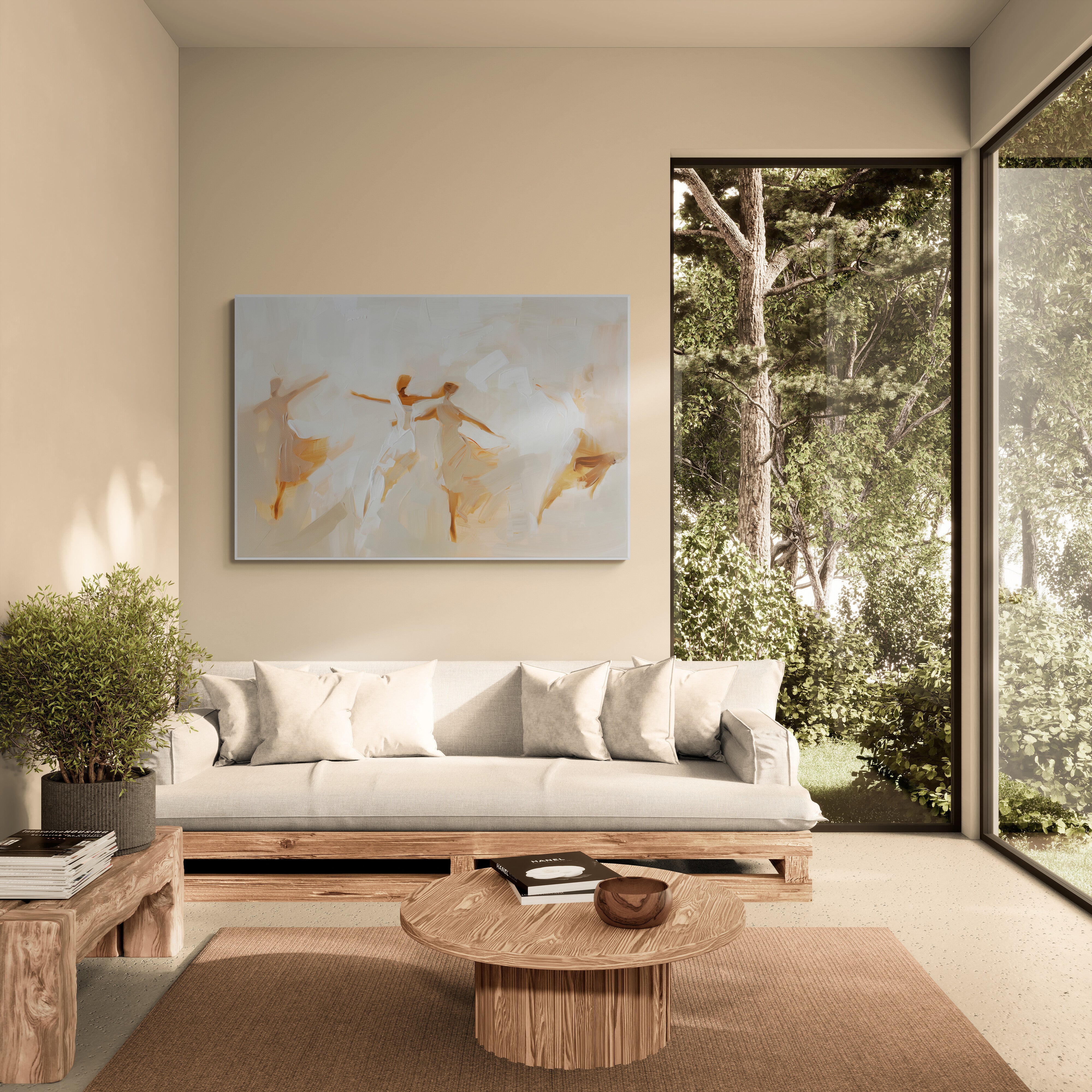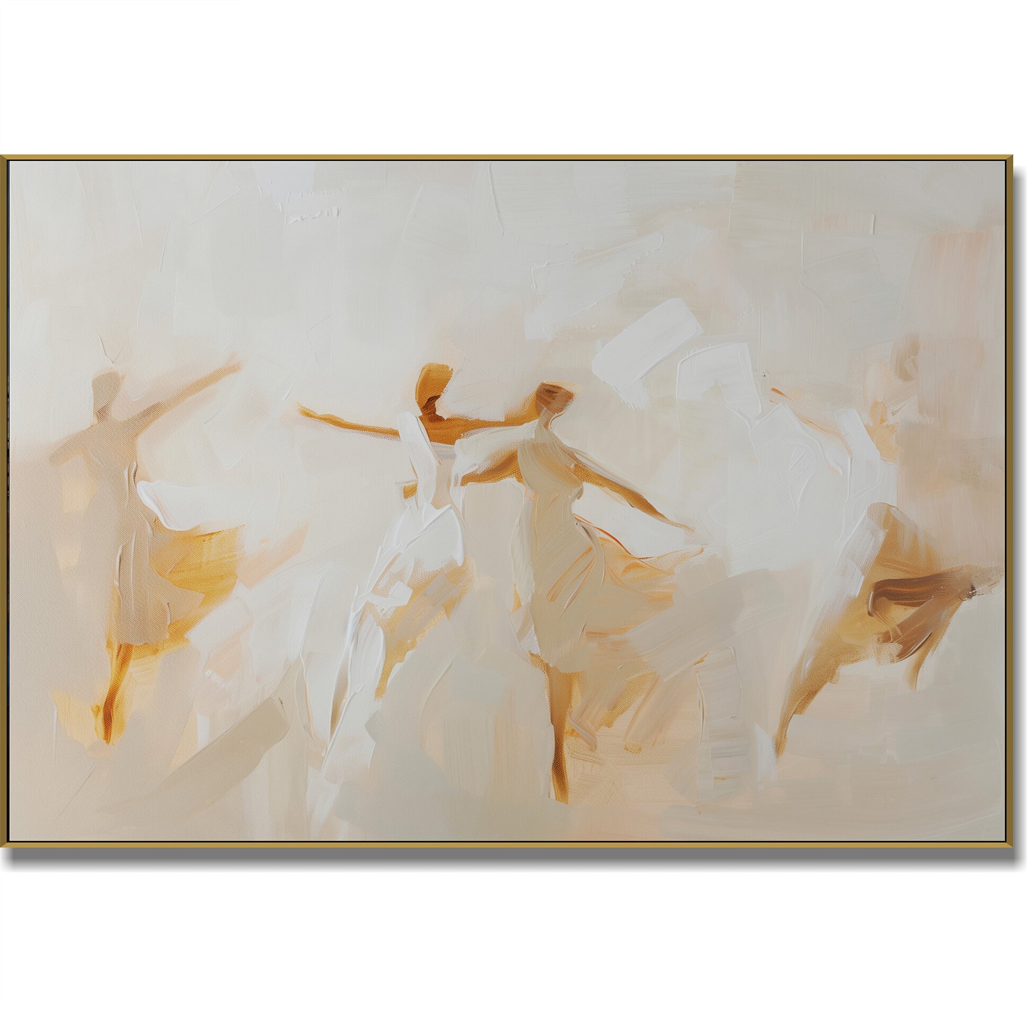 This painting captures the fleeting elegance of dancers suspended in a moment of pure, weightless grace. Soft, sweeping brushstrokes blend warm amber tones with luminous whites, creating figures that seem to emerge from light itself. Their flowing forms evoke a sense of harmony and quiet joy, as if they are dancing not on a stage, but within a dream. The abstract style enhances the ethereal atmosphere, inviting the viewer to feel the rhythm, the softness, and the serenity of movement translated into paint.