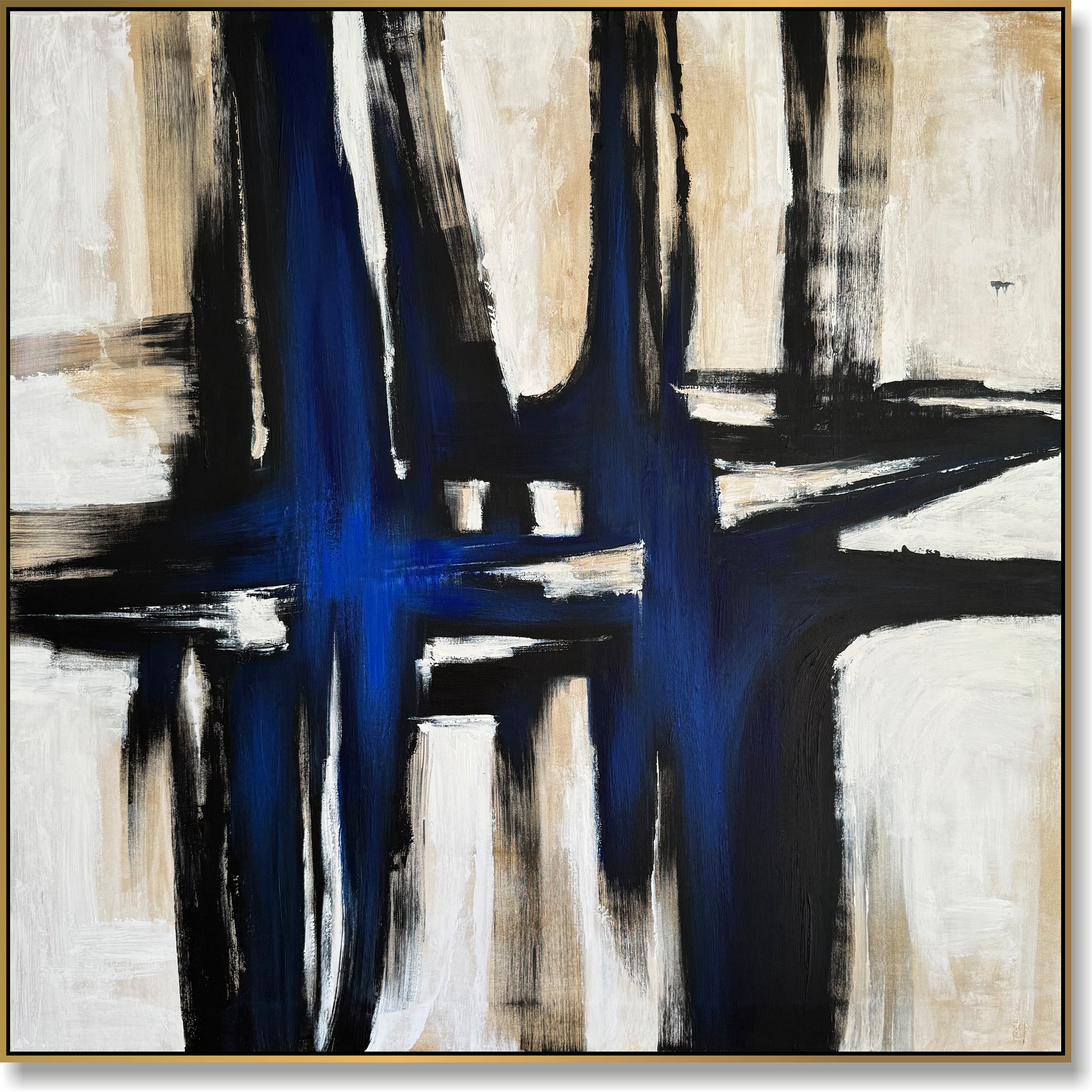 Elevate your space with this modern abstract art piece, featuring minimalist geometric shapes and a striking color palette of black, blue, beige, and white. Perfect for contemporary interiors, this large canvas painting combines subtle elegance with bold accents. Its industrial aesthetics and abstract lines create a sophisticated focal point in any room. Ideal for those seeking to enhance their decor with a blend of modern design and minimalist expression. Transform your home with this unique artwork.