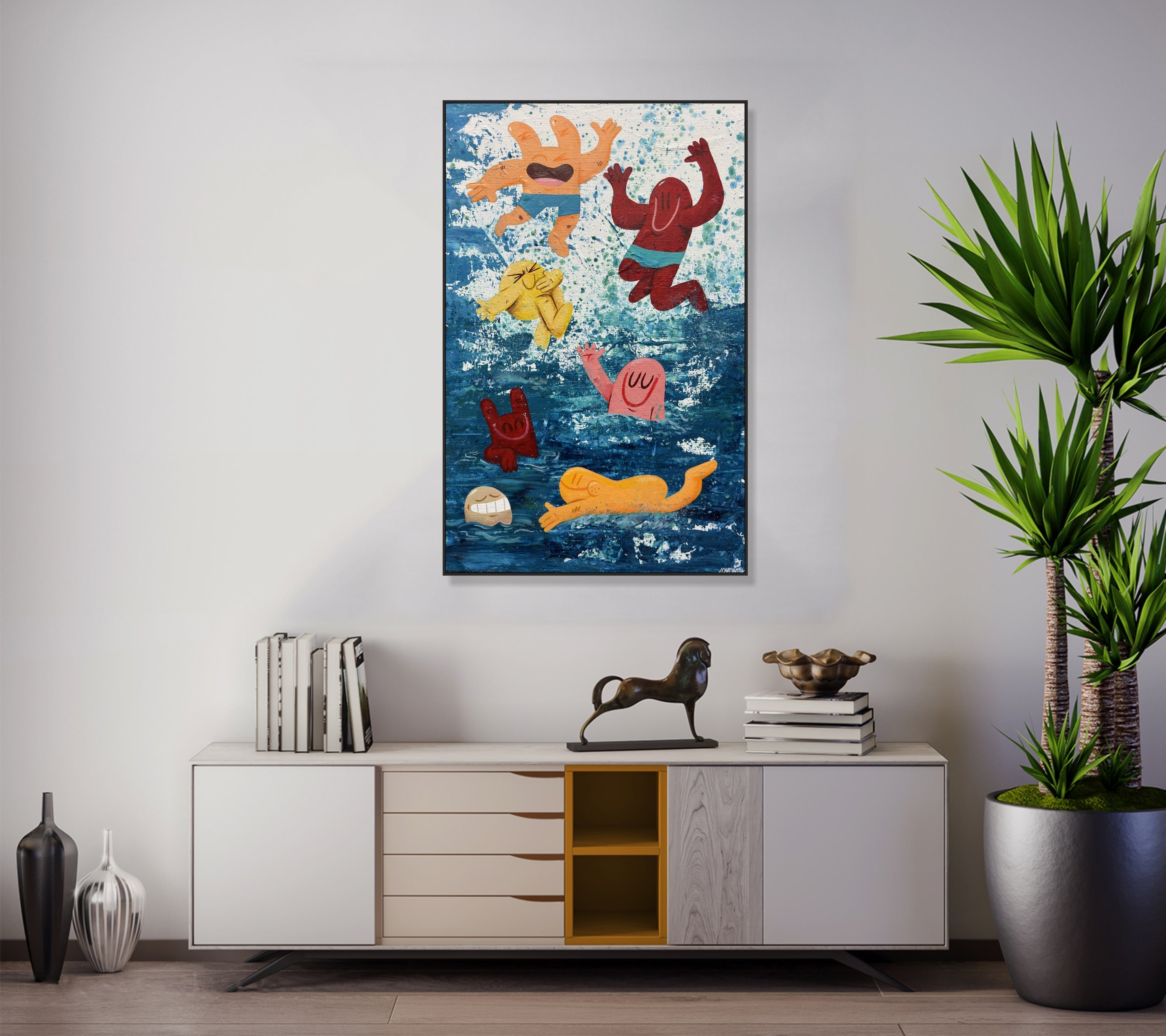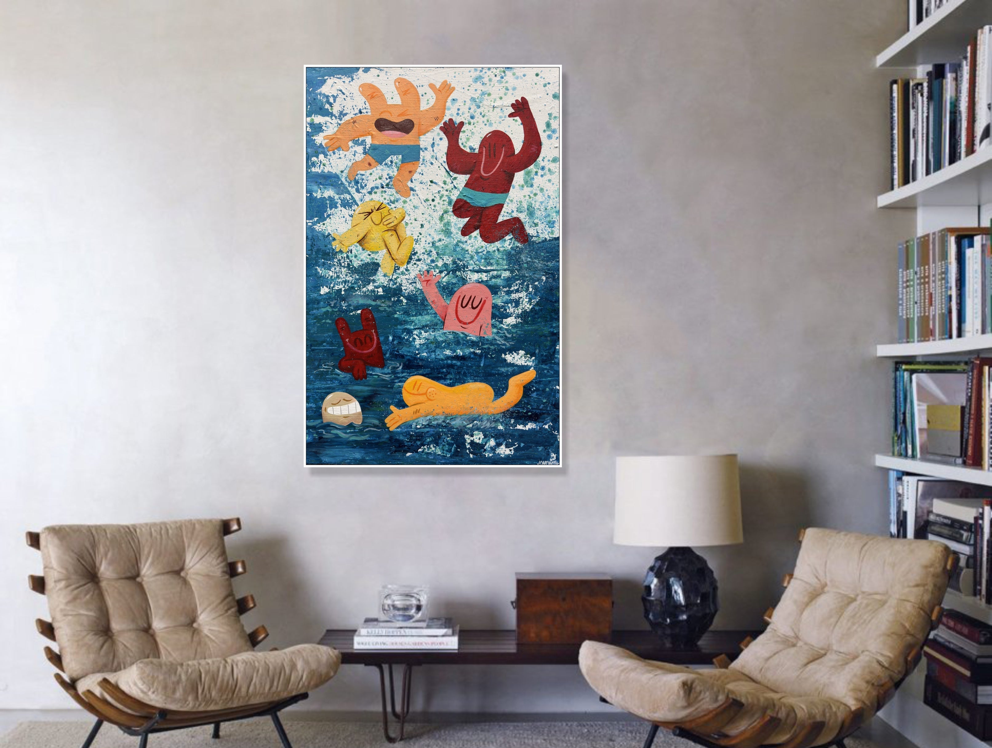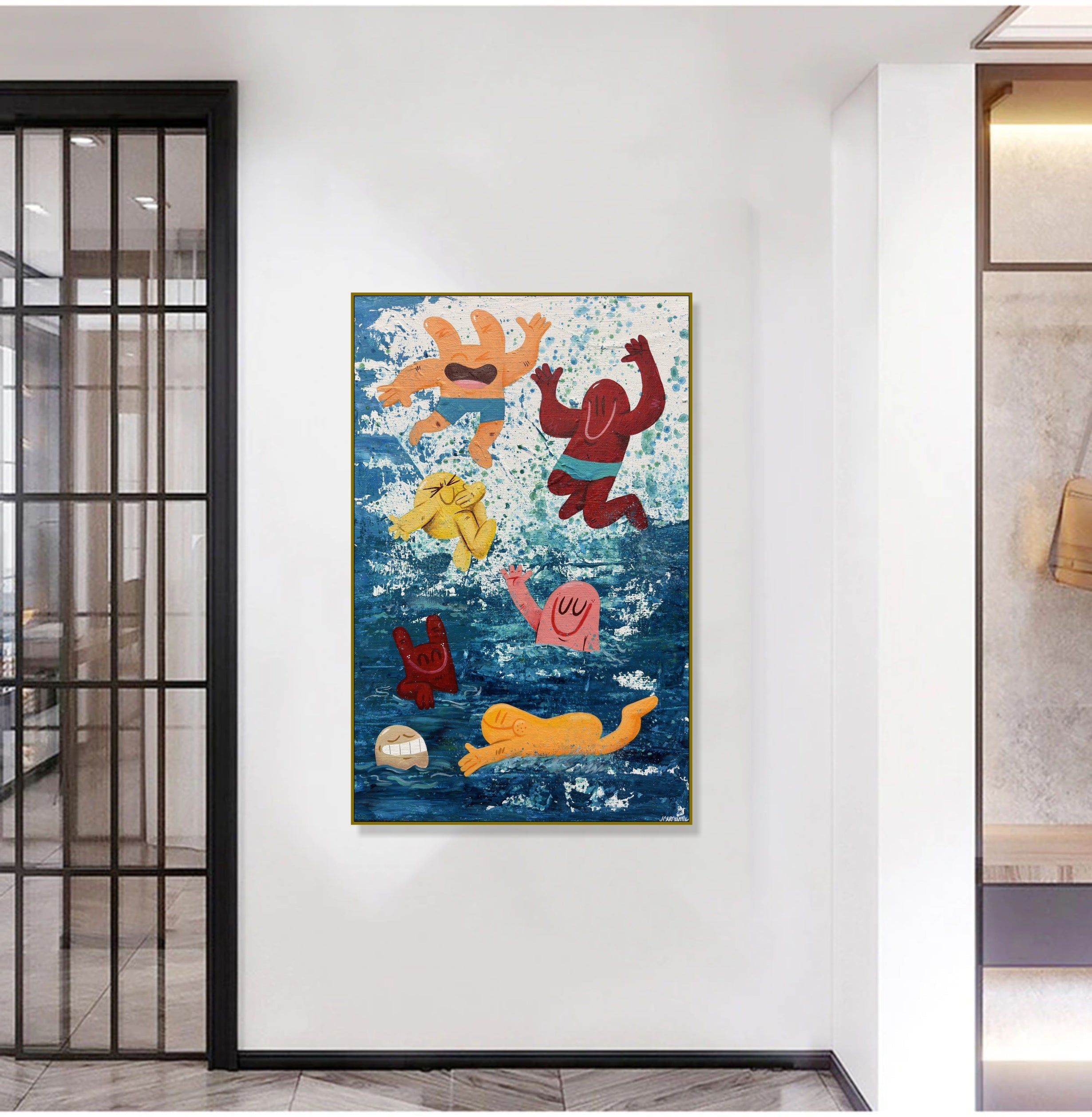 Bring joy and energy into your space with this vibrant pop art swimming painting, featuring playful cartoon figures diving into a deep blue sea. Bursting with bold colors, dynamic textures, and a lively sense of movement, it’s perfect for modern interiors, kids’ rooms, or collectors who love whimsical contemporary art. Hand-painted with professional materials, this one-of-a-kind artwork adds fun, happiness, and personality to any wall.