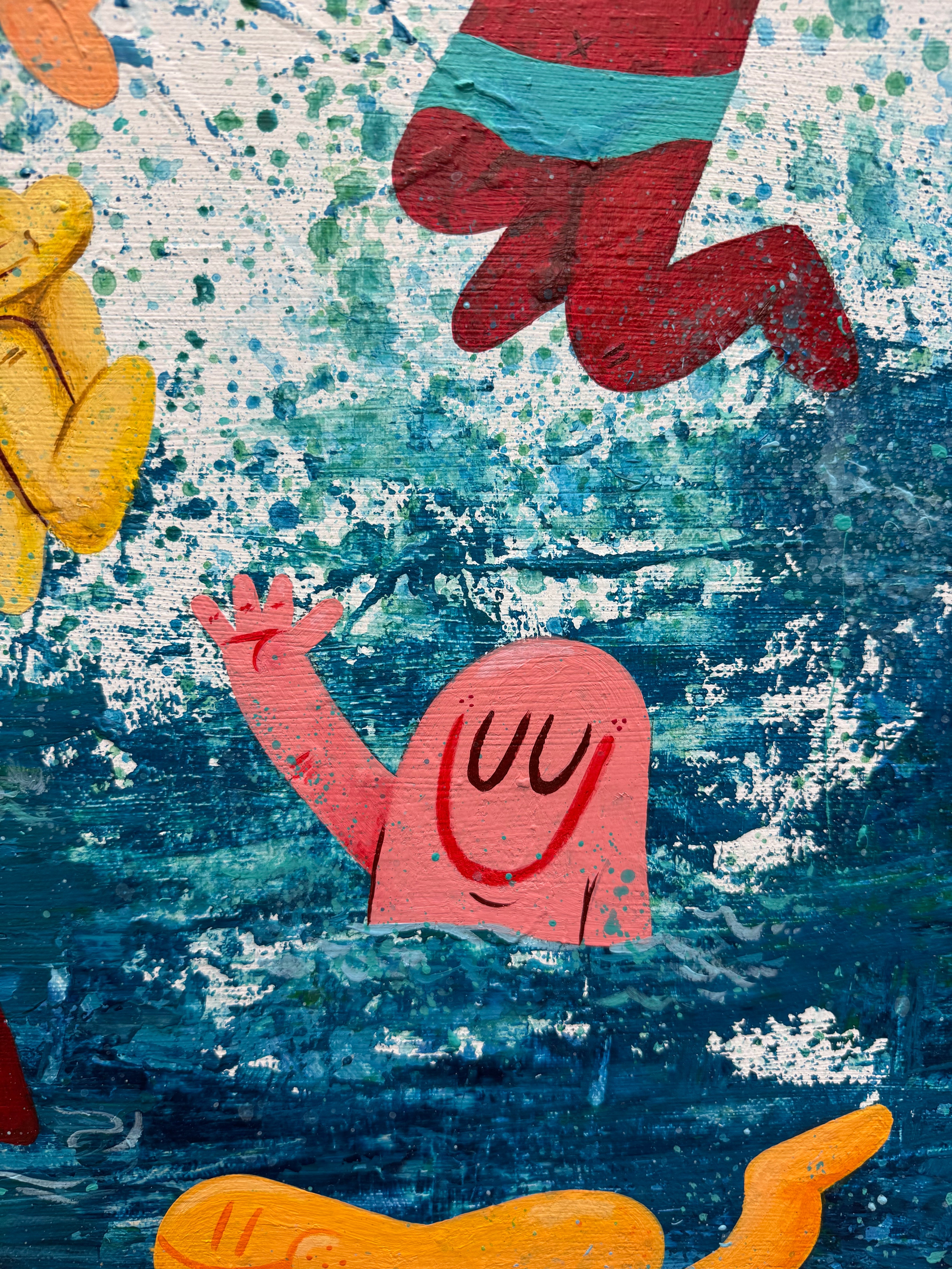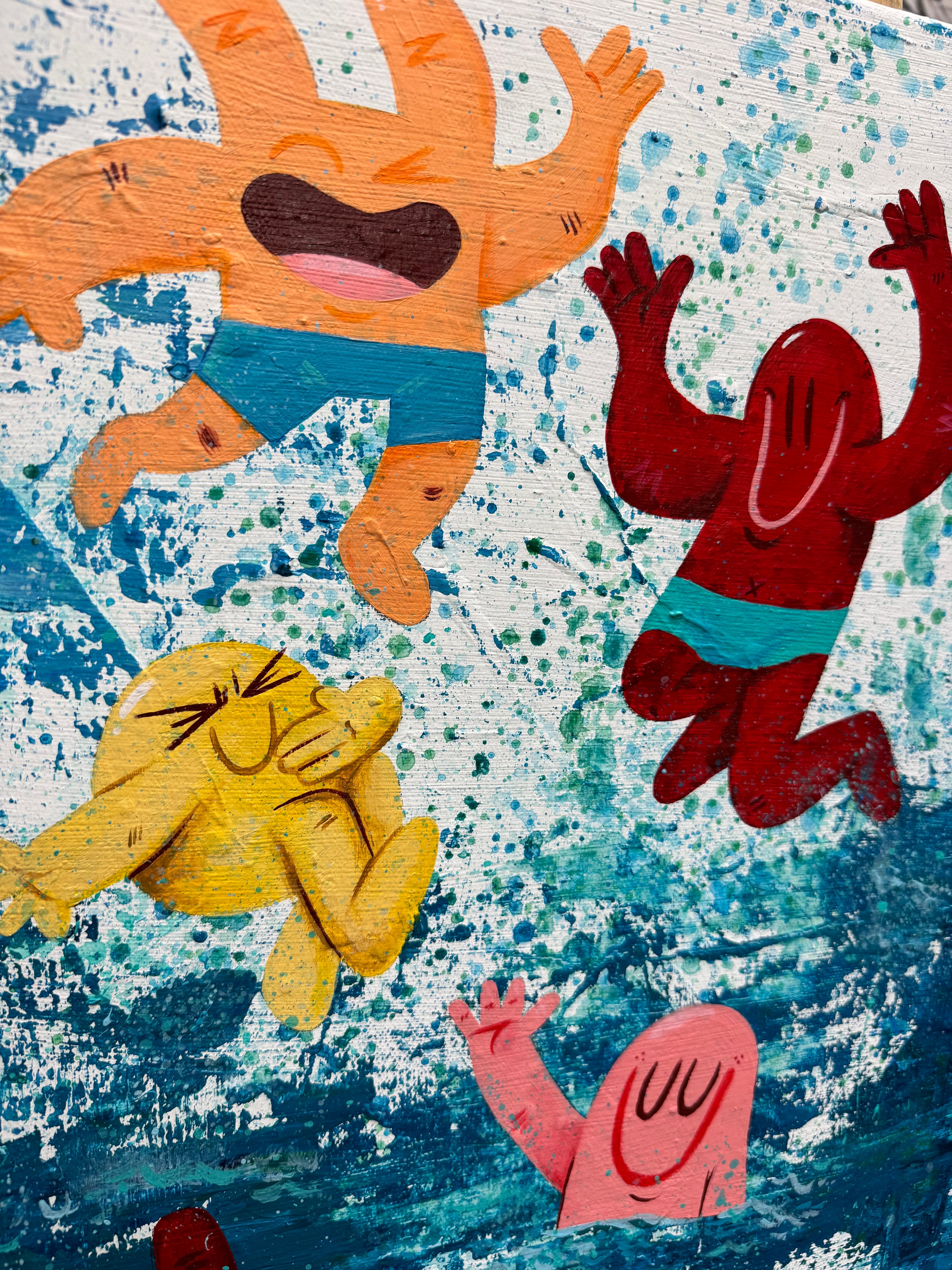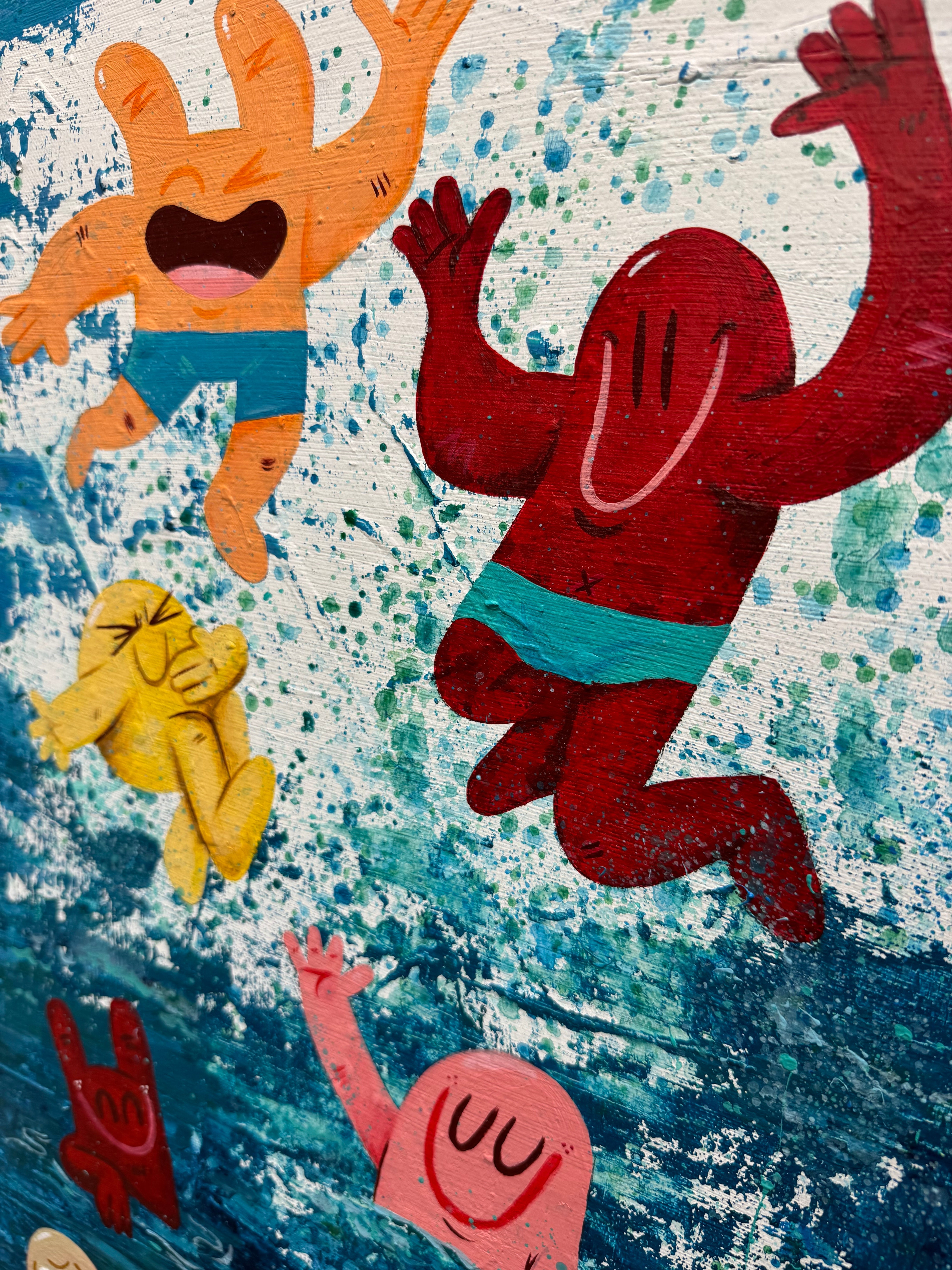 Bring joy and energy into your space with this vibrant pop art swimming painting, featuring playful cartoon figures diving into a deep blue sea. Bursting with bold colors, dynamic textures, and a lively sense of movement, it’s perfect for modern interiors, kids’ rooms, or collectors who love whimsical contemporary art. Hand-painted with professional materials, this one-of-a-kind artwork adds fun, happiness, and personality to any wall.