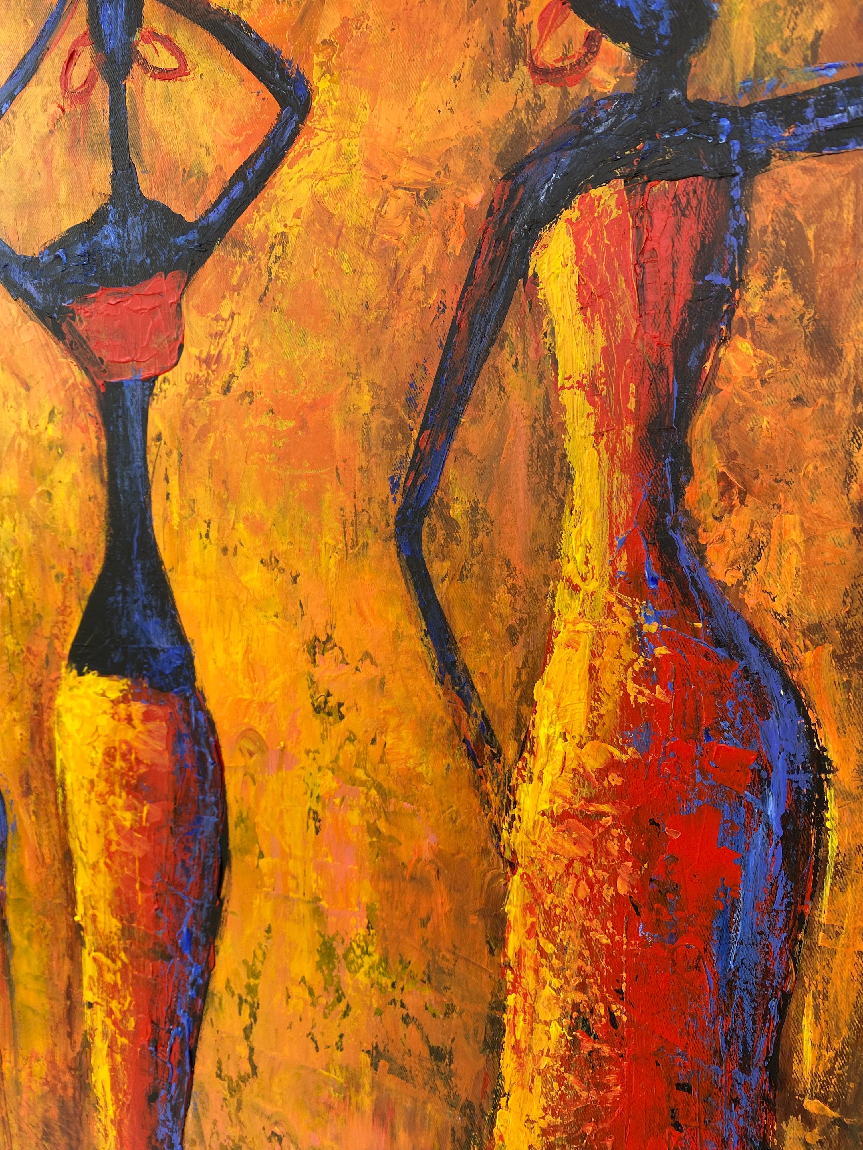 Cultural Abstract African Women Painting On Canvas Original Bold Tribal Art in Warm Hues Stylish Wall Decor for Living Room | SUNSET CARRIERS 40"x40" | Trend Gallery Art Great Britain – Trendgallery.co.uk