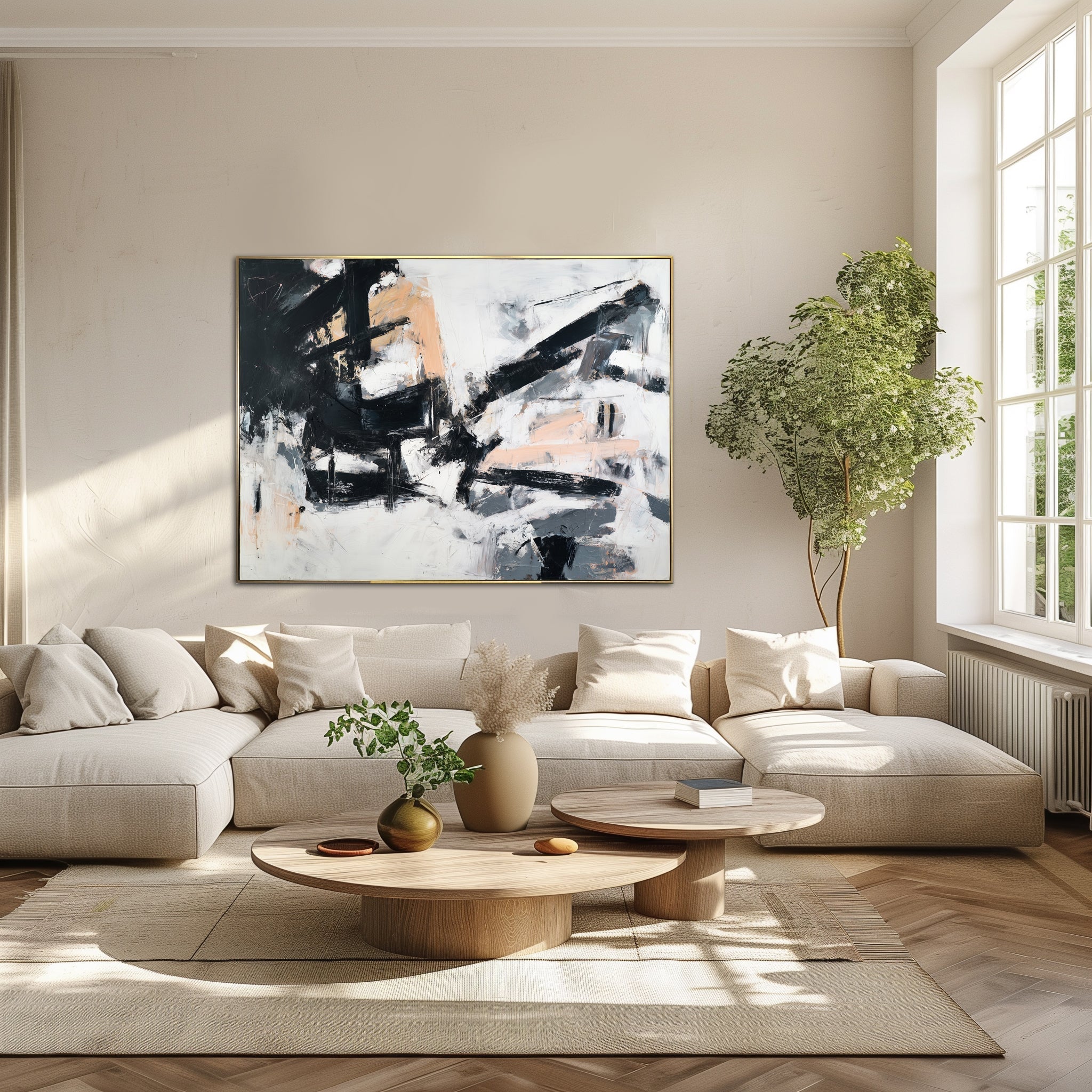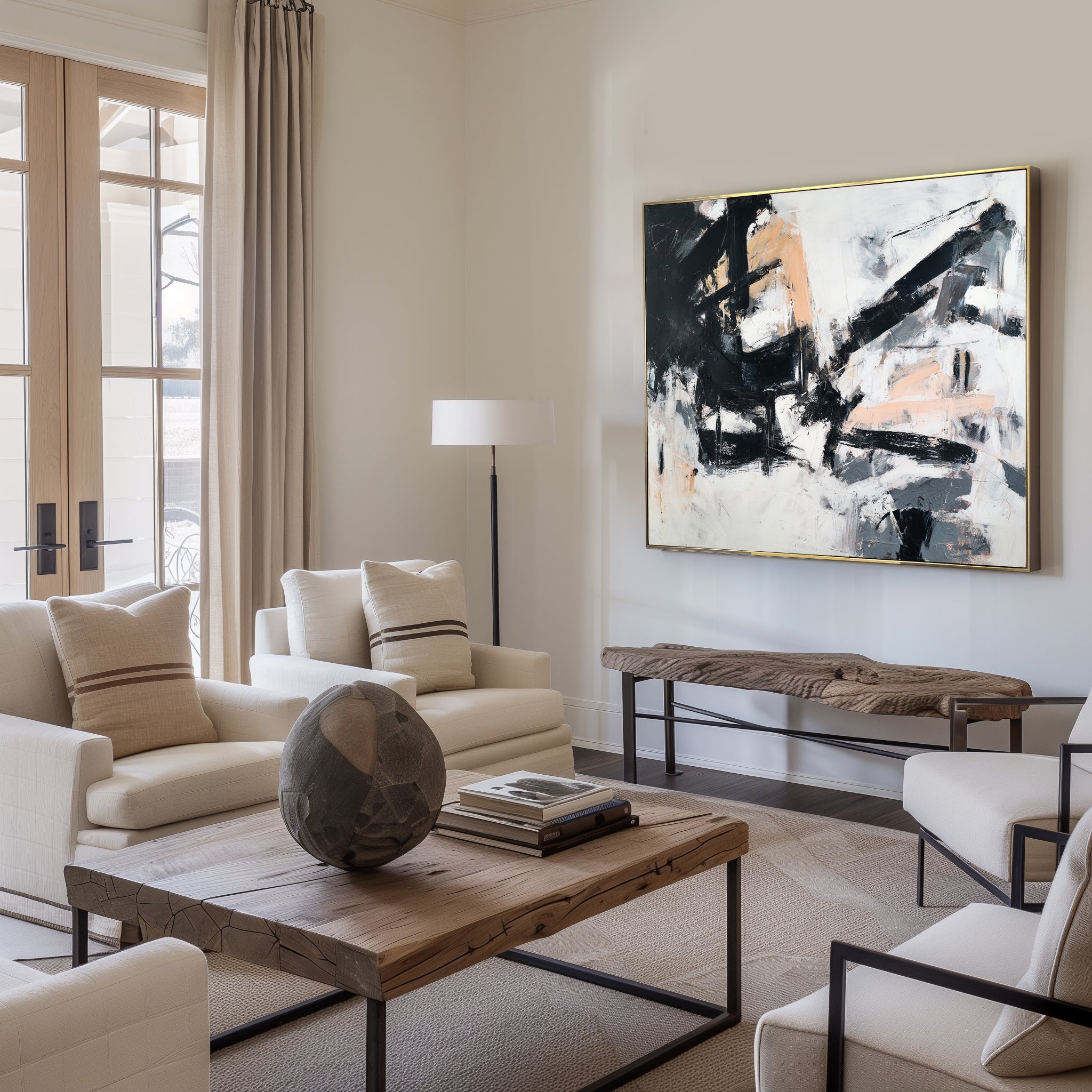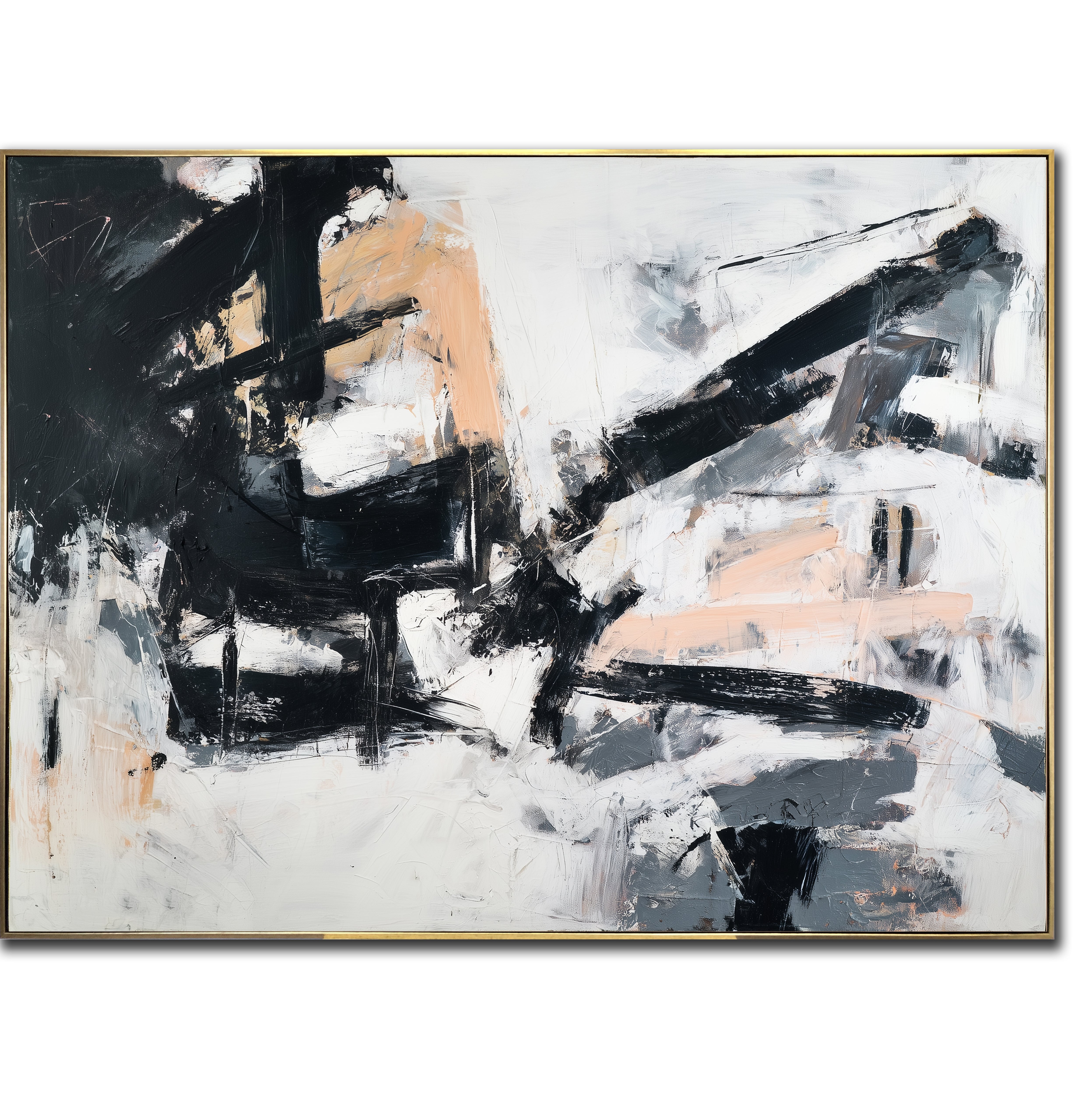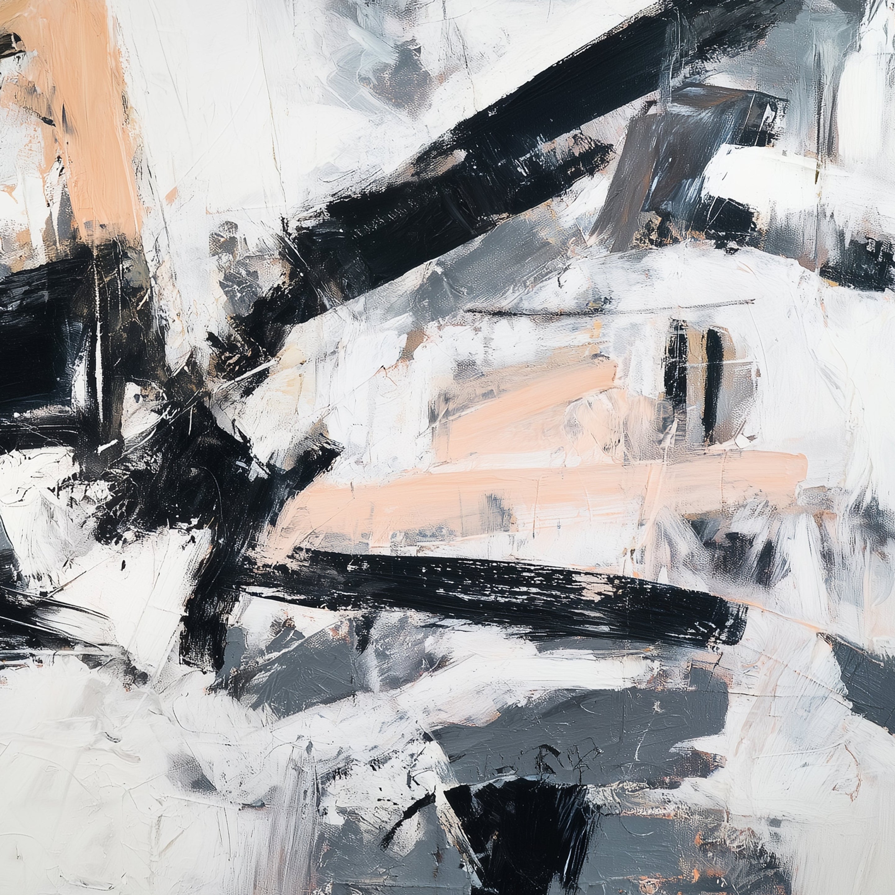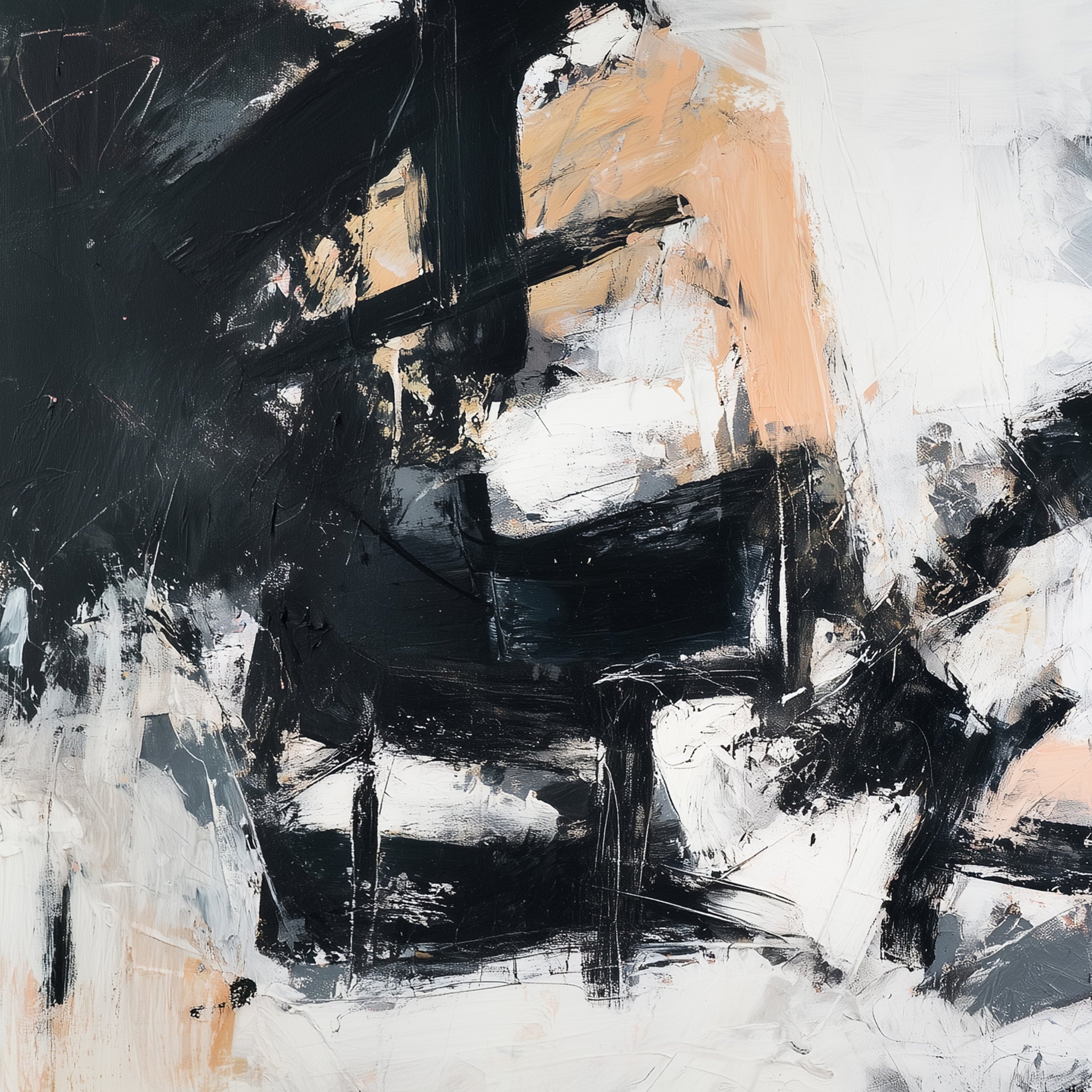 “Echoes in Motion” is a bold abstract expressionist piece featuring dynamic black strokes layered over soft peach, white, and gray tones. Its textured movement brings balance and energy to modern interiors while the neutral palette ensures versatile styling in living rooms, offices, or hallways. This minimalist canvas art adds sophistication and contemporary edge to any wall, making it a perfect statement piece for design-forward spaces.