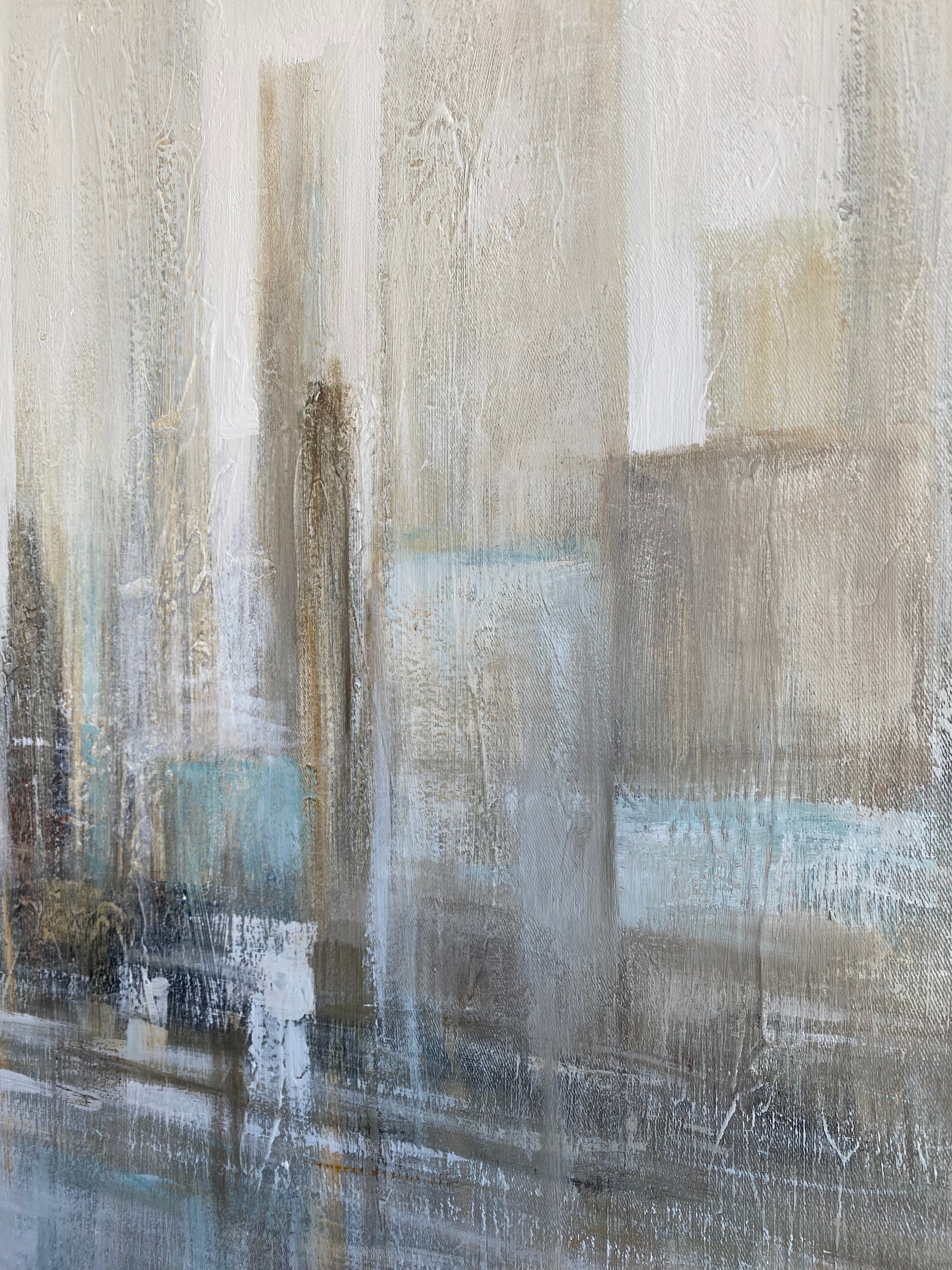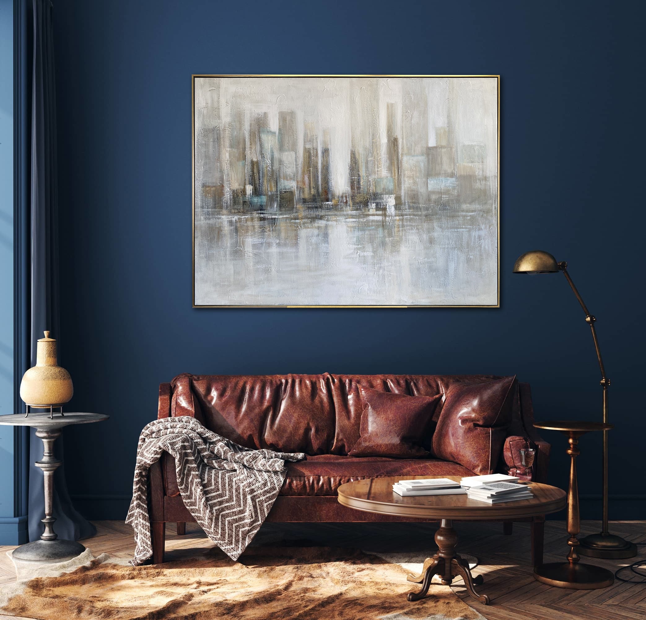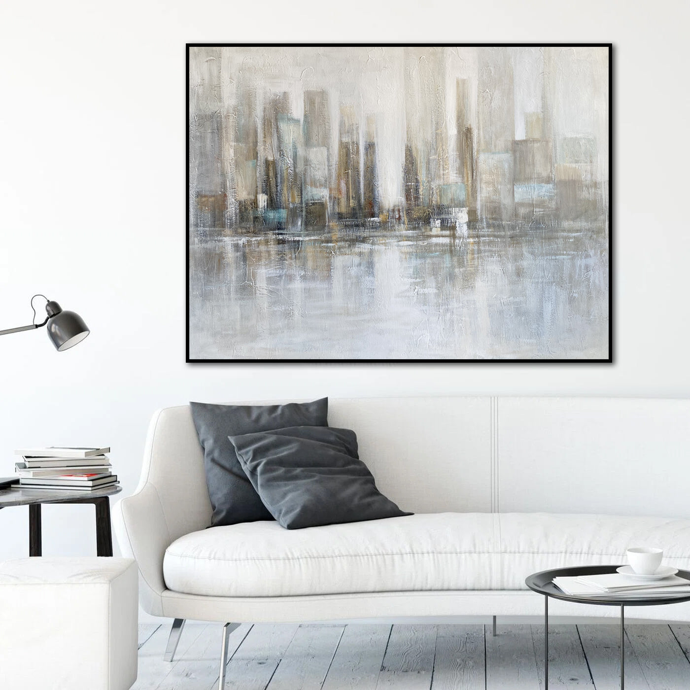 Calm, modern and sophisticated—this textured abstract cityscape captures a misty skyline mirrored on water. Layers of soft grey, taupe and ivory with hints of steel blue and warm gold create a serene neutral palette that fits living rooms, bedrooms and offices. Hand-painted on canvas with subtle impasto for depth. Choose custom size and optional floater frame. Ready to hang when stretched or shipped rolled. Color tweaks available—bring airy urban elegance to your wall.
