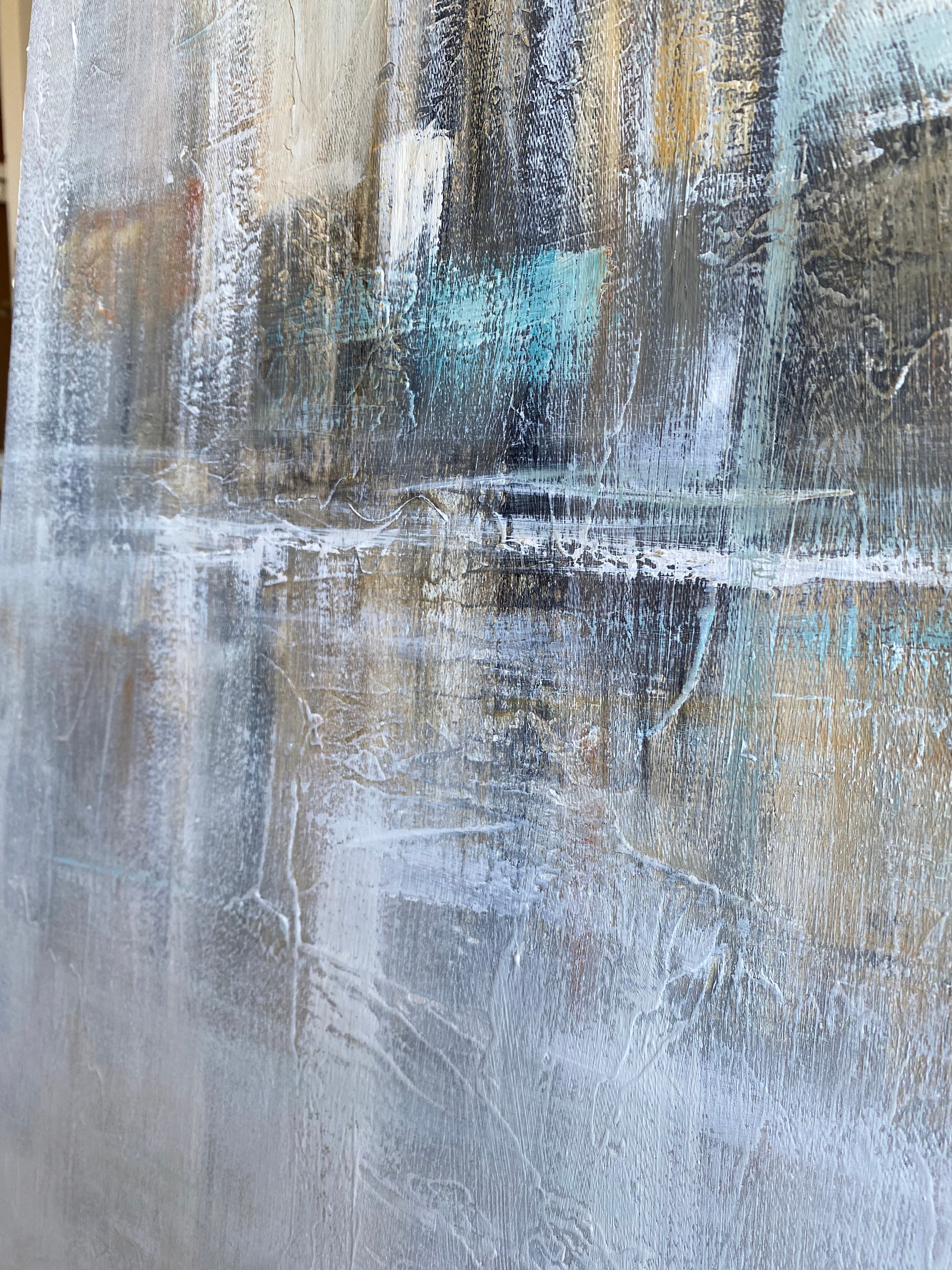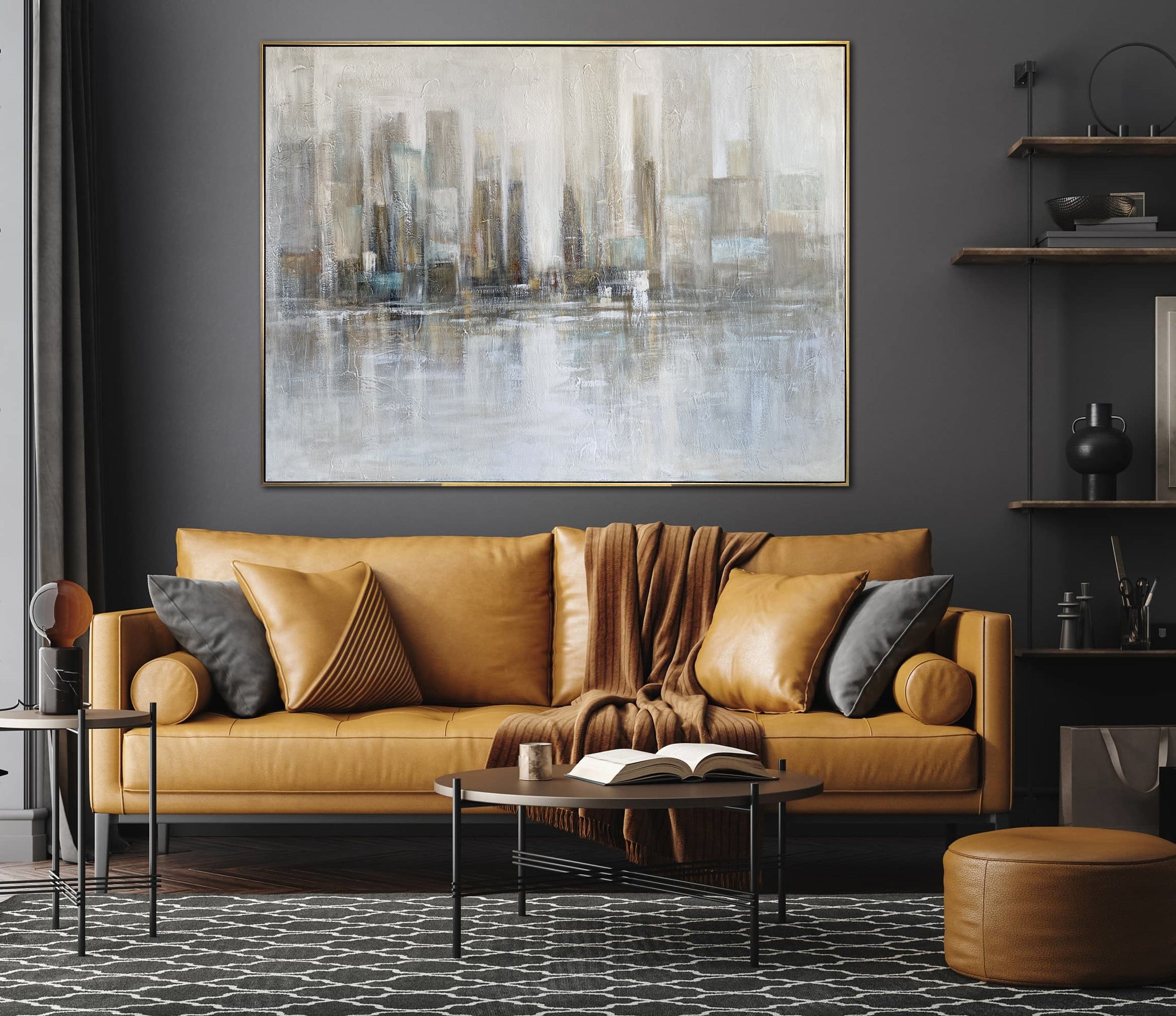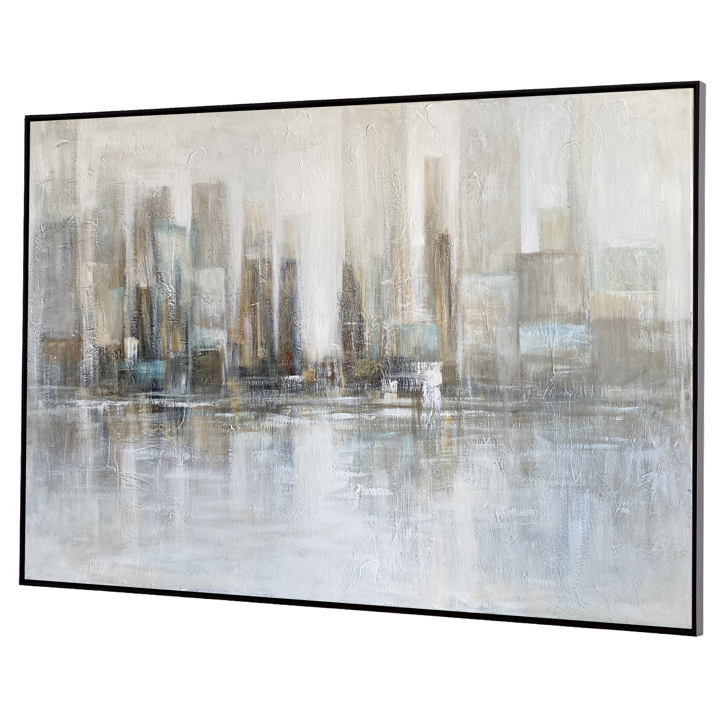 Calm, modern and sophisticated—this textured abstract cityscape captures a misty skyline mirrored on water. Layers of soft grey, taupe and ivory with hints of steel blue and warm gold create a serene neutral palette that fits living rooms, bedrooms and offices. Hand-painted on canvas with subtle impasto for depth. Choose custom size and optional floater frame. Ready to hang when stretched or shipped rolled. Color tweaks available—bring airy urban elegance to your wall.