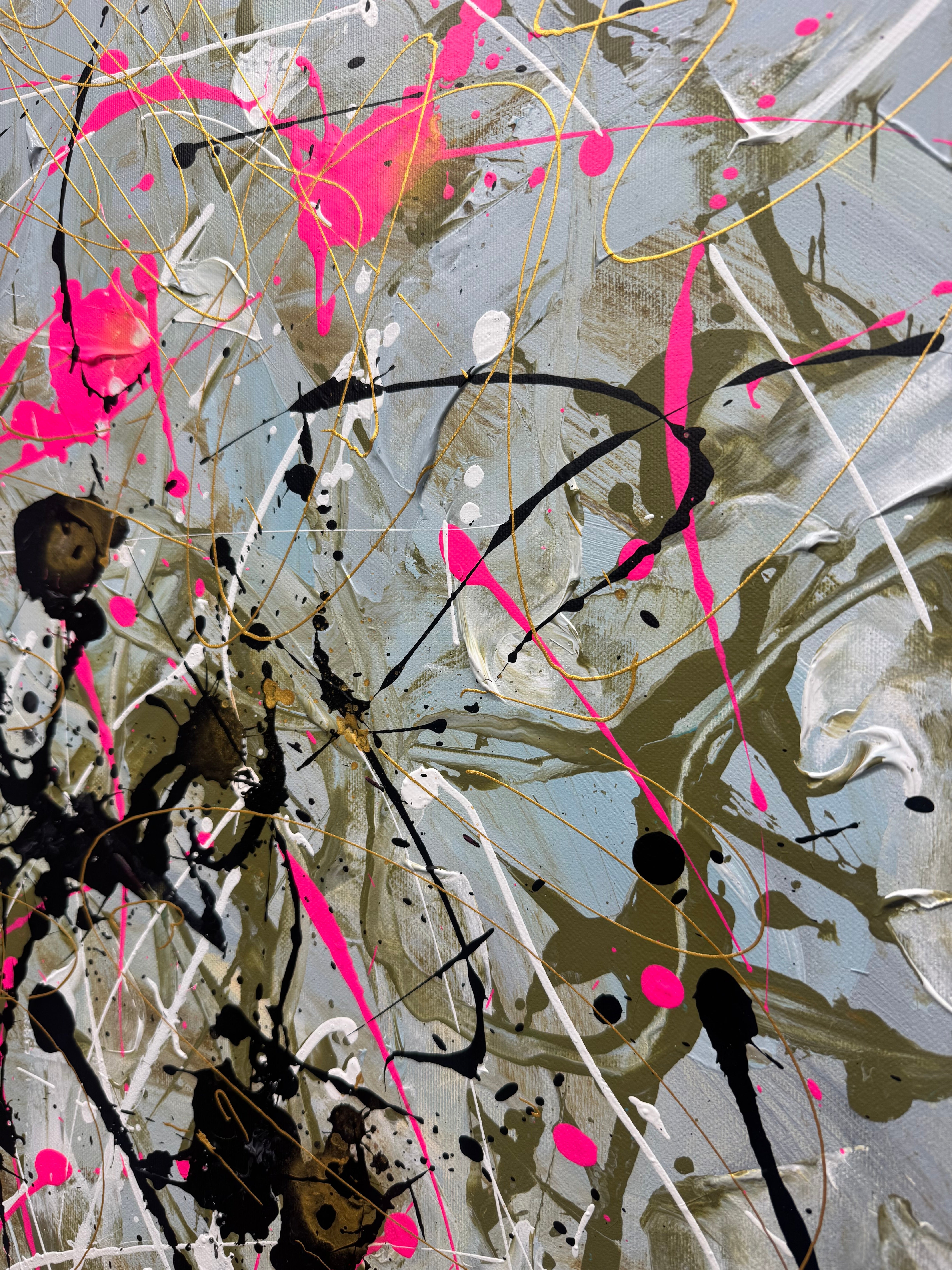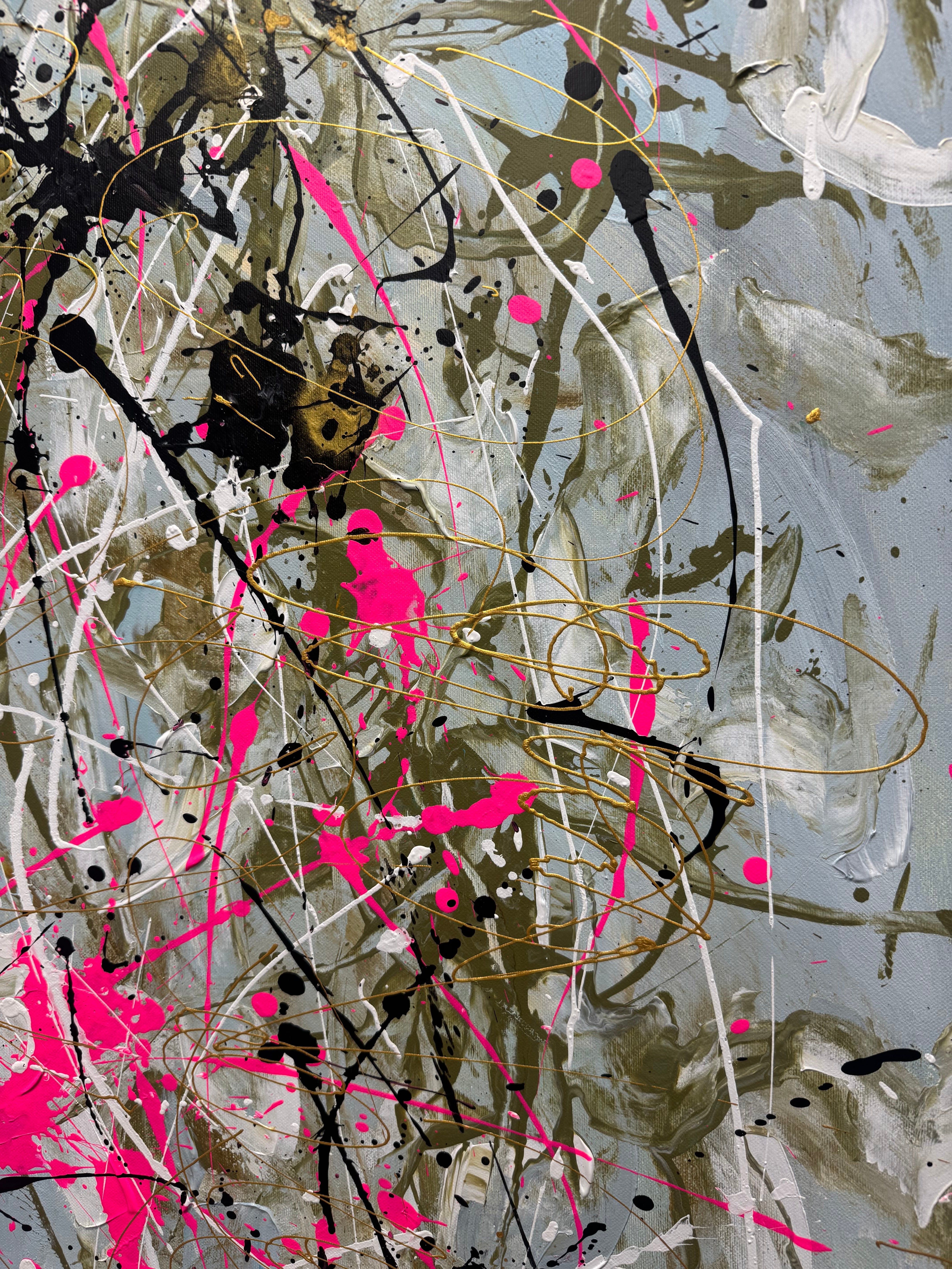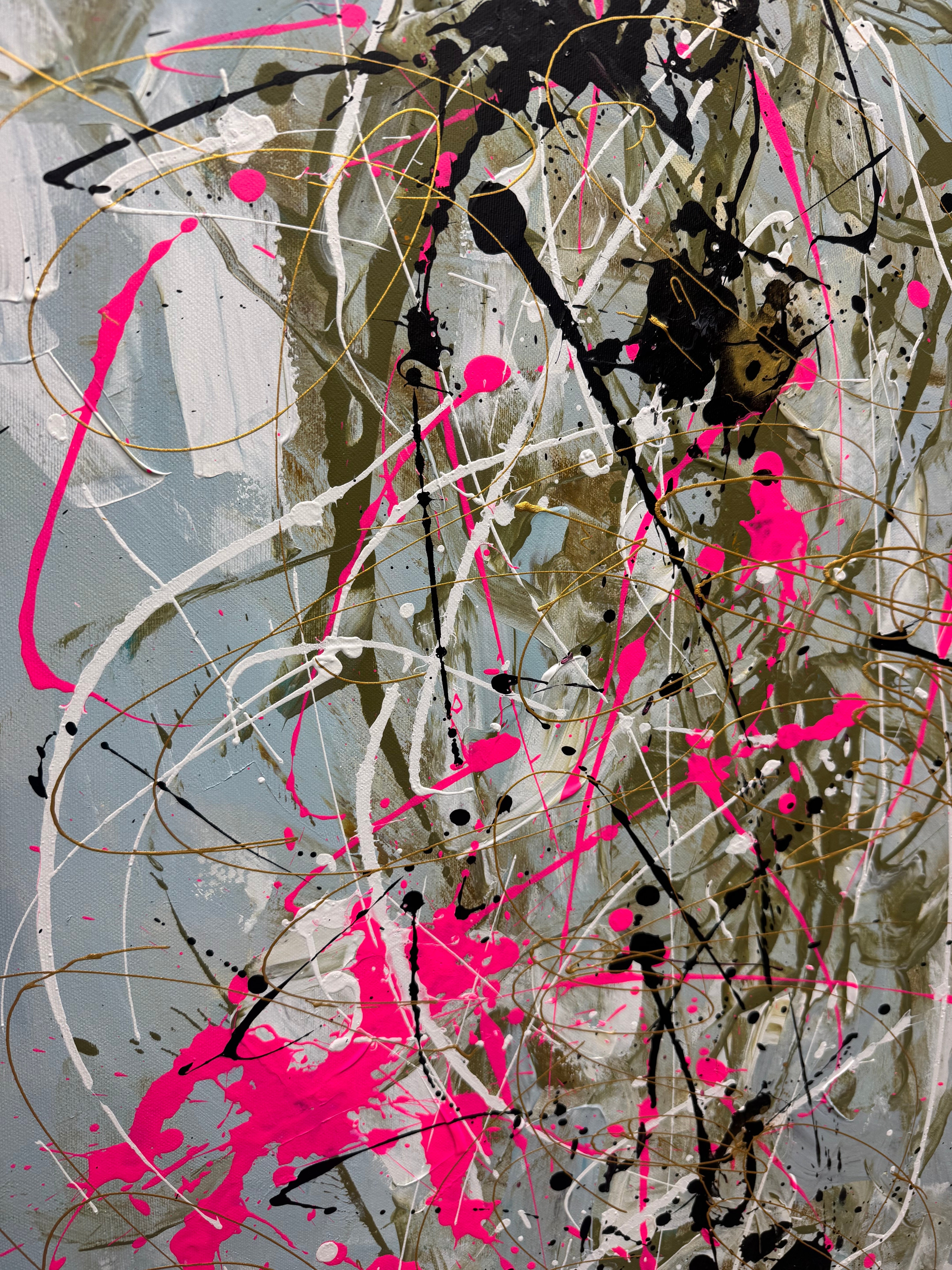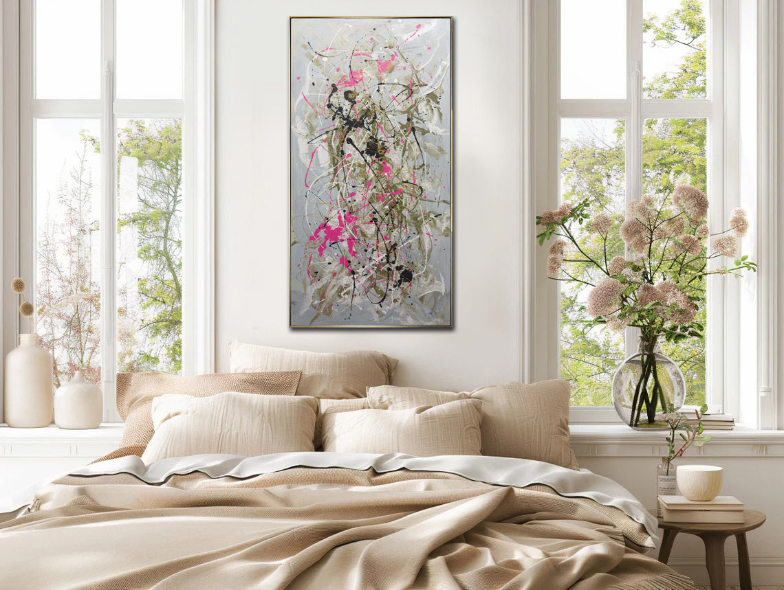 Charge your space with motion and color. This vertical drip-and-splatter canvas layers warm gray and white with olive strokes, black flicks and vibrant fuchsia pops, traced by elegant gold lines. Hand-painted with rich texture for a true Pollock-style energy, it’s a striking focal for living rooms, offices or lofts. Available in custom sizes with an optional floater frame. Ready to hang when stretched or shipped rolled. Color tweaks welcome—make this statement piece uniquely yours.