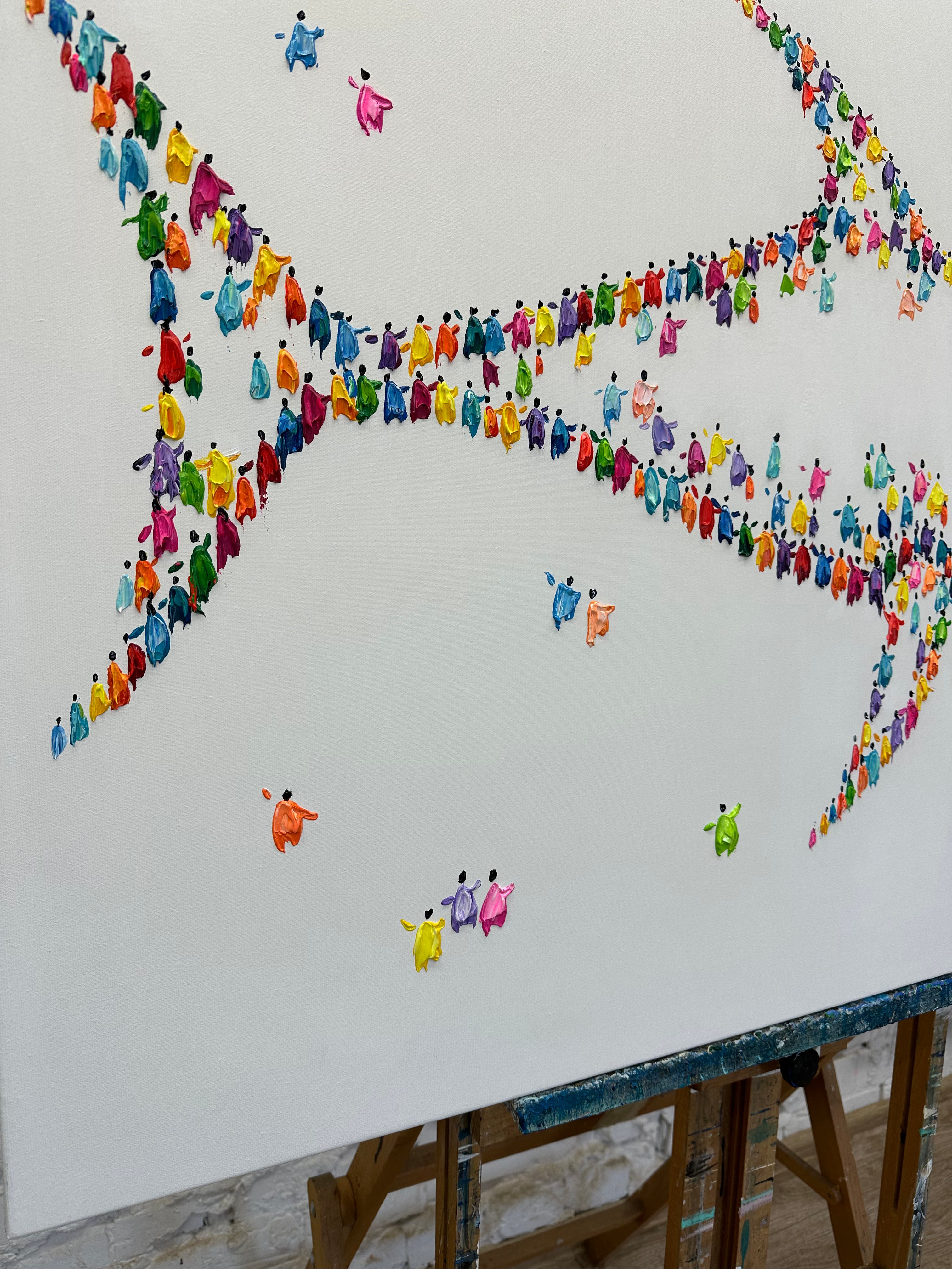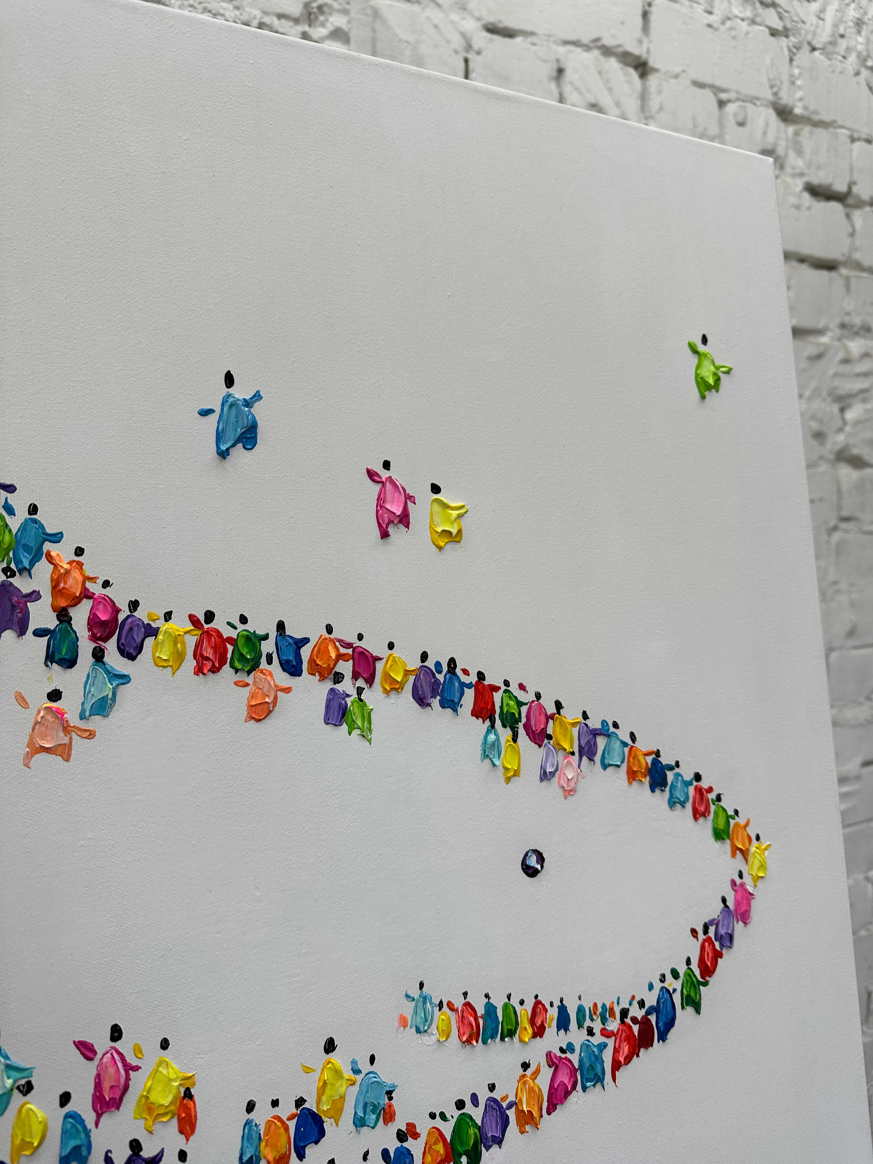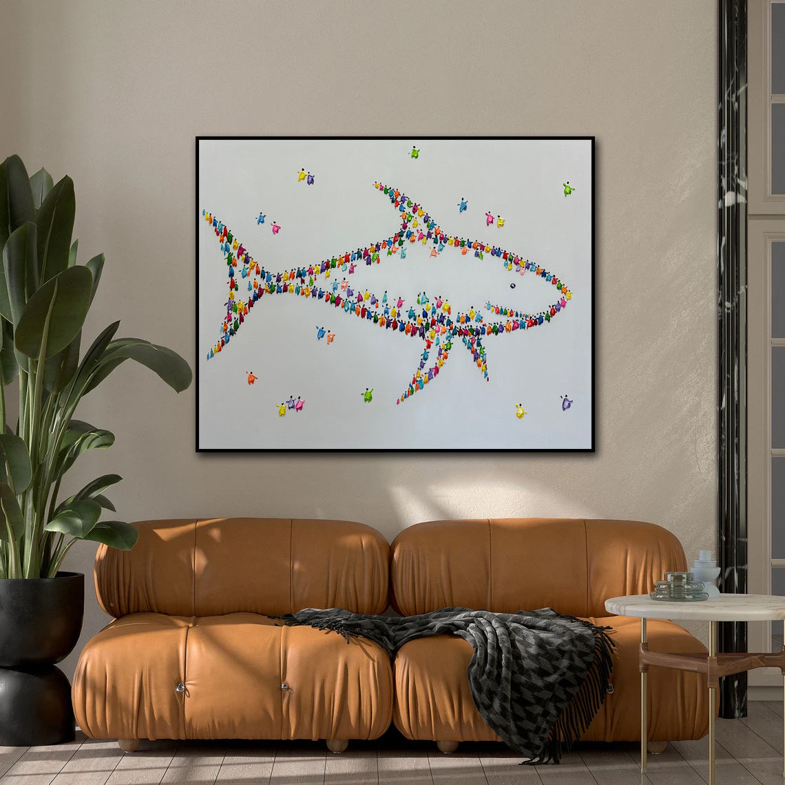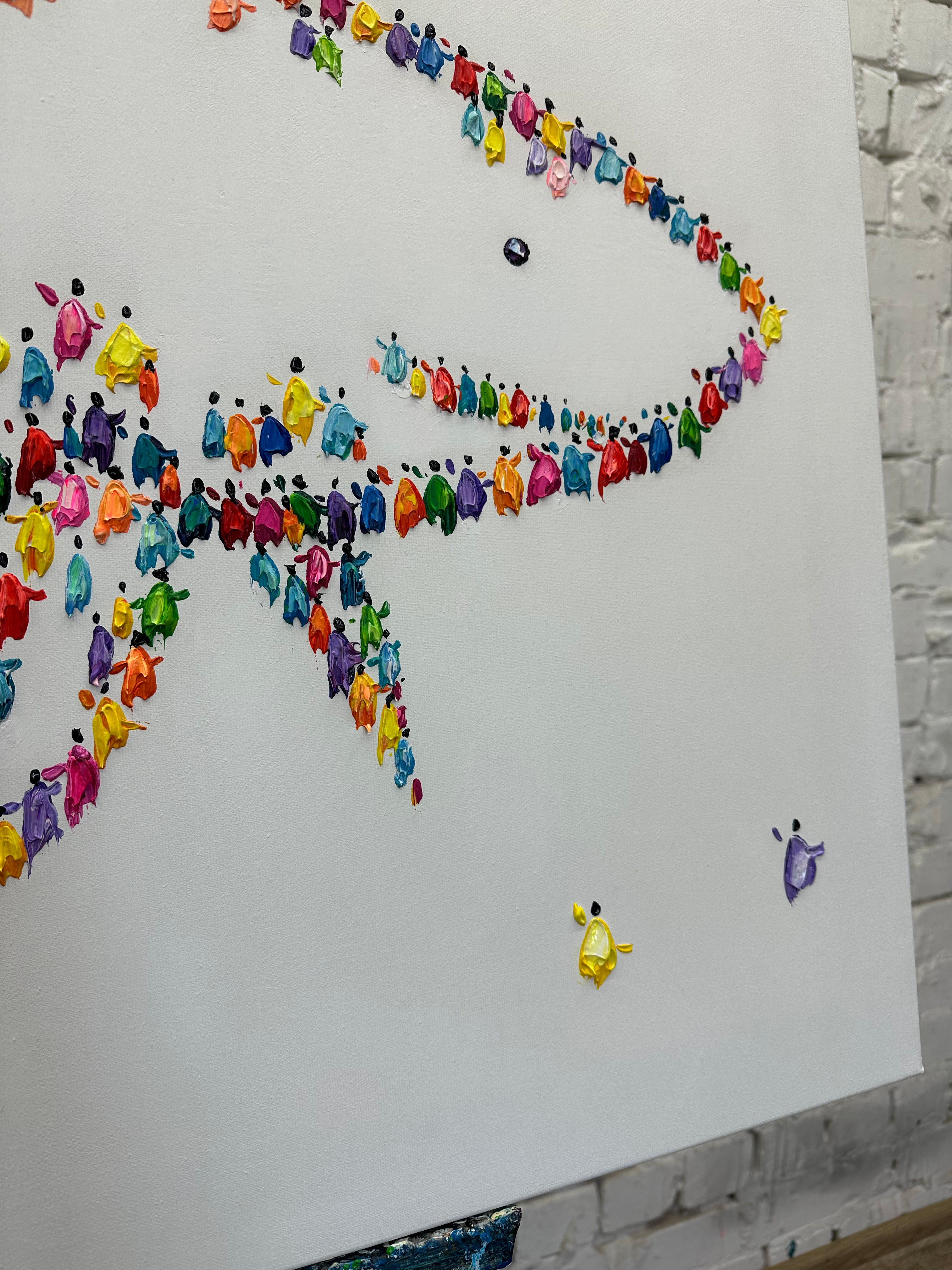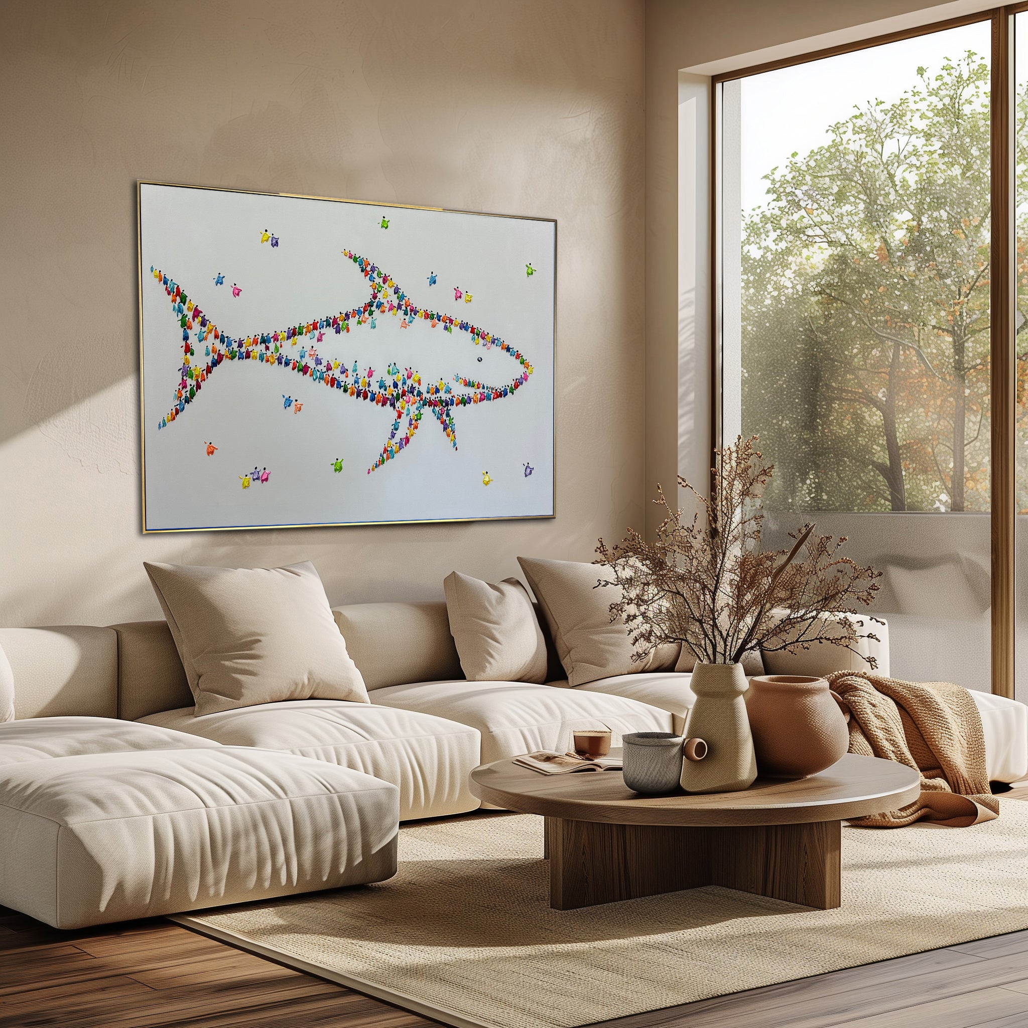 A vibrant abstract fish artwork formed from colorful impasto figures, creating a playful ocean-inspired centerpiece for modern interiors. Add personality to your wall — shop this unique piece now!