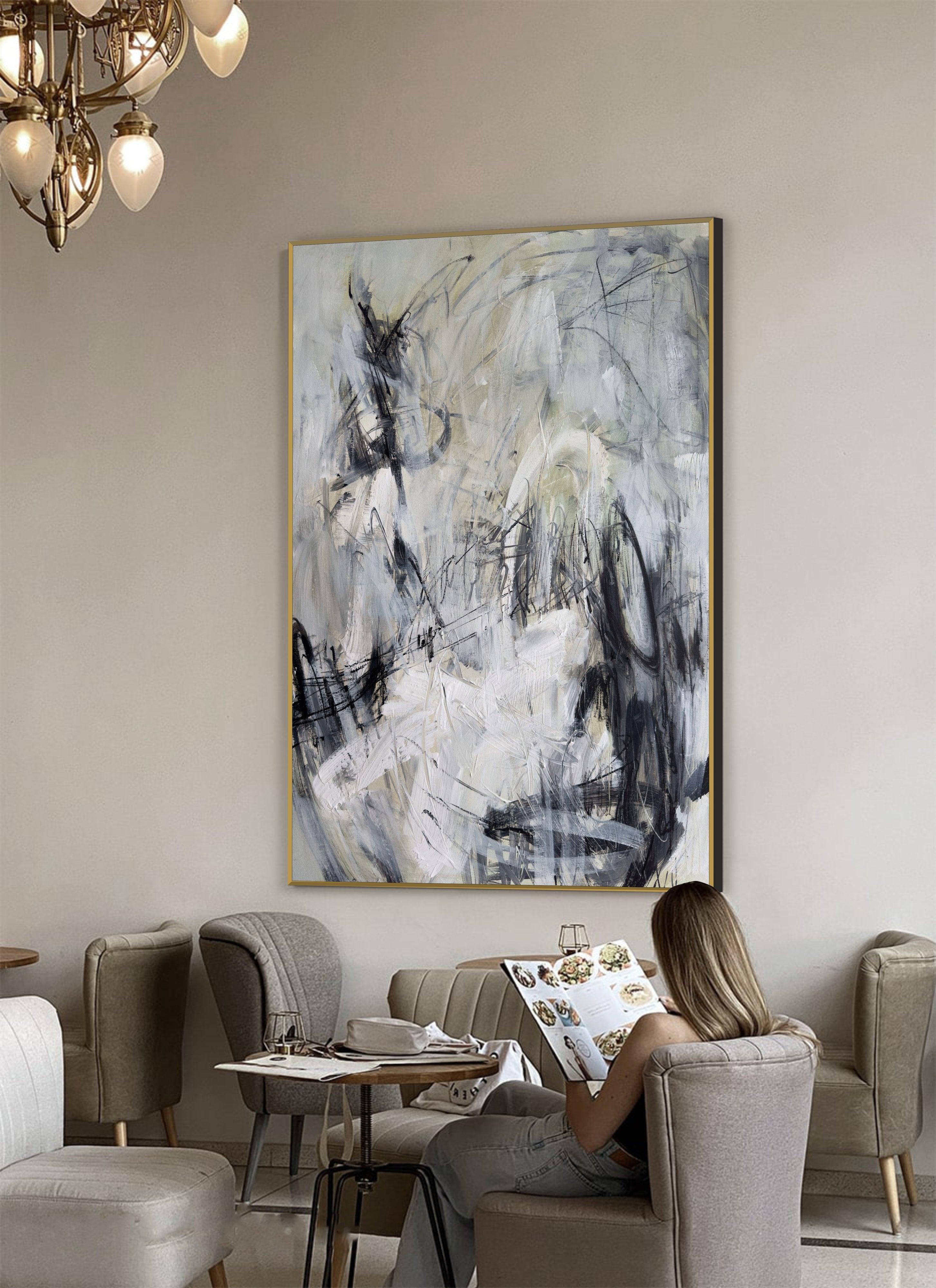 This abstract painting black and white is a striking expression of modern artistry, blending dynamic brushstrokes and monochrome contrasts to create a bold statement piece. This painting is a bold statement piece that adds sophistication and depth to any modern living space. Its expressive brushstrokes, intricate layering, and dynamic contrasts evoke movement, emotion, and interpretation. The monochrome palette enhances the artwork’s timeless appeal, making it a perfect addition to contemporary, minimalist, or industrial interiors. Its textured composition creates an immersive experience, drawing viewers into a world of raw energy and artistic expression. Whether displayed in a living room, office, or bedroom, this artwork captivates with its elegant chaos, serving as a powerful focal point. Carefully crafted with high-quality materials, this hand-painted piece is designed to stand the test of time. Elevate your decor with this dynamic abstract masterpiece, celebrating the beauty of balance, contrast, and artistic freedom.