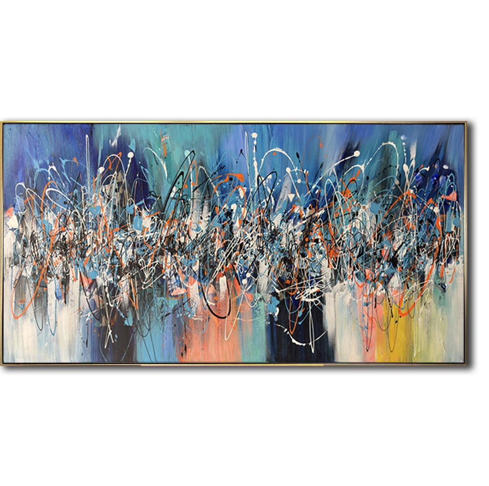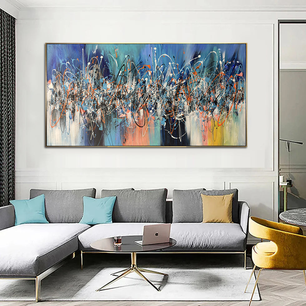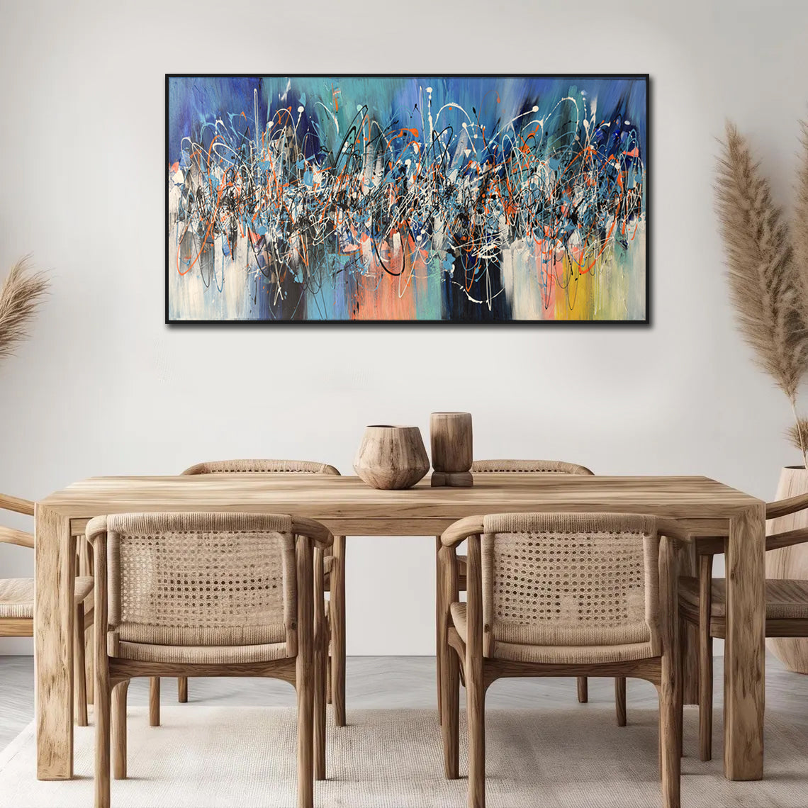 Energize your space with this large drip painting “Ocean Pulse”, bursting with motion and color. Inspired by Pollock-style expressionism, it features vibrant swirls of blue, orange, and white against a dynamic backdrop. Ideal for modern interiors, it transforms any room with artistic energy and flow. Hand-painted and highly textured, this striking piece becomes a bold statement in living rooms, offices, or gallery walls. A must-have for lovers of movement and color.