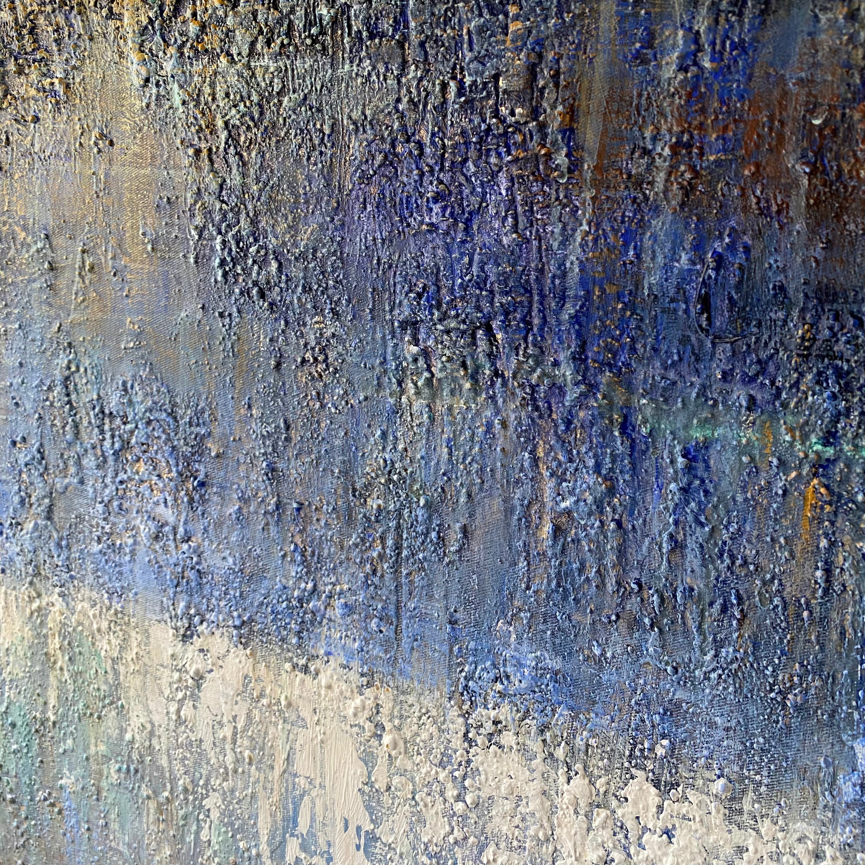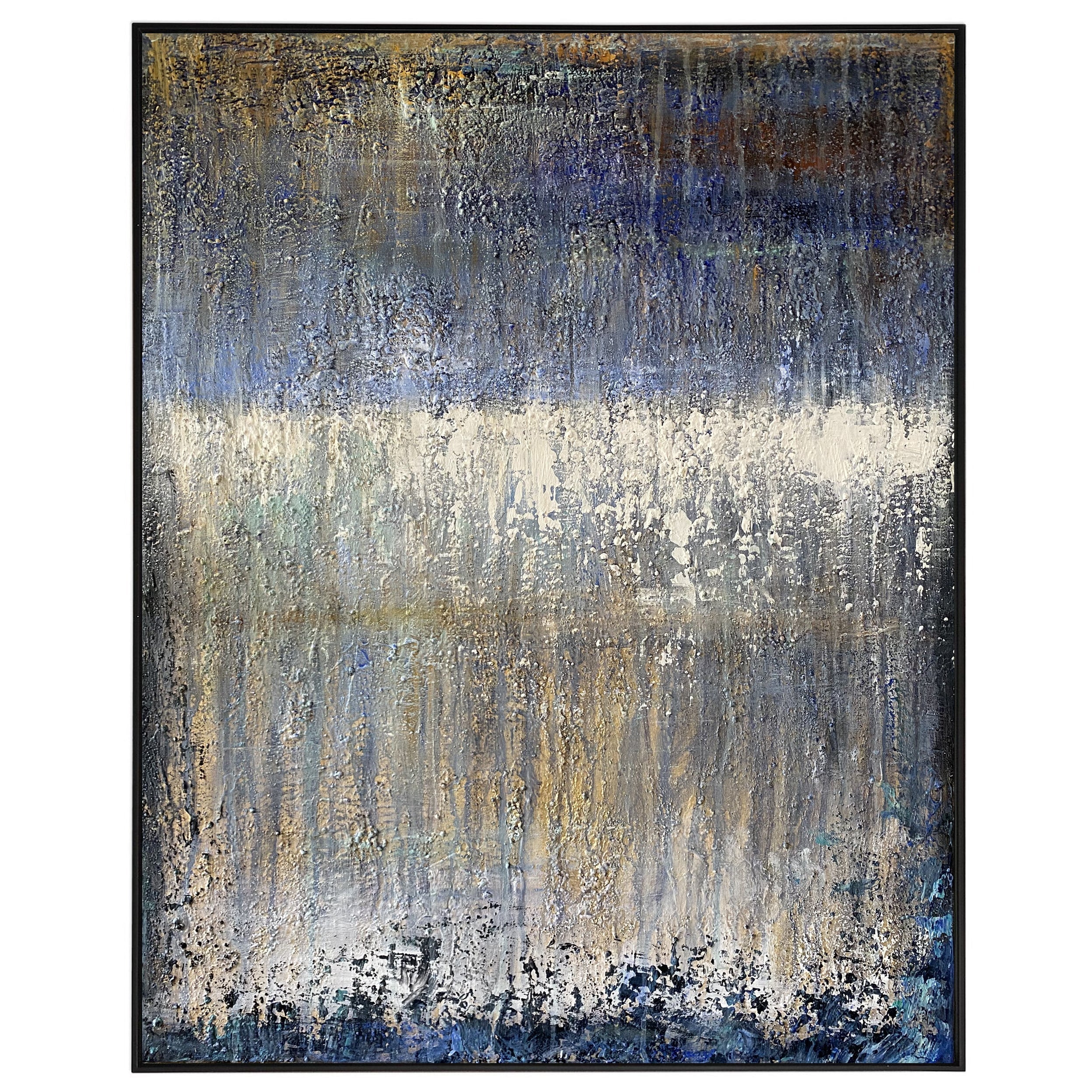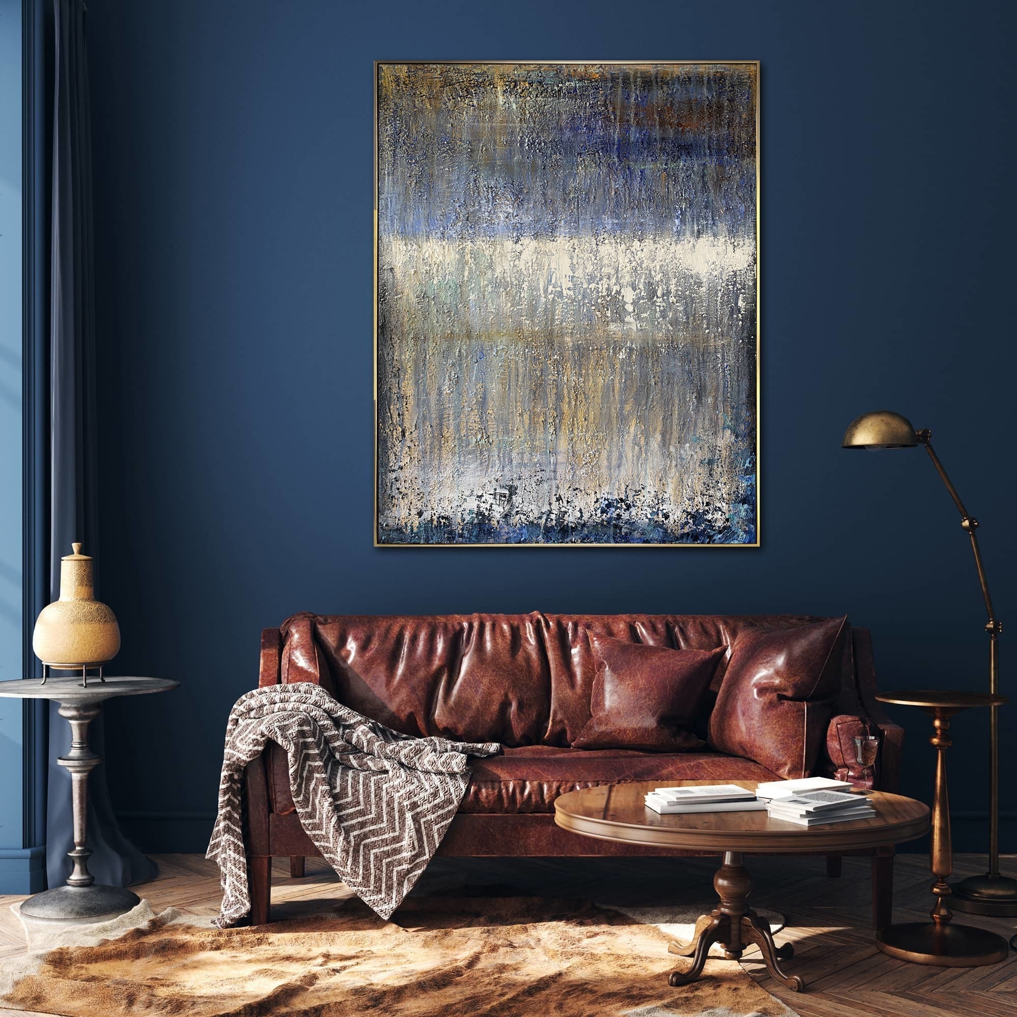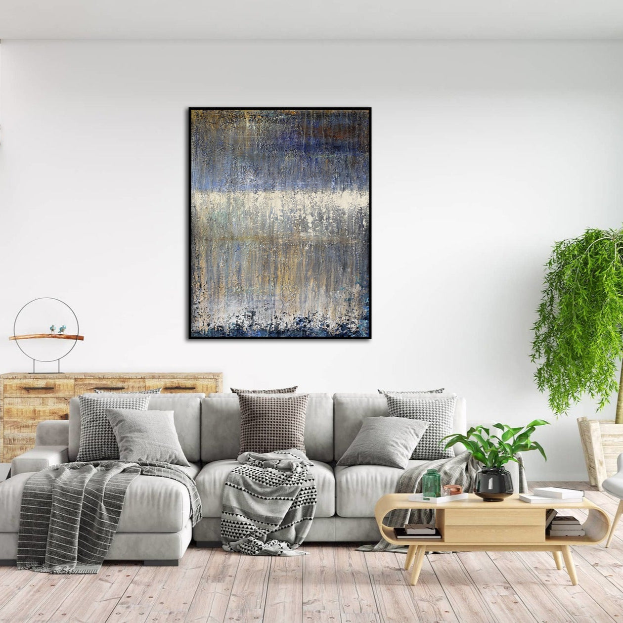Give your wall the calm drama of a blue-gold horizon. This hand-painted abstract features rich impasto texture, dripped layers and a luminous band of ivory that reads like surf or mist. Deep indigo, cobalt and slate blend with warm ochre and metallic gold for a luxe neutral palette. Perfect for living room, bedroom or office, the large vertical canvas adds depth to modern, coastal or minimalist spaces. Gallery framed and ready to hang—serene and sophisticated.