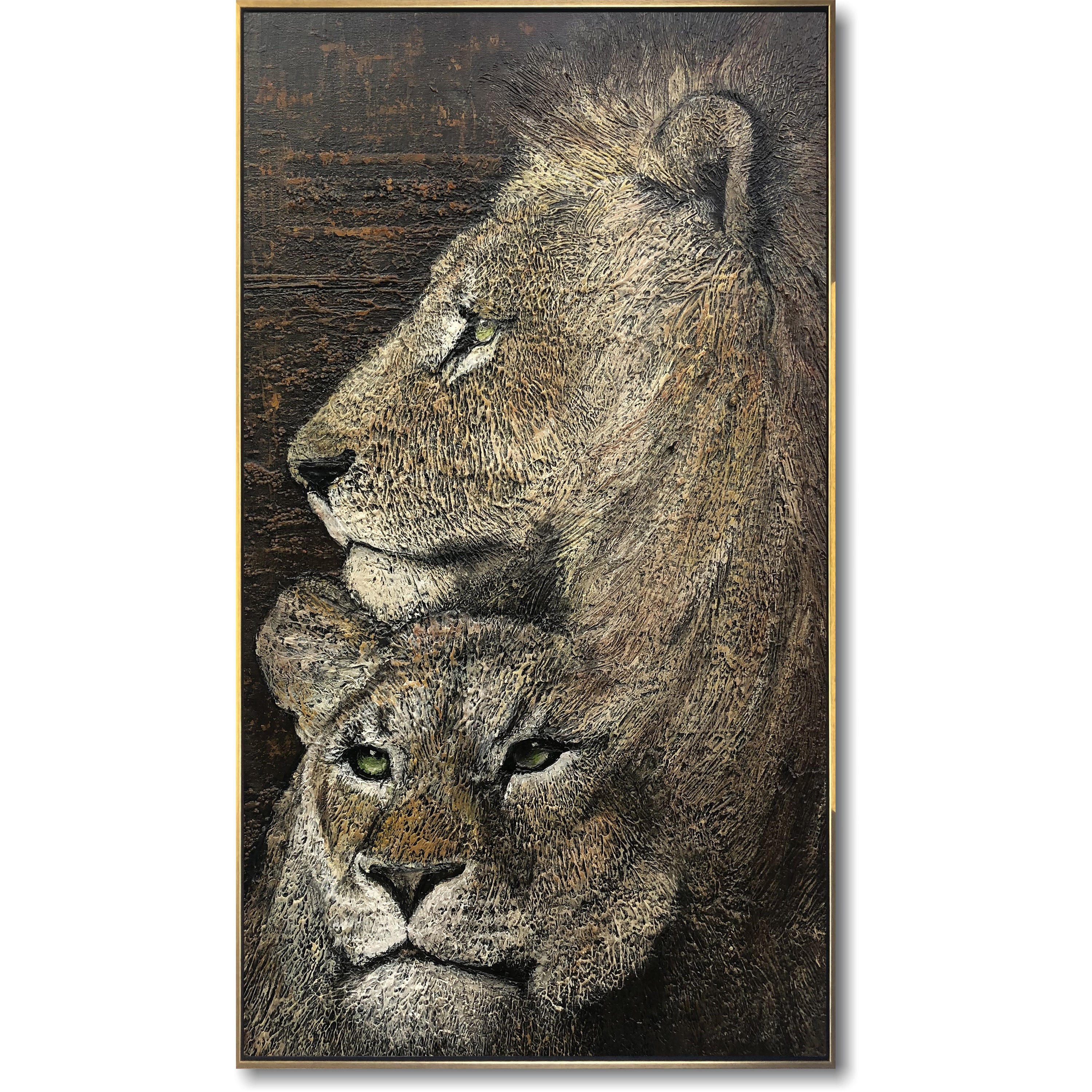 Introducing 'Wisdom,' a captivating textured painting that beautifully captures the majestic bond between a lion and lioness. This contemporary artwork features a detailed portrait of the lion couple, their powerful presence highlighted by the rich textures and earthy tones. Perfect for wildlife enthusiasts and art lovers, 'Wisdom' brings the strength and grace of the African savannah into your home. Enhance your modern decor with this stunning portrayal of nature's regal big cats.