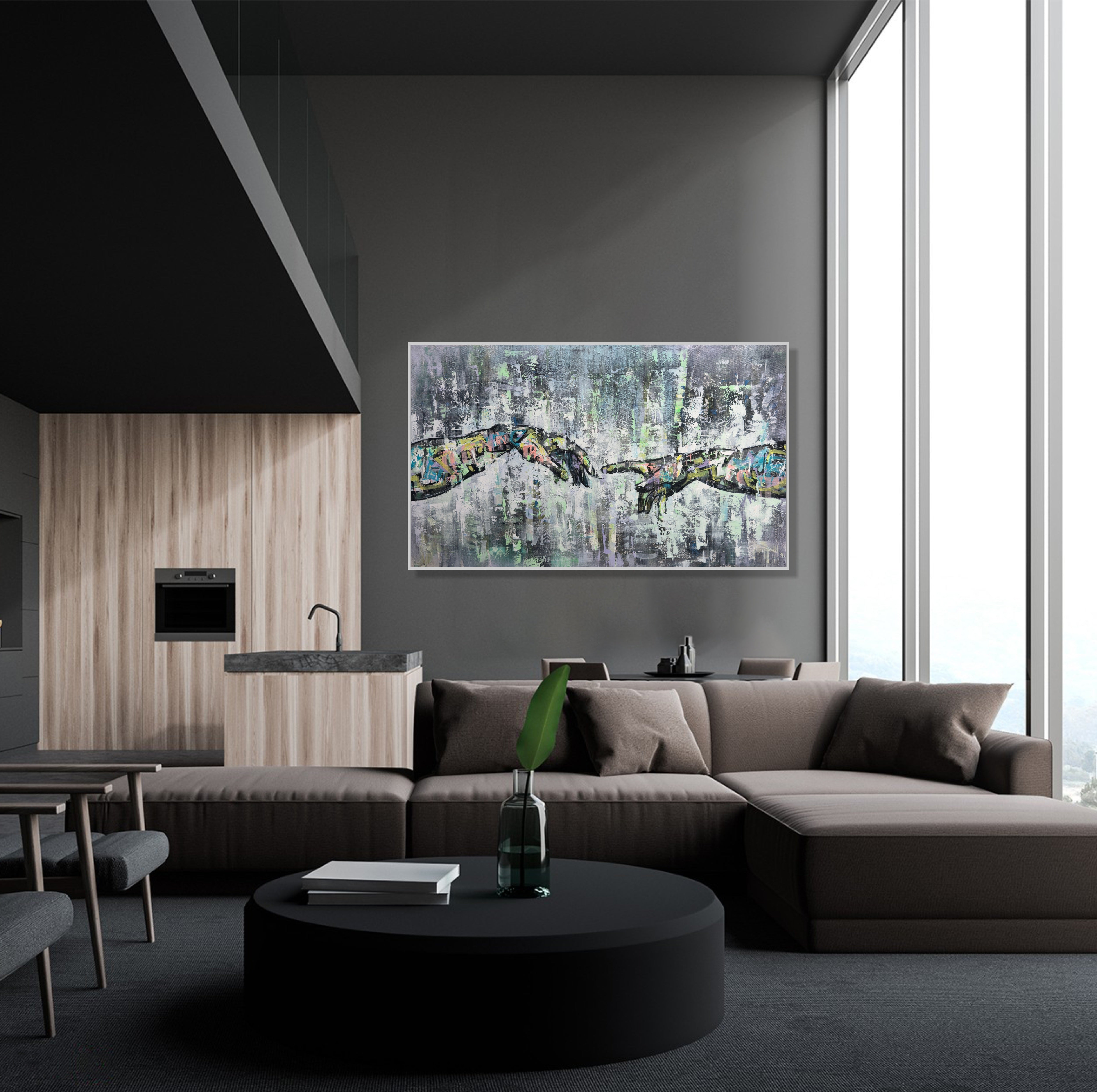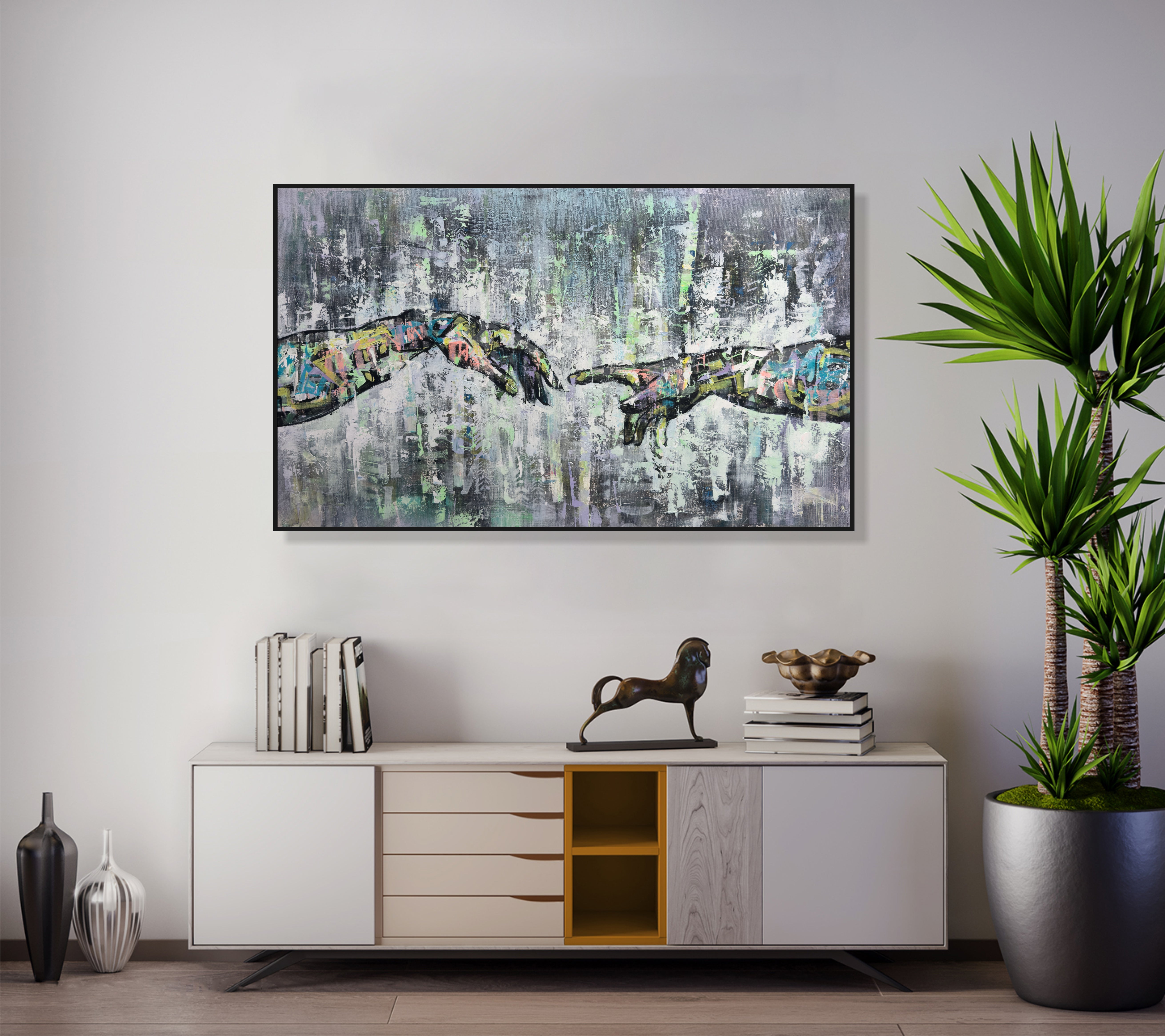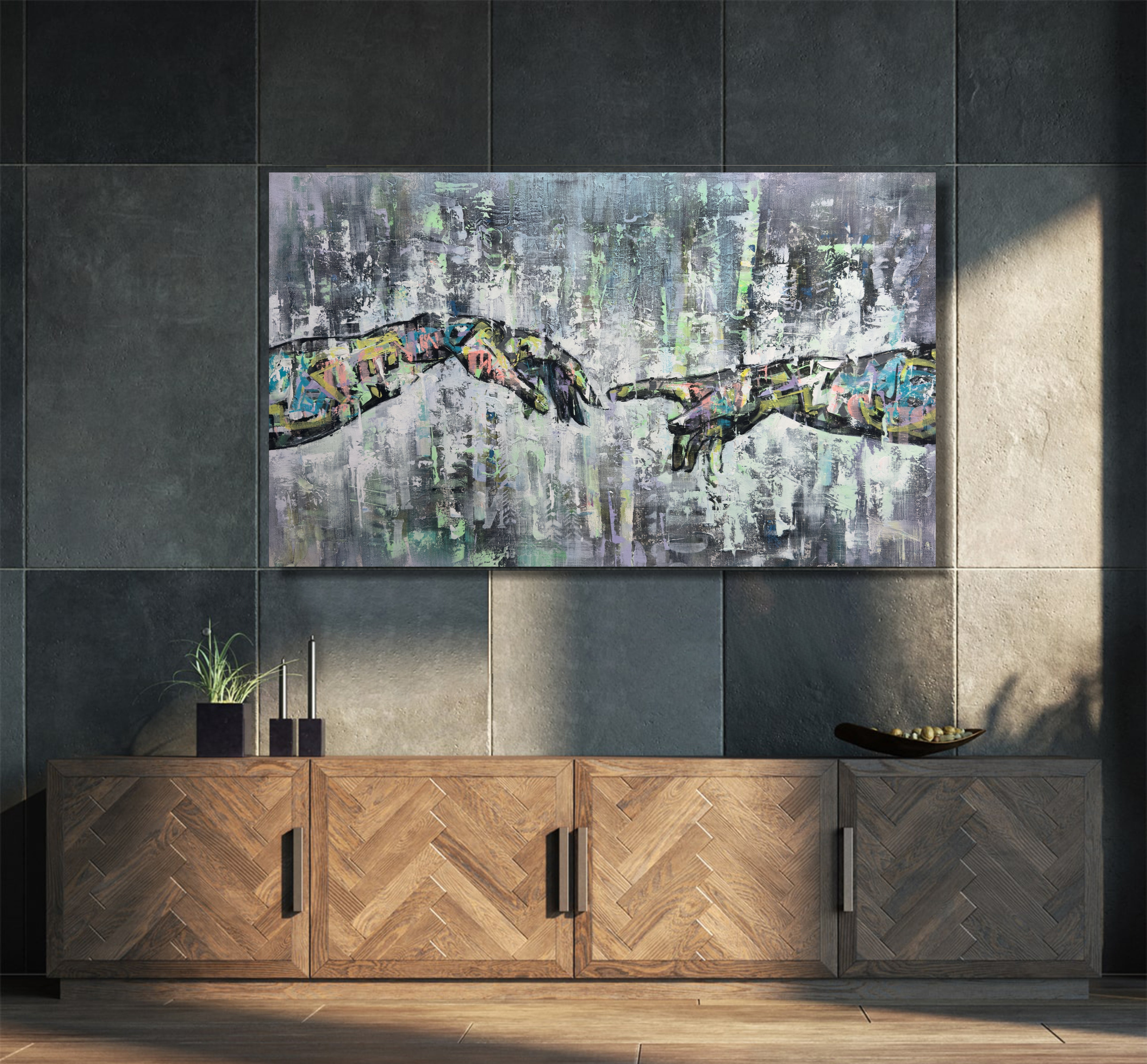 "Urban Creation" blends contemporary street art with abstract expressionism. Vibrant graffiti-style strokes and textured brushwork bring energy to this dynamic composition, where two hands—symbolizing connection, creativity, and humanity—reach toward one another. The raw urban aesthetic, set against a distressed backdrop of layered colors and bold textures, evokes the spirit of modern artistry while paying homage to classical inspiration. This striking canvas art is perfect for those who appreciate contemporary design, symbolic expression, and the fusion of history with modern culture.