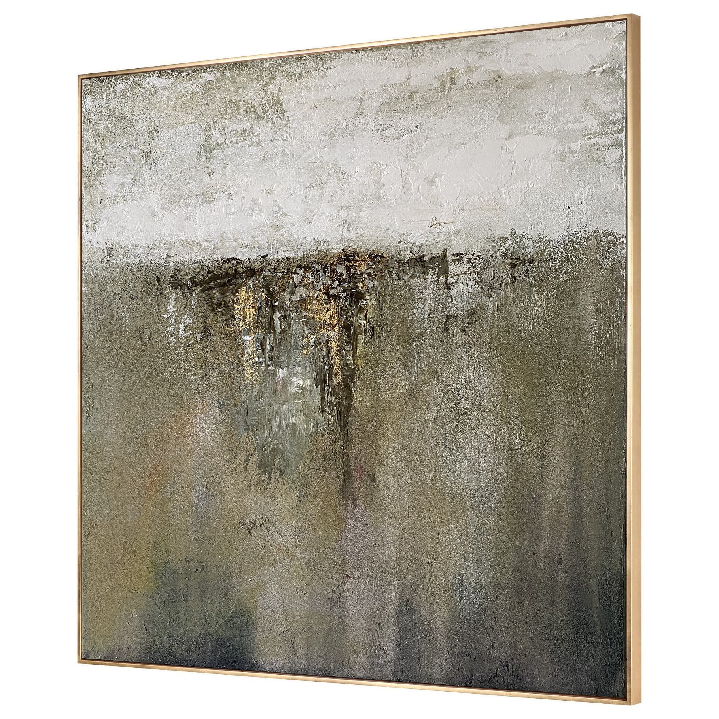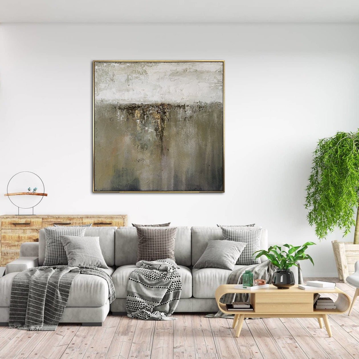 Breathe calm into your space with this neutral textured abstract landscape. Hand-built impasto adds movement in olive, taupe and greige, grounded by charcoal and kissed with a subtle gold accent. The minimalist horizon suits modern, Scandi and wabi-sabi interiors, creating a serene focal point above sofa, bed or console. Gallery framed and ready to hang, this large canvas elevates living room, bedroom or office with earthy luxury and timeless style.