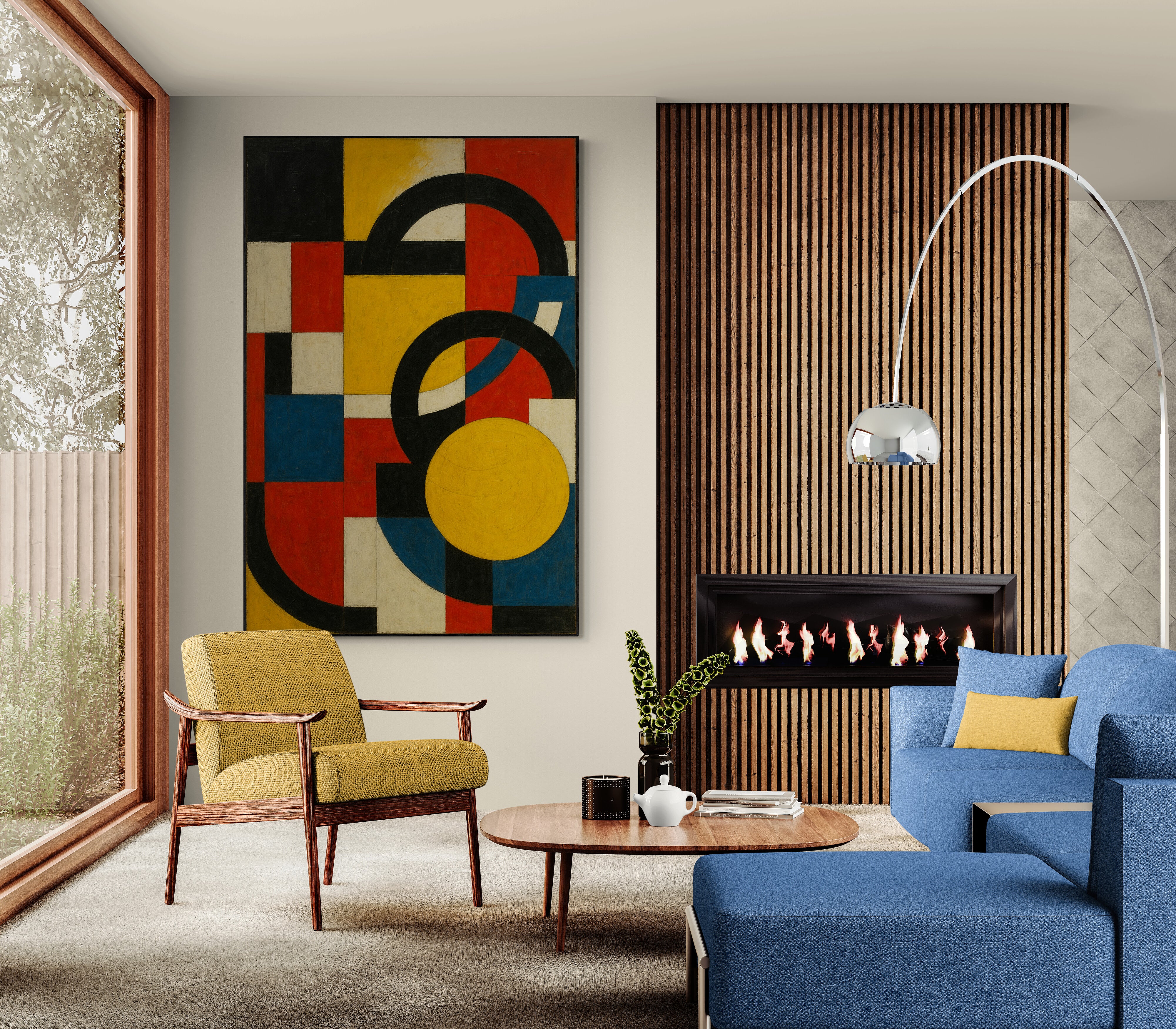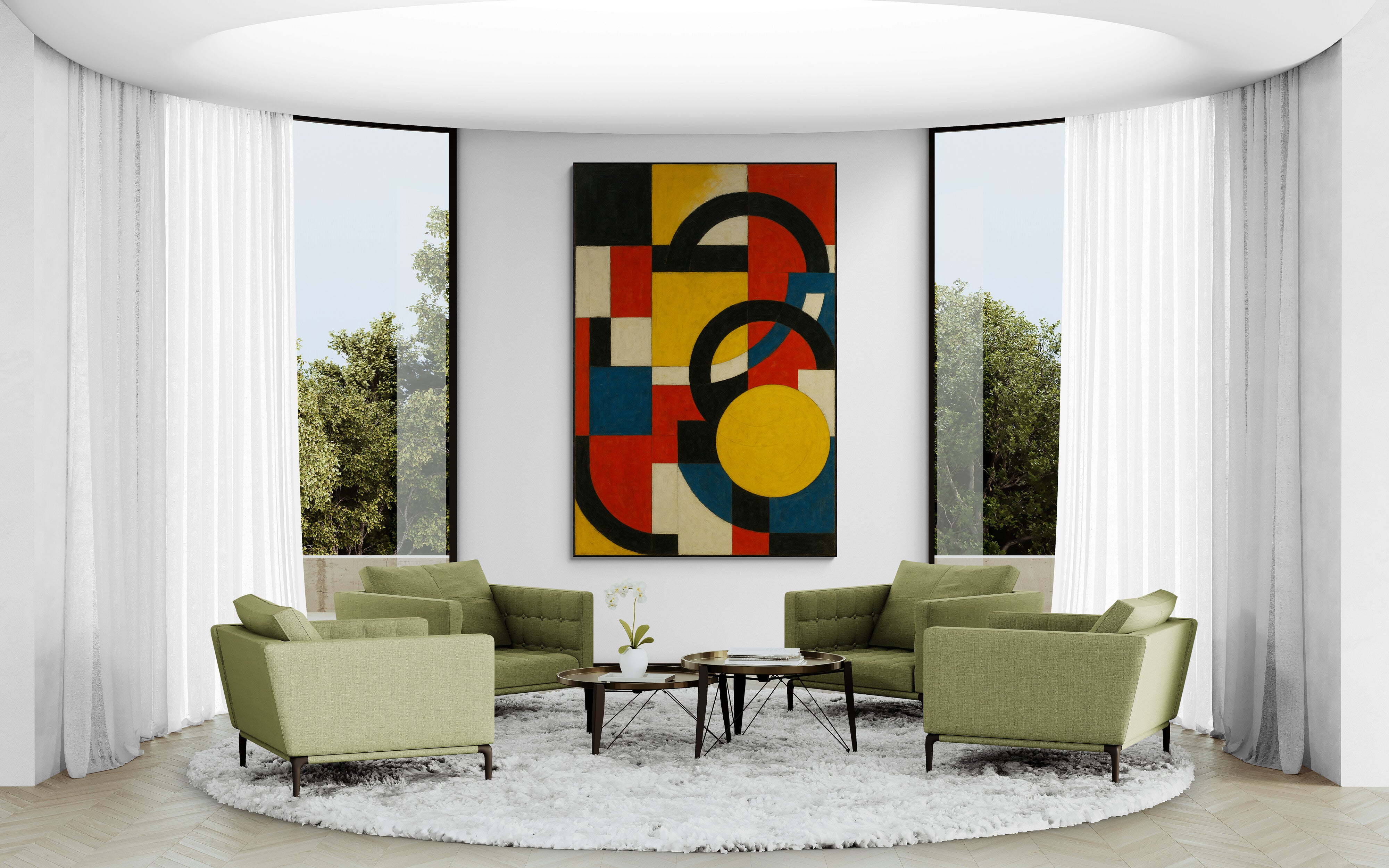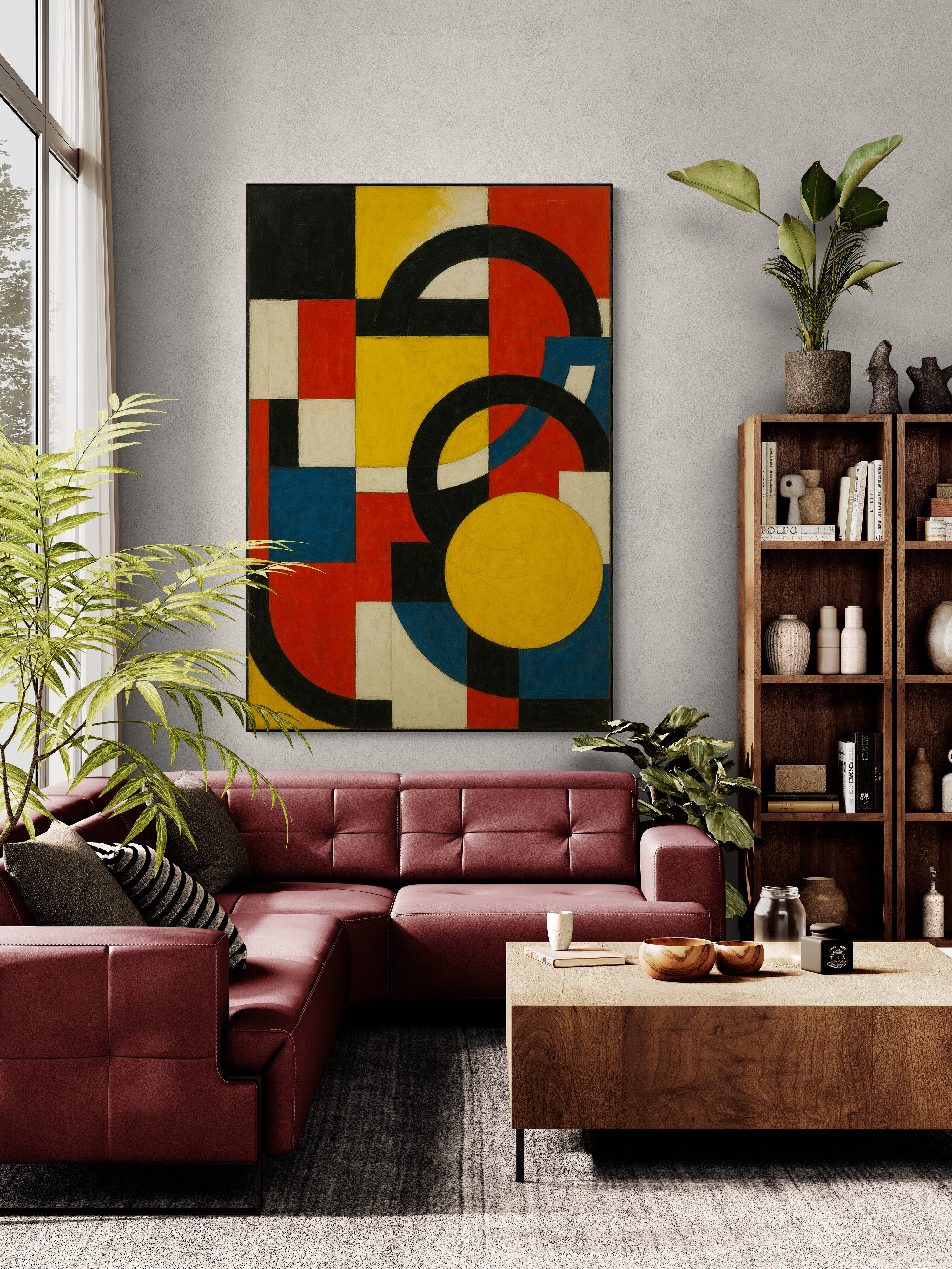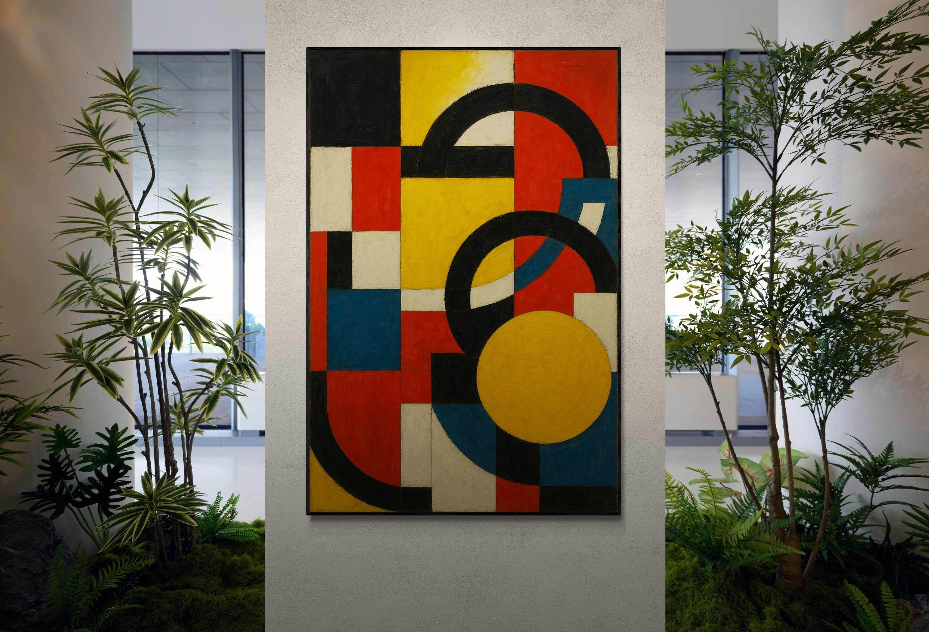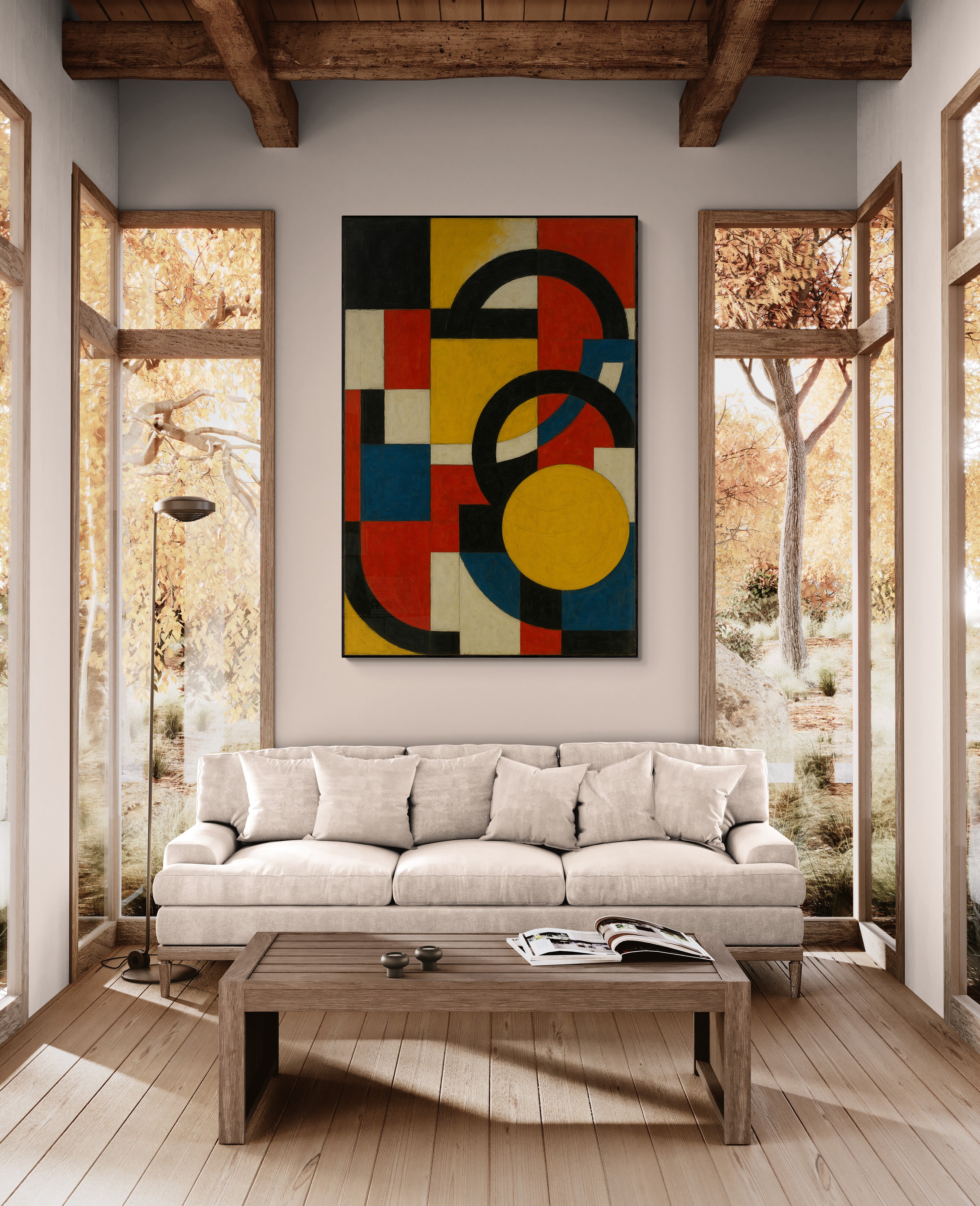 Striking Bauhaus geometry and bold color blocks meet in this handcrafted oversized abstract canvas. A dynamic focal point for modern living rooms or offices. Elevate your space — order today!