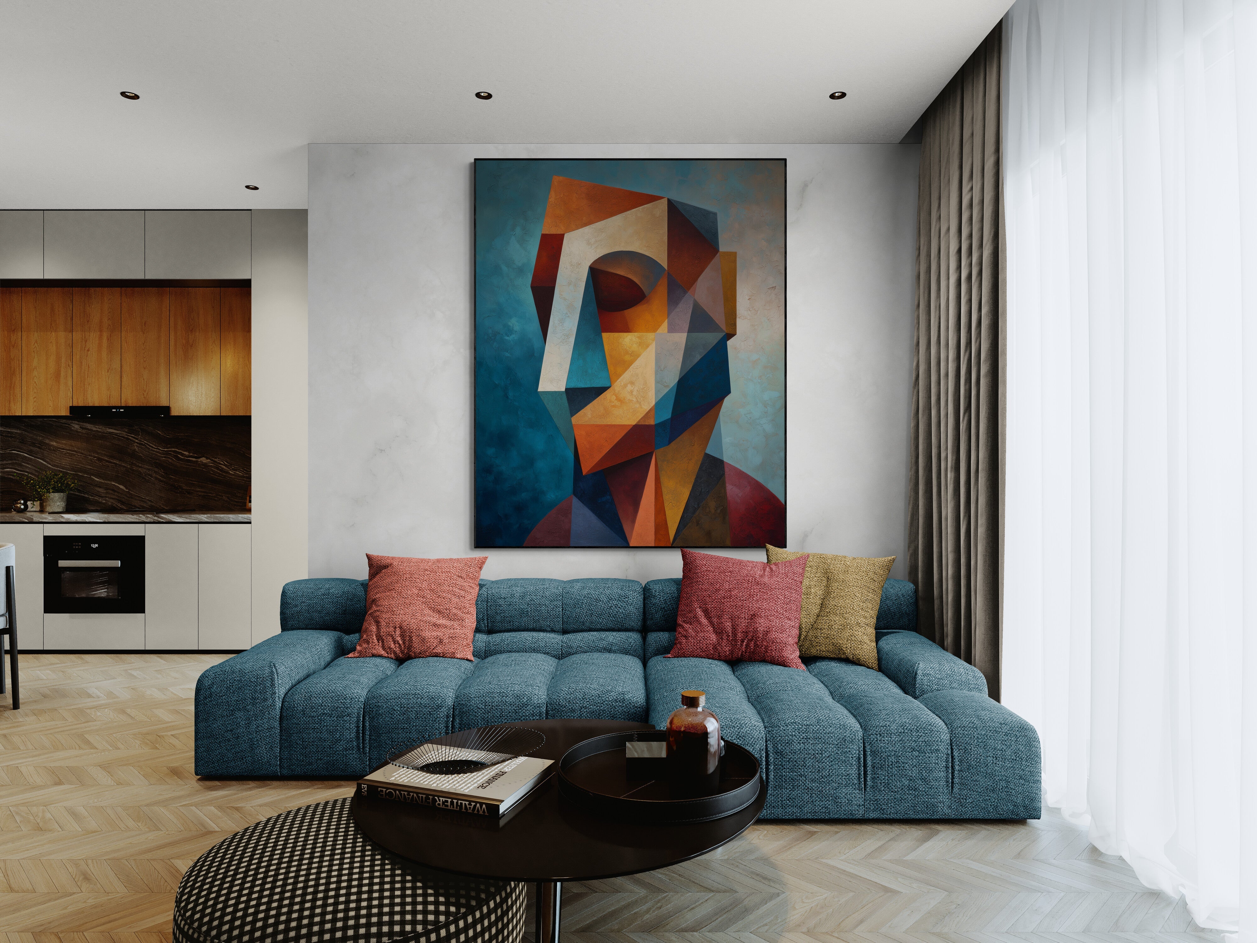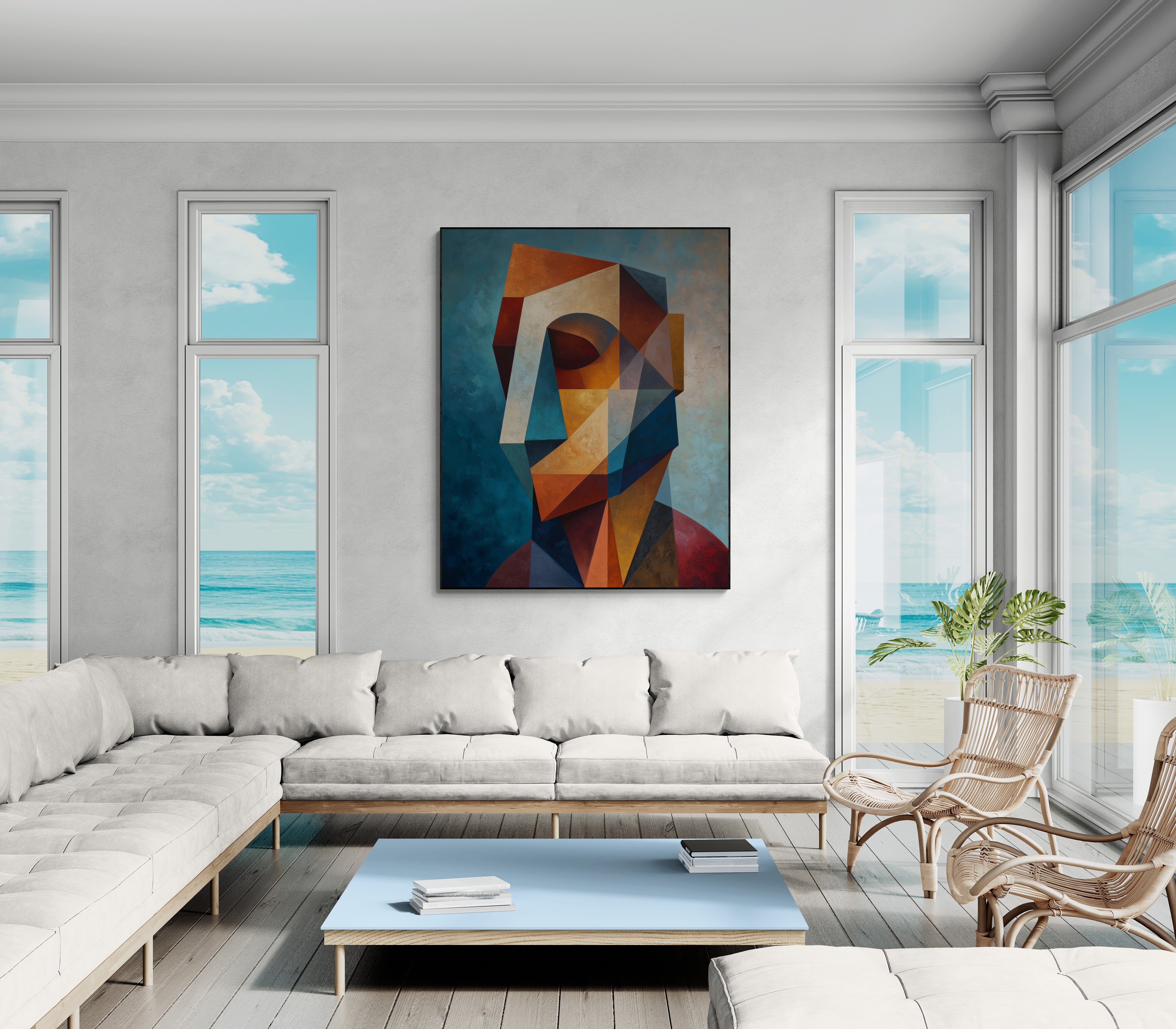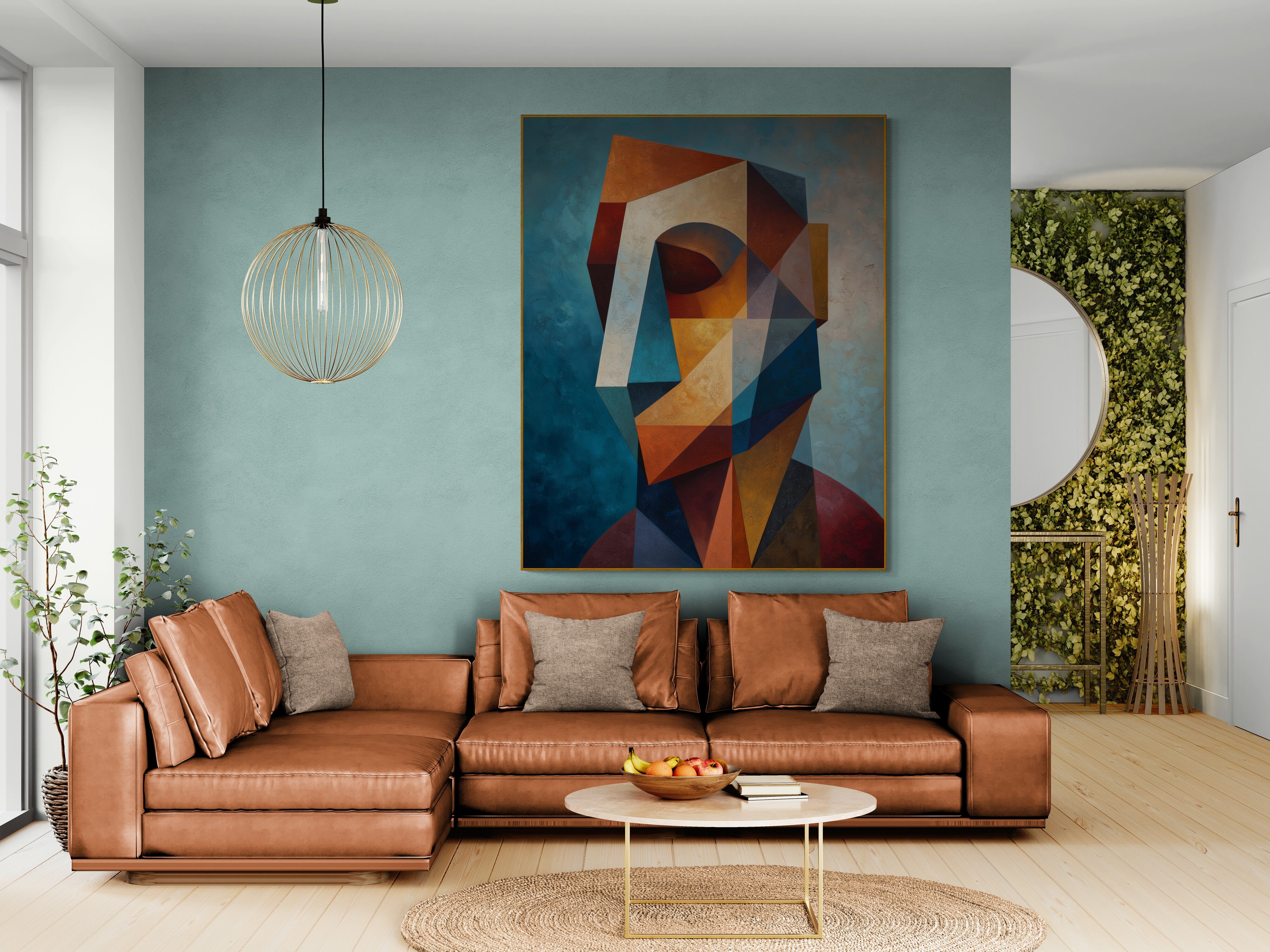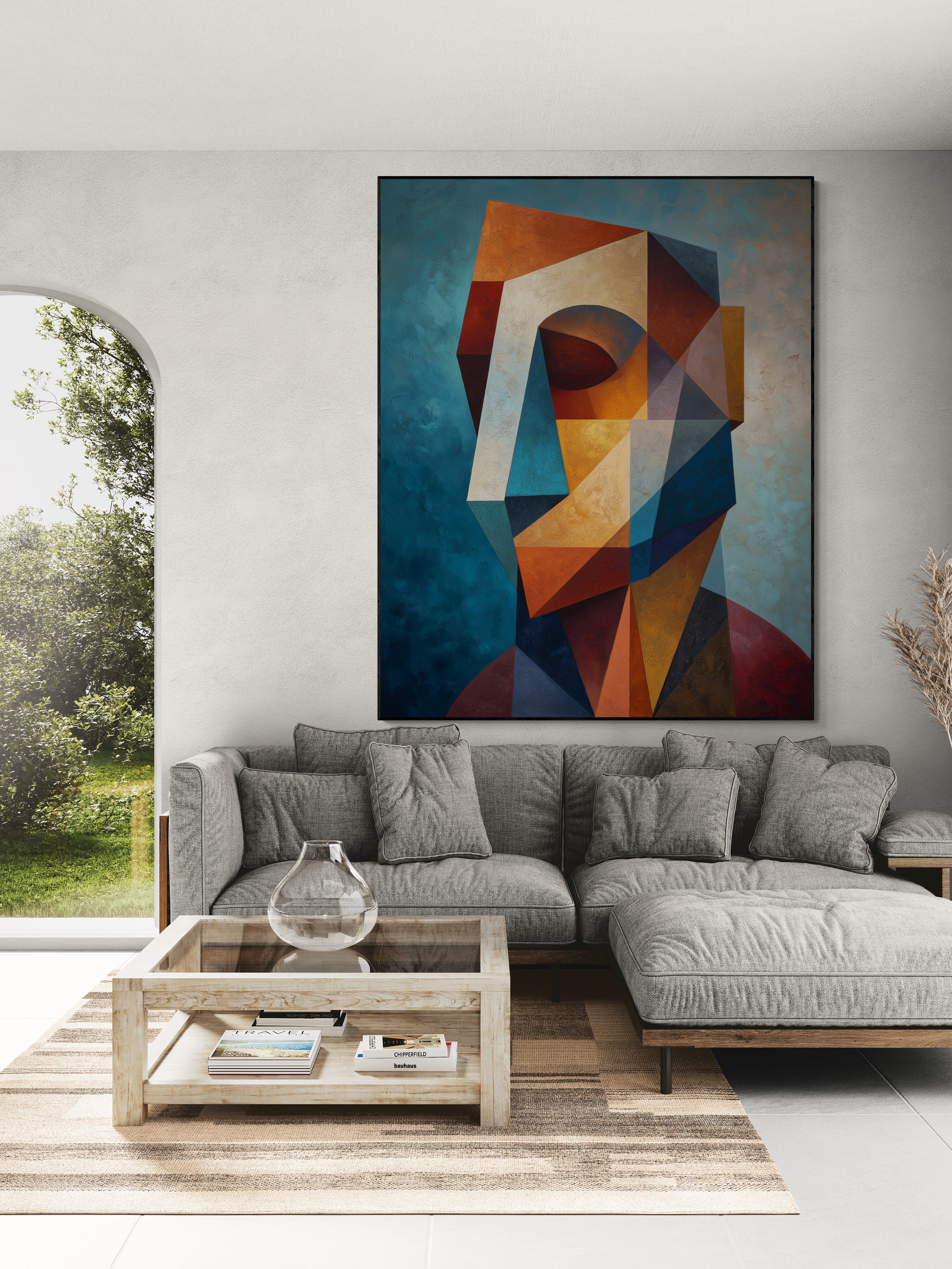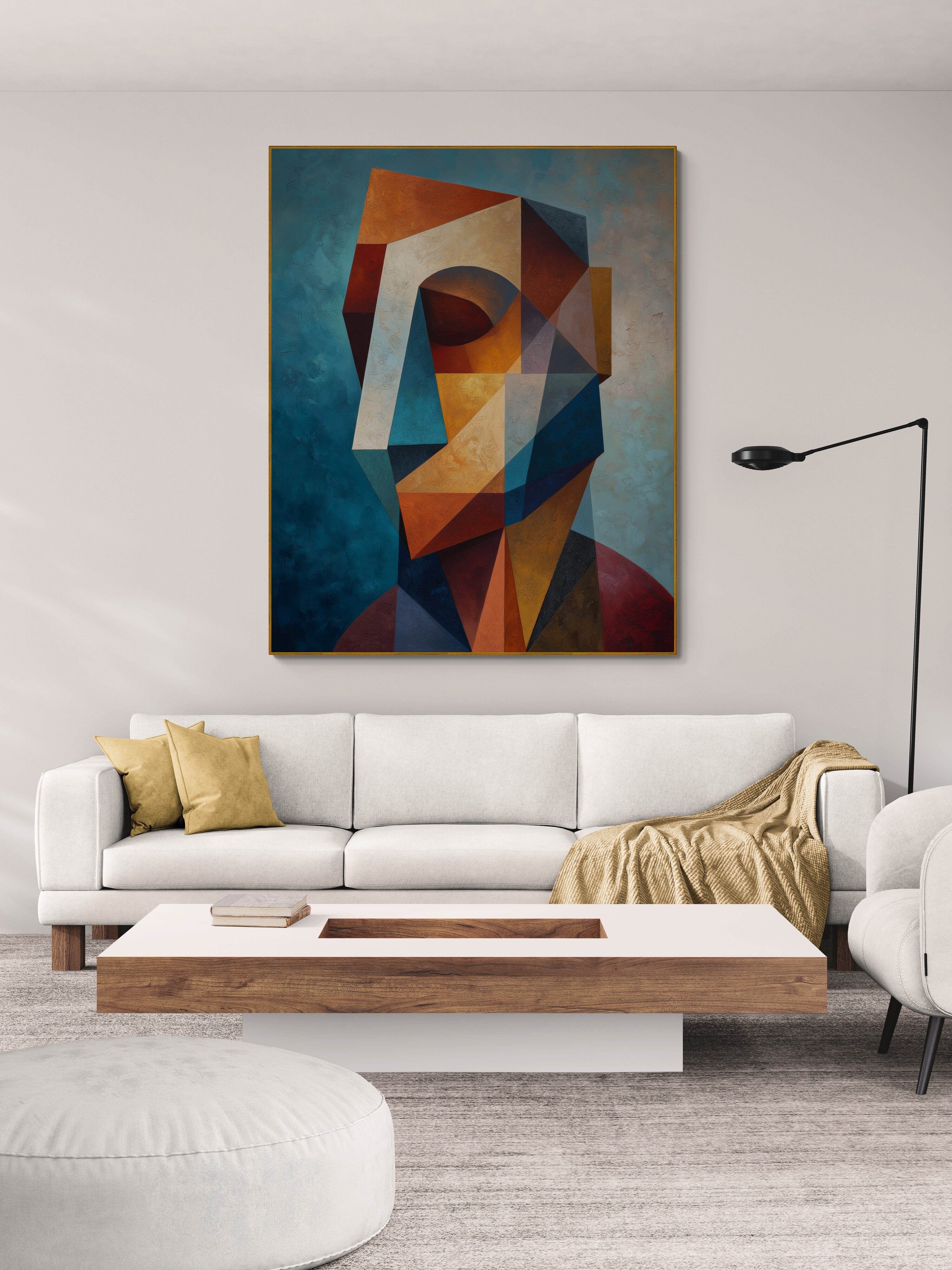 A striking geometric cubist portrait in rich earthy tones, hand-painted for a bold modern interior. Perfect for living rooms or offices. Bring contemporary art into your space — order today!