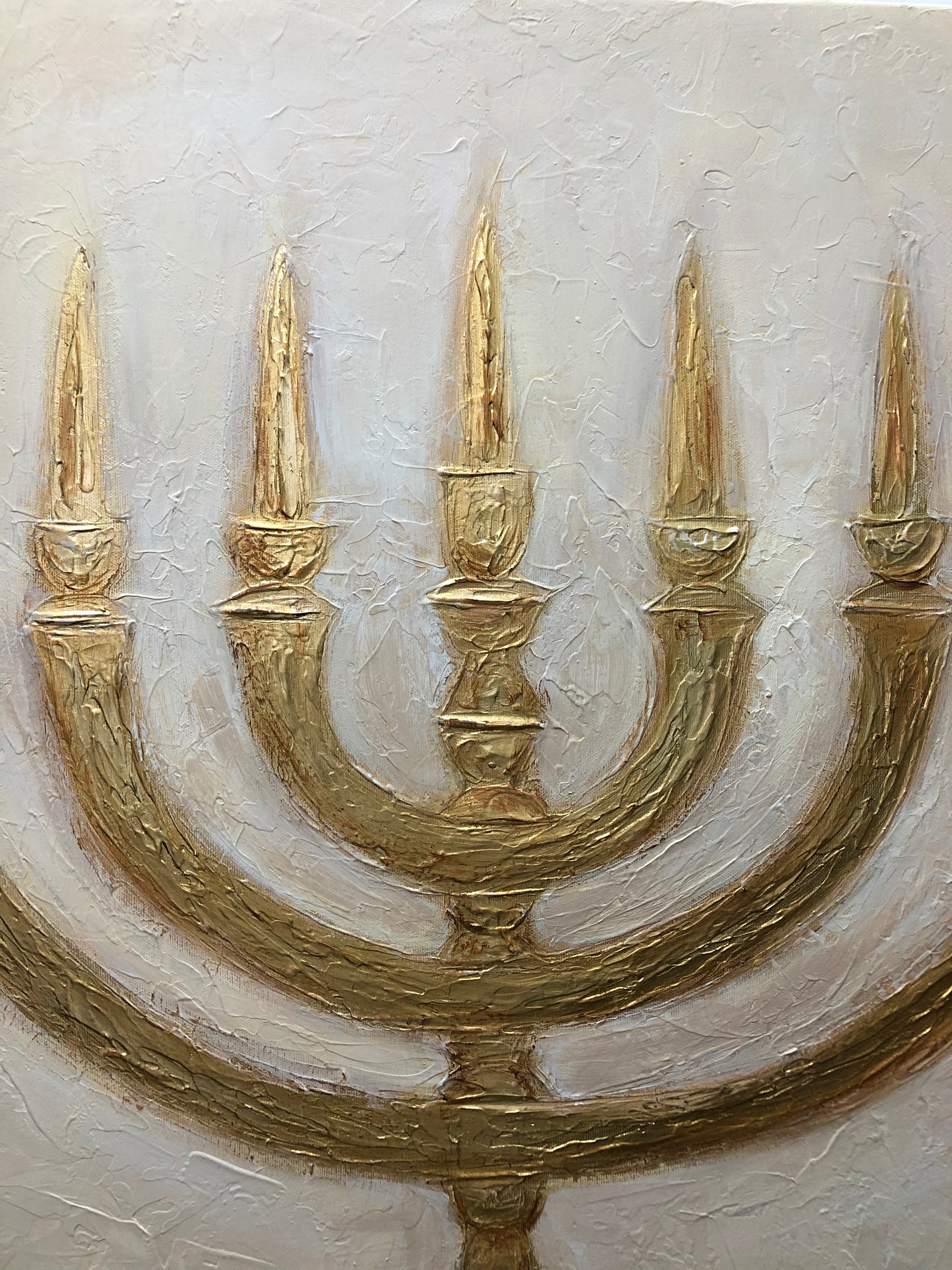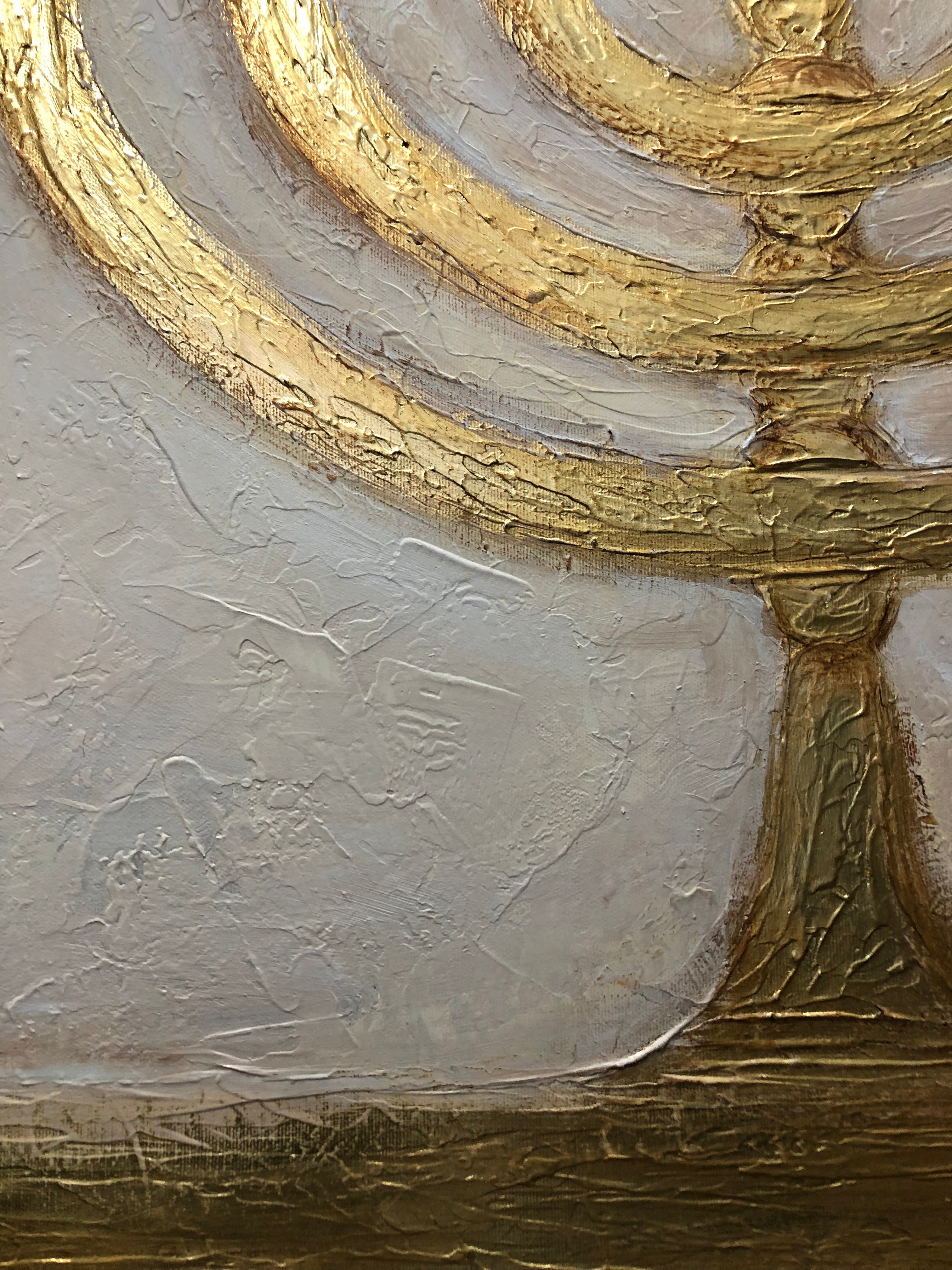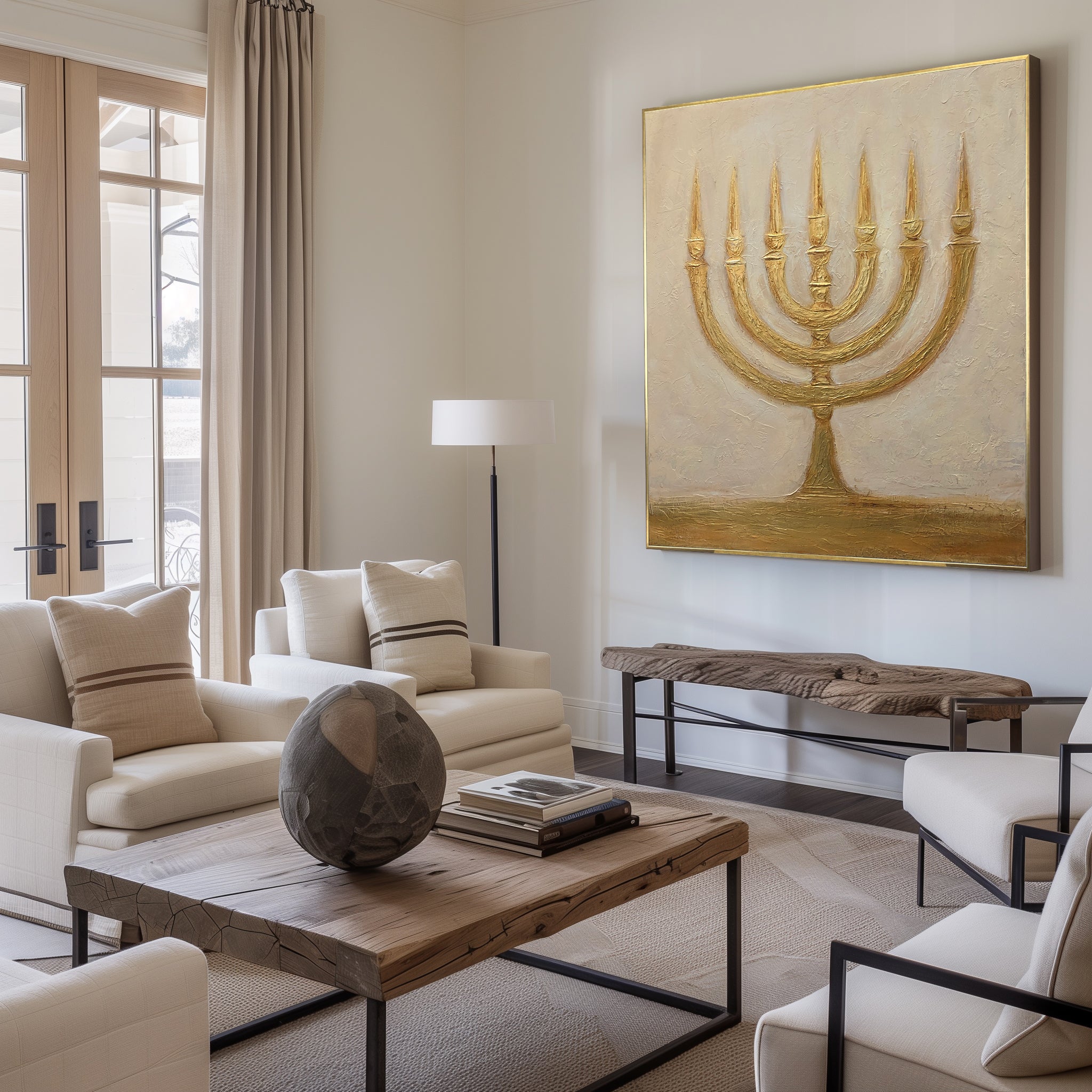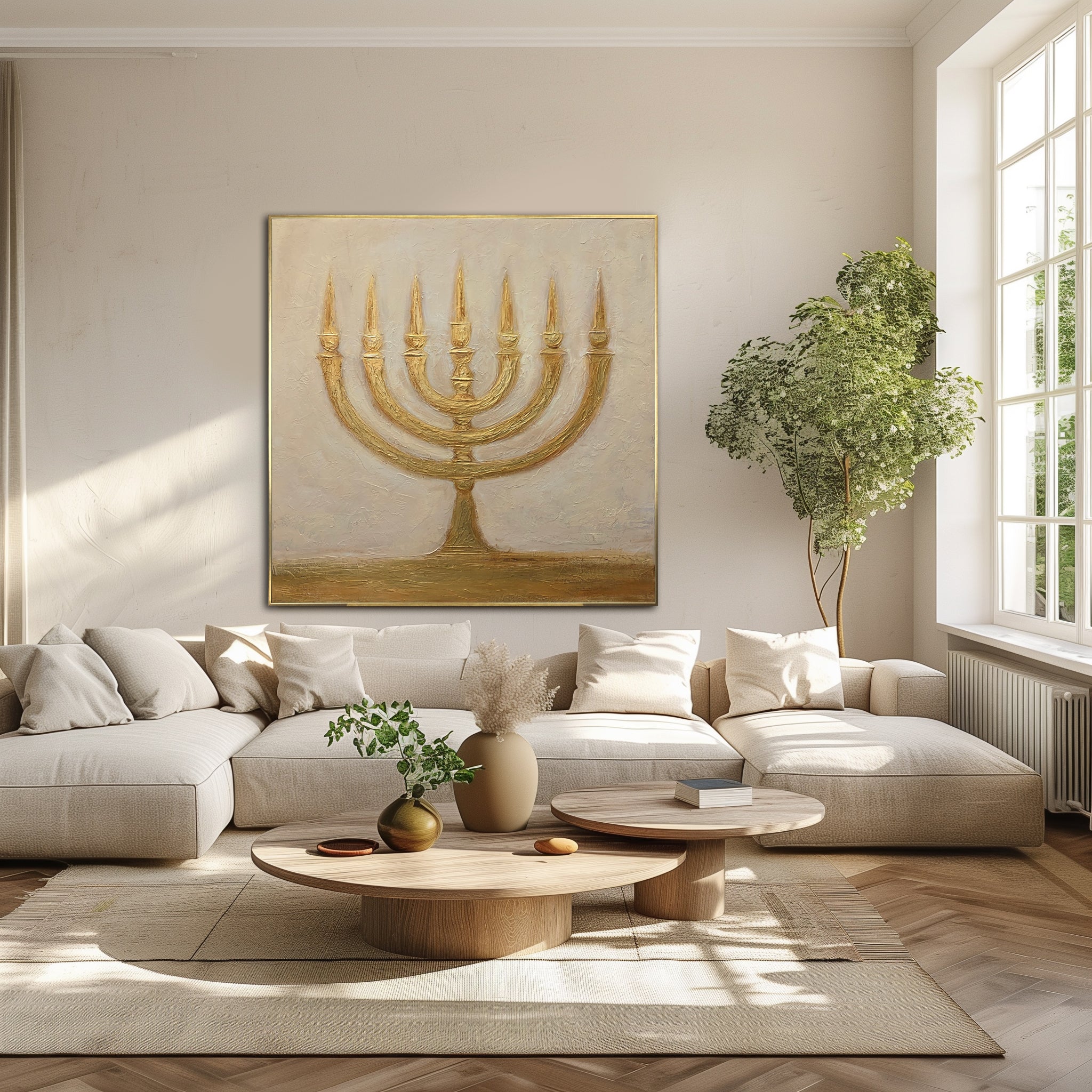 This handmade textured Menorah painting brings elegant symbolism and warm gold tones to your living room or entryway. A unique Jewish art piece for modern homes — order yours today!
