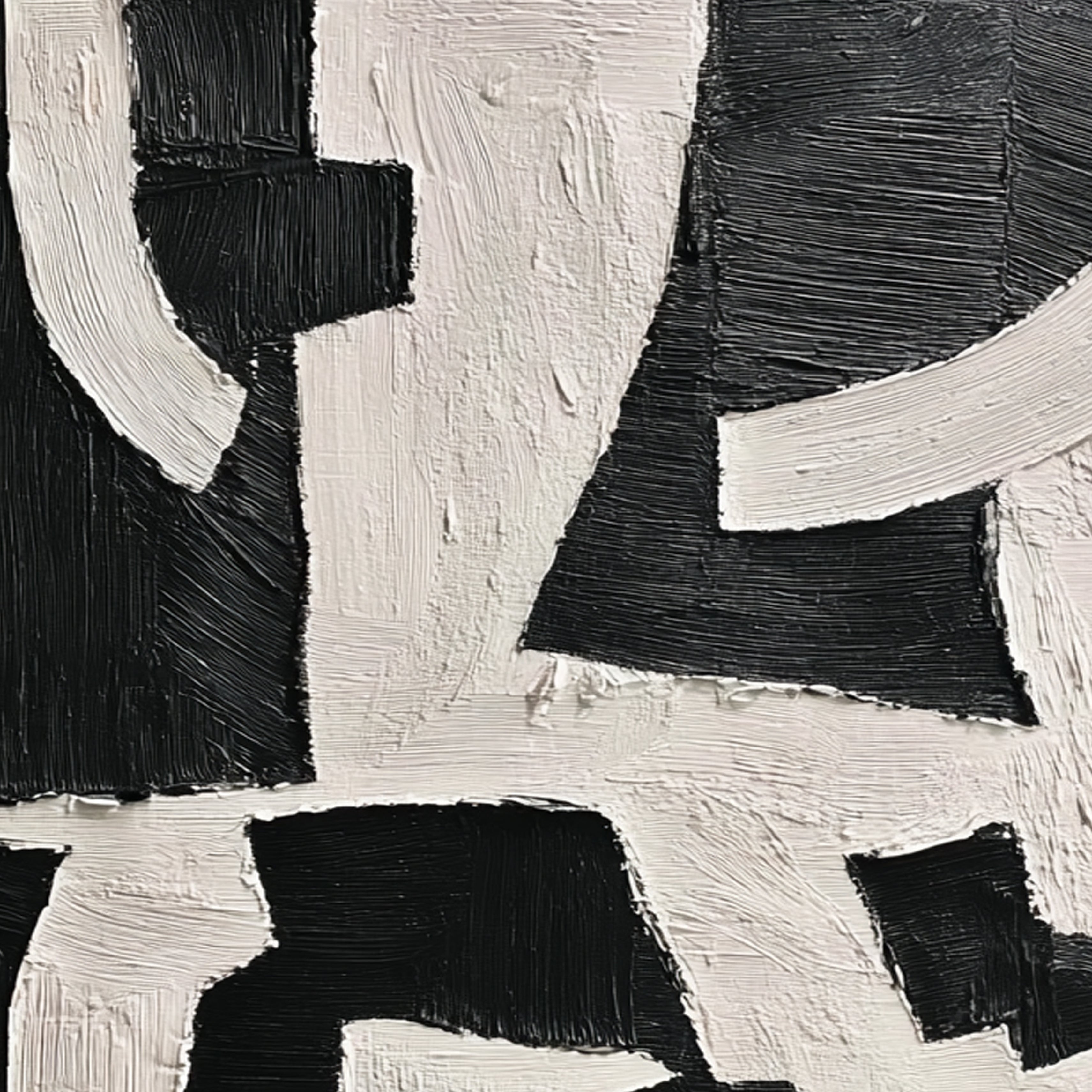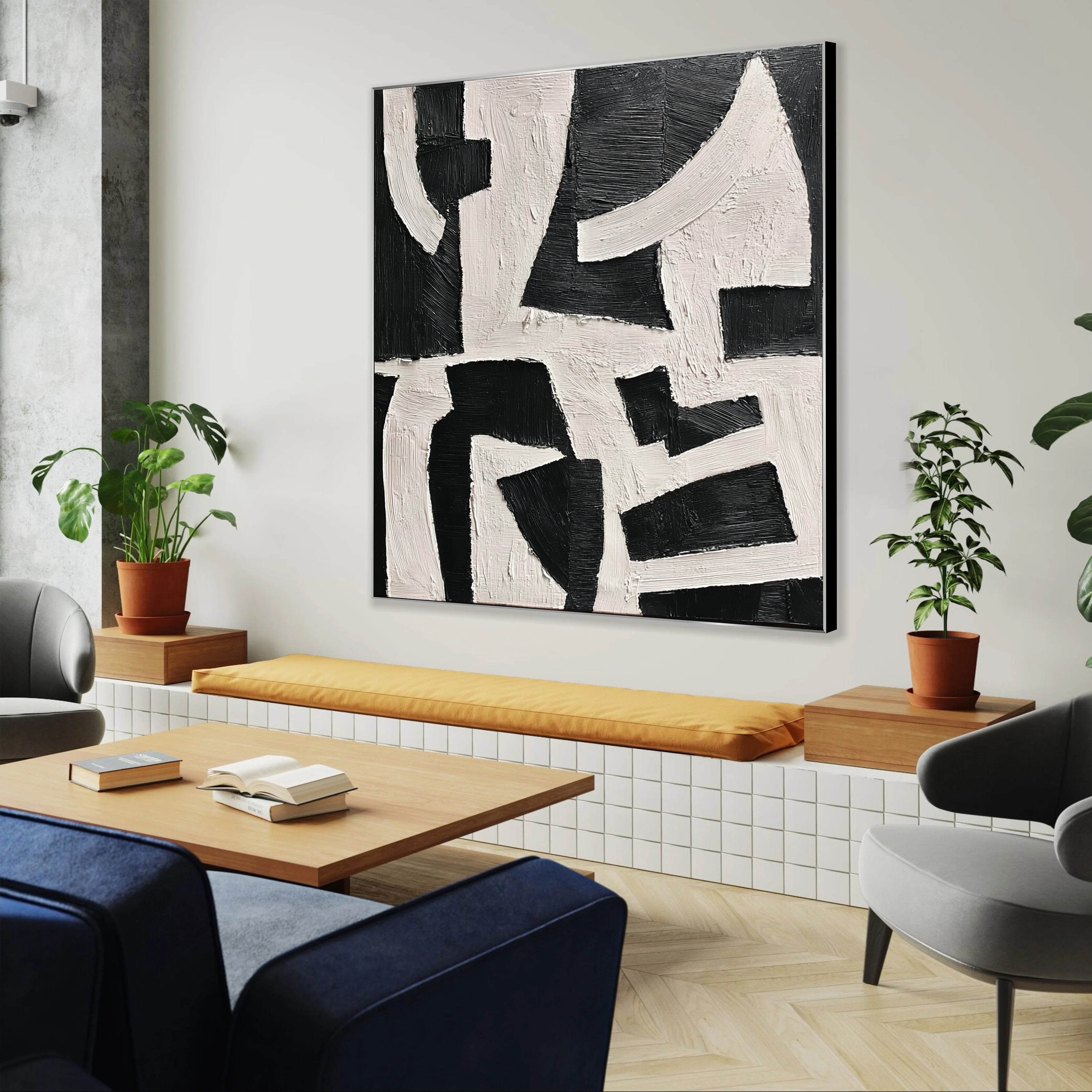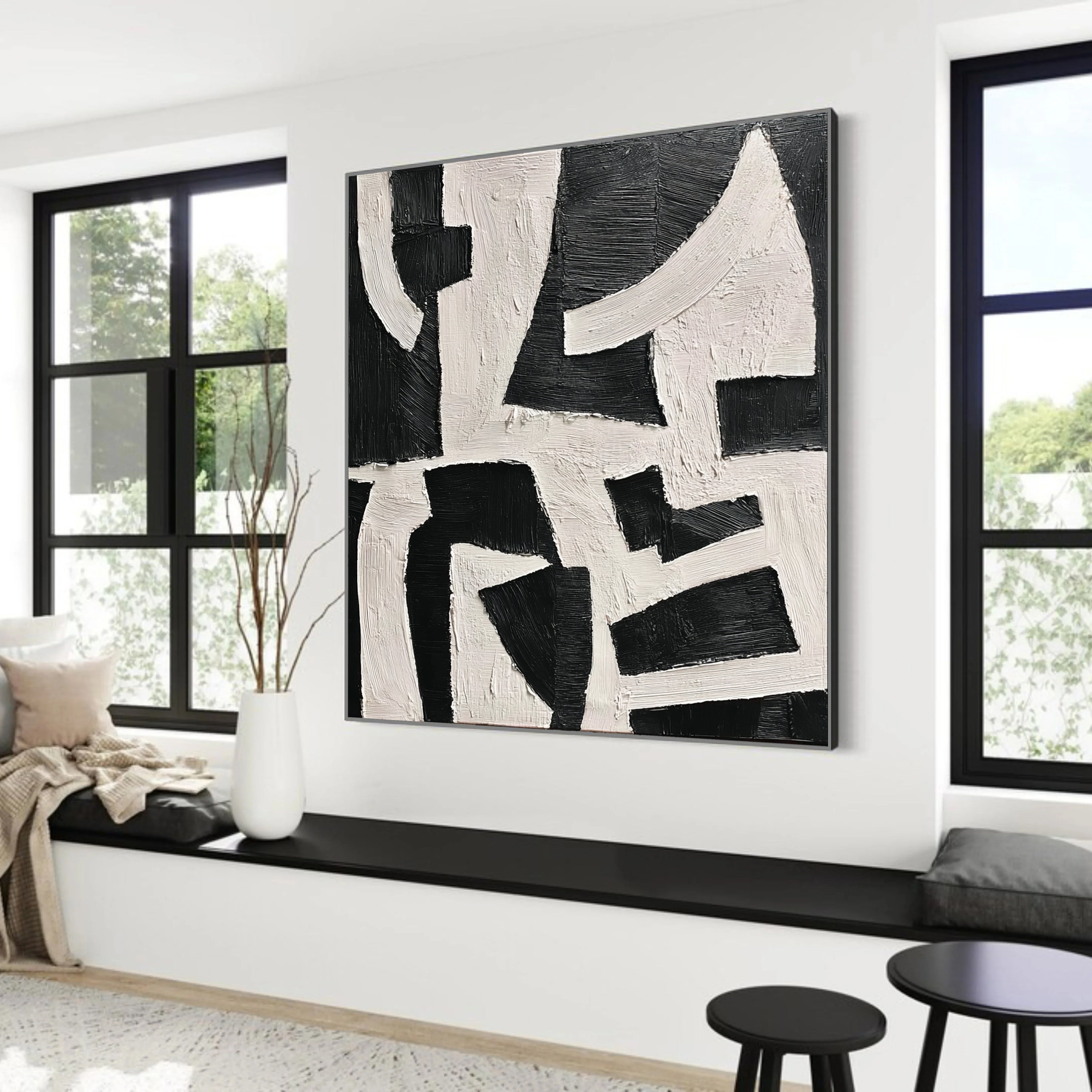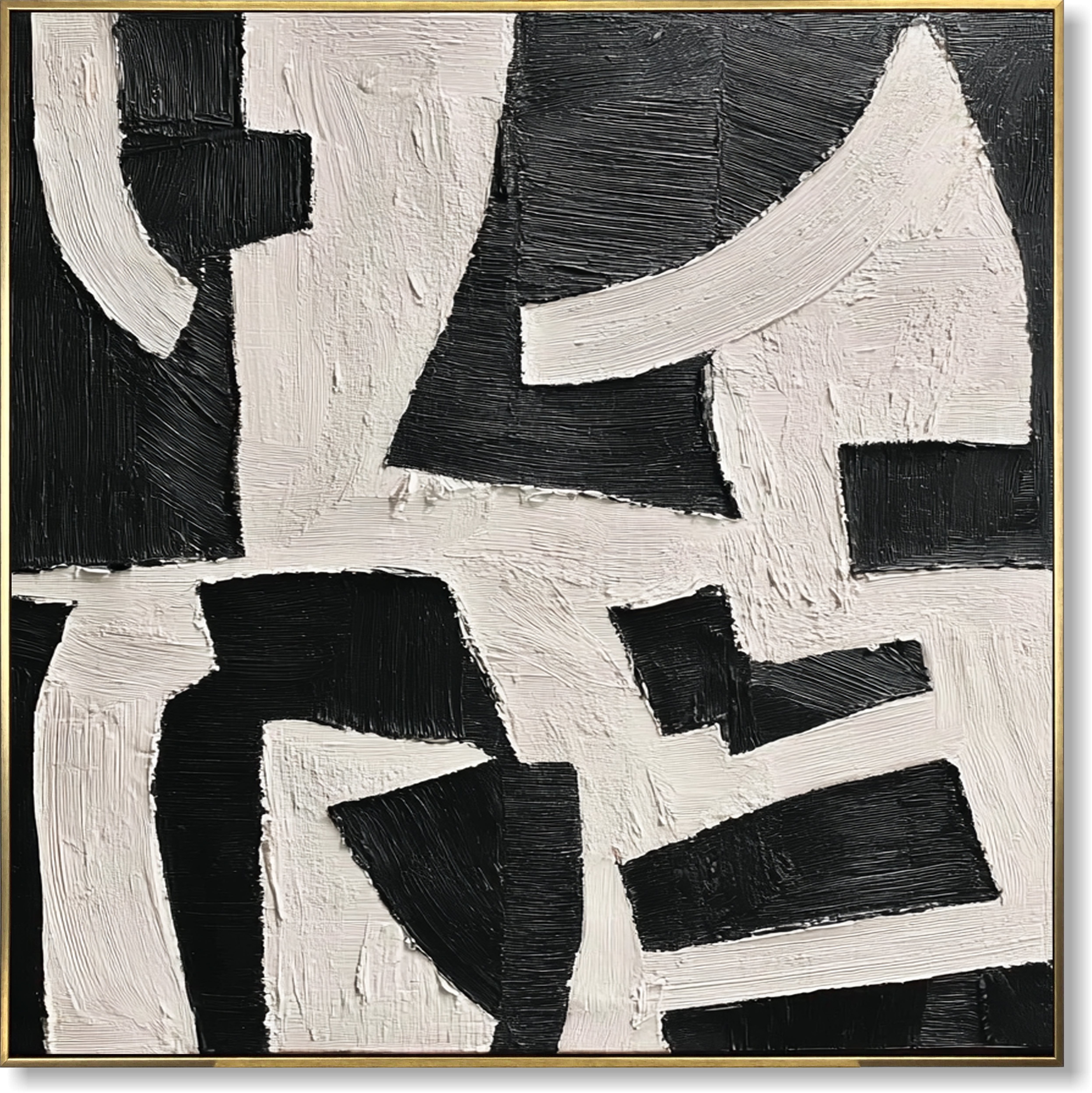 Make a bold yet sophisticated statement with this black and white geometric abstract painting. Rich texture and sharp minimalist forms give this canvas a commanding presence, perfect for contemporary interiors, office spaces, and modern homes. The neutral palette makes it easy to style, while the expressive strokes and high contrast create visual impact. Ideal for lovers of abstract, mid-century, and minimalist décor. Elevate your walls with timeless structure.